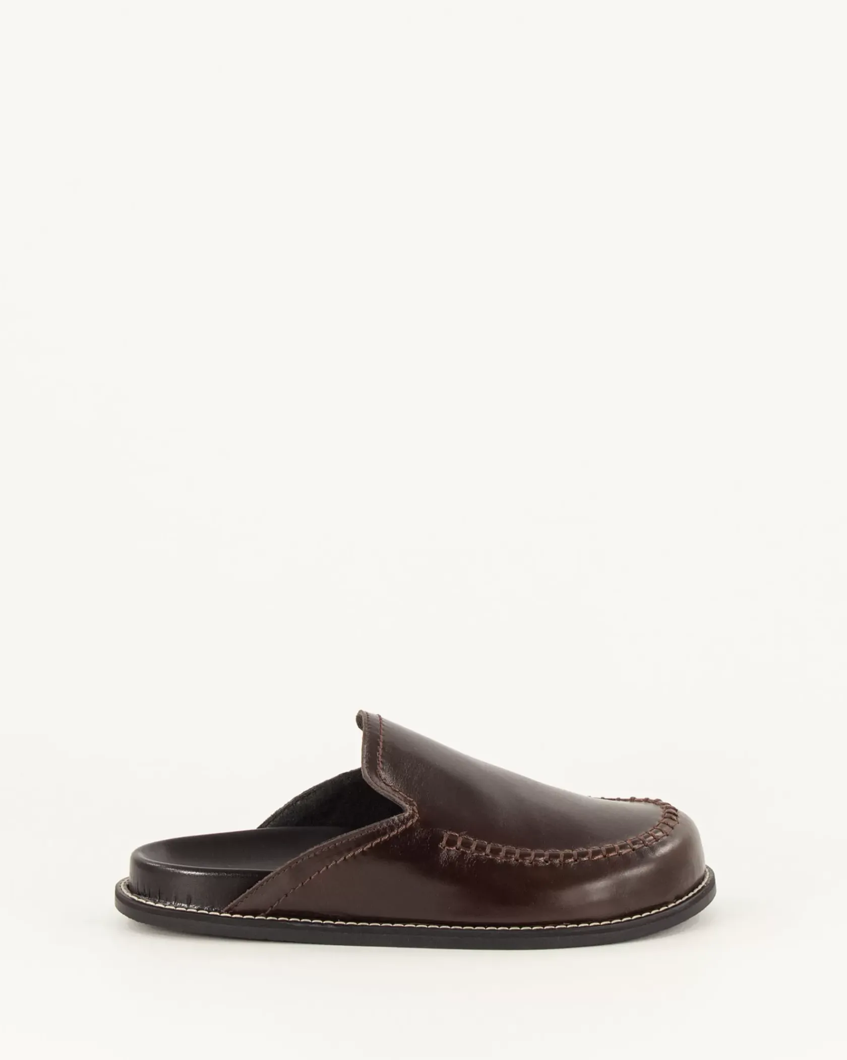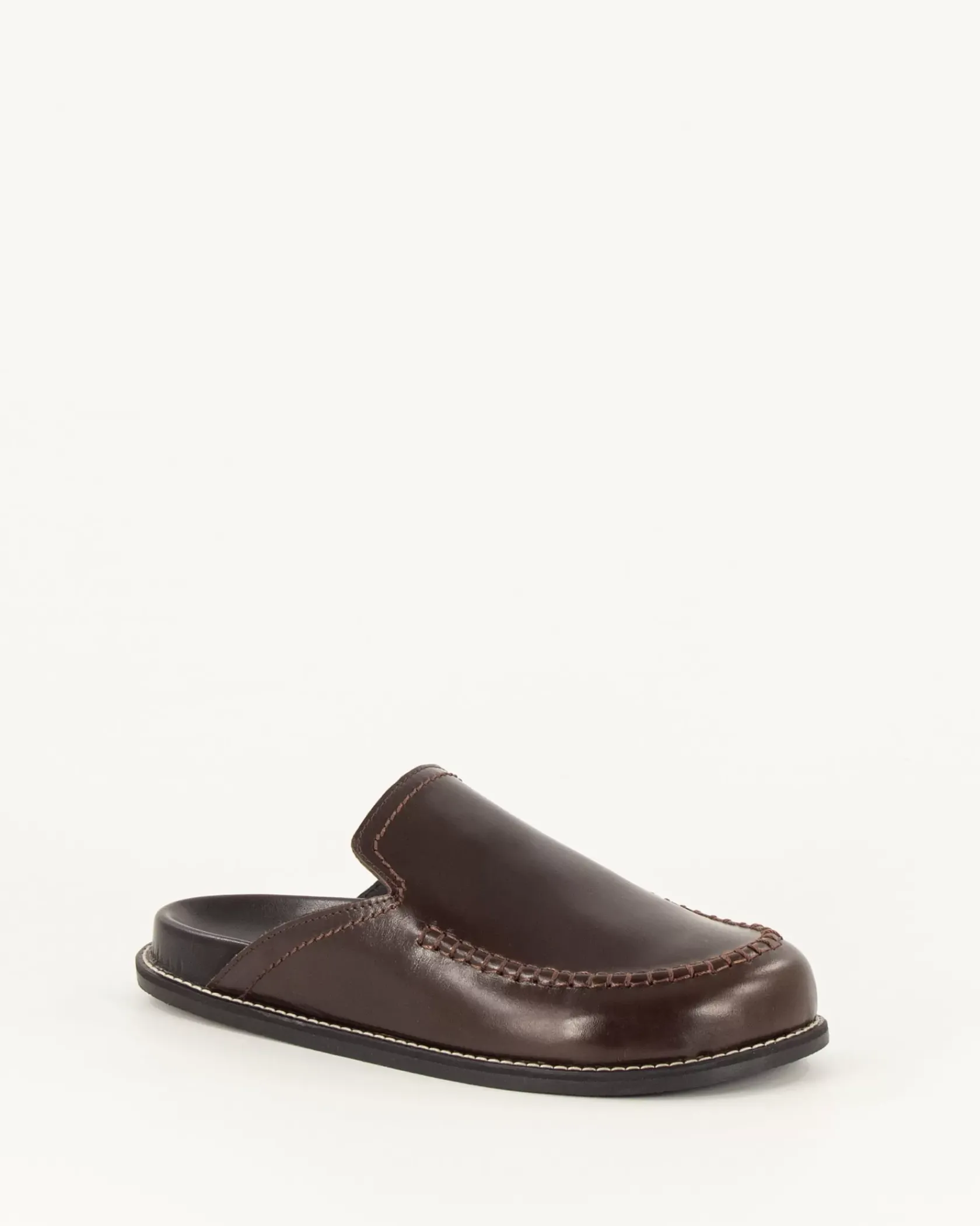 Sabots plats en cuir de vache, surpiqûres ton sur ton en détail, confectionnées au Portugal.
