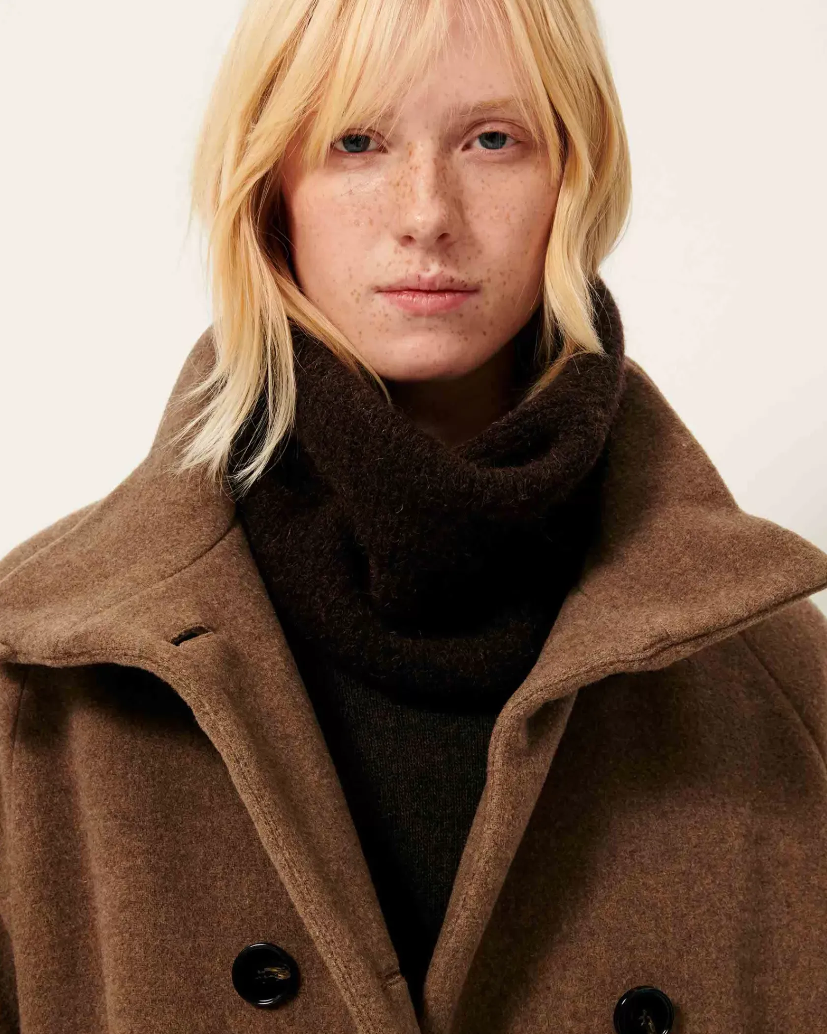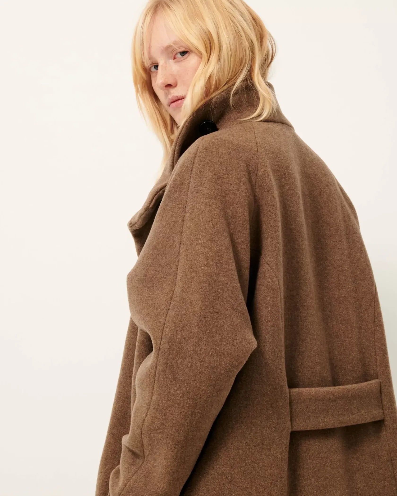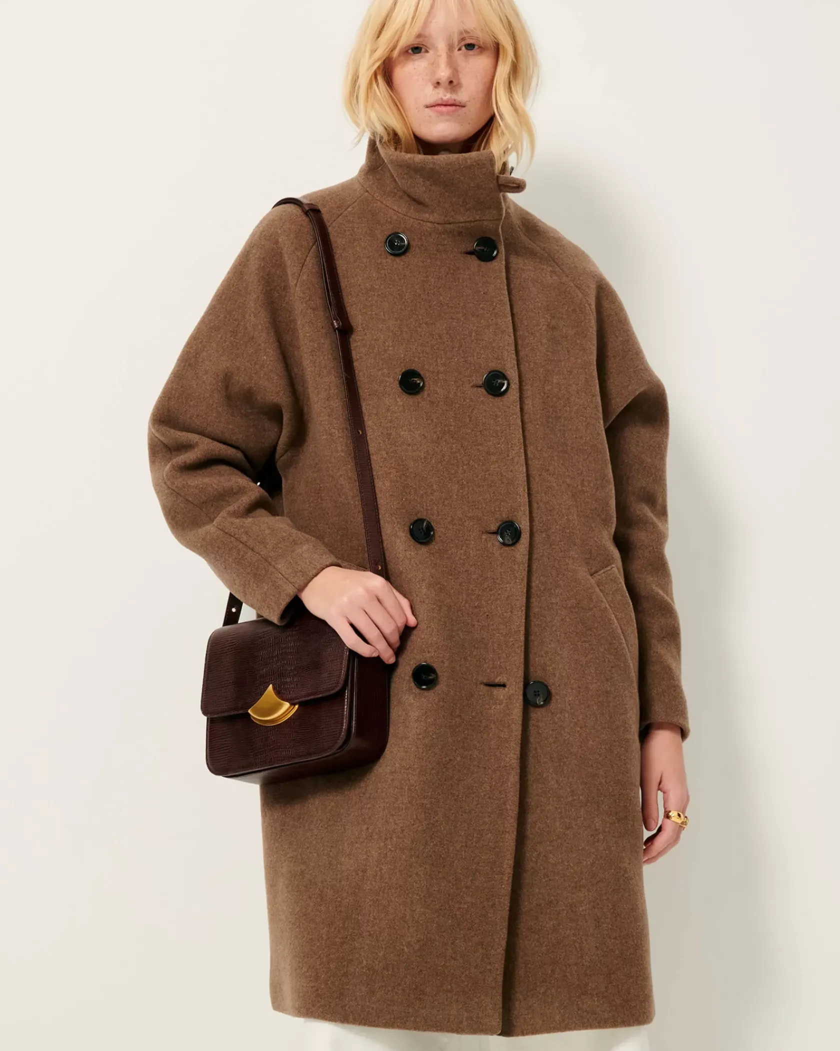 Manteau mi-long à col montant et double boutonnage en double tissage melton finition velvet tissé en Italie.