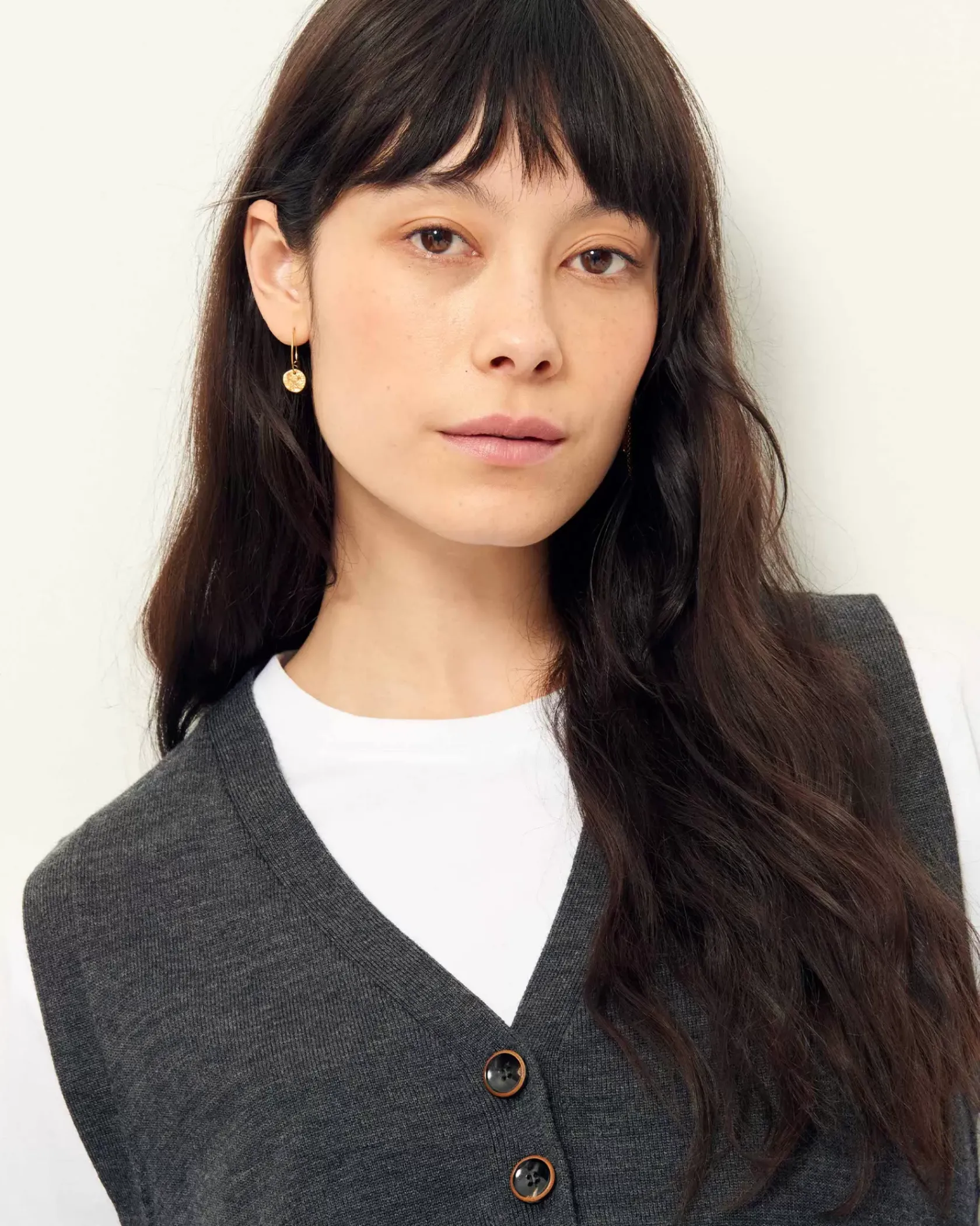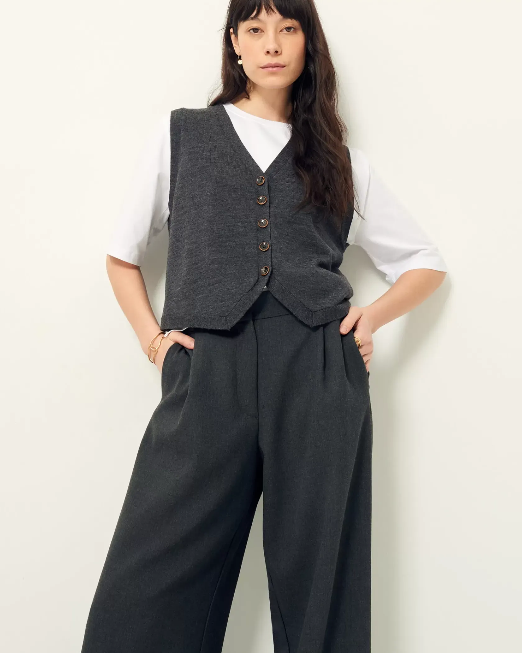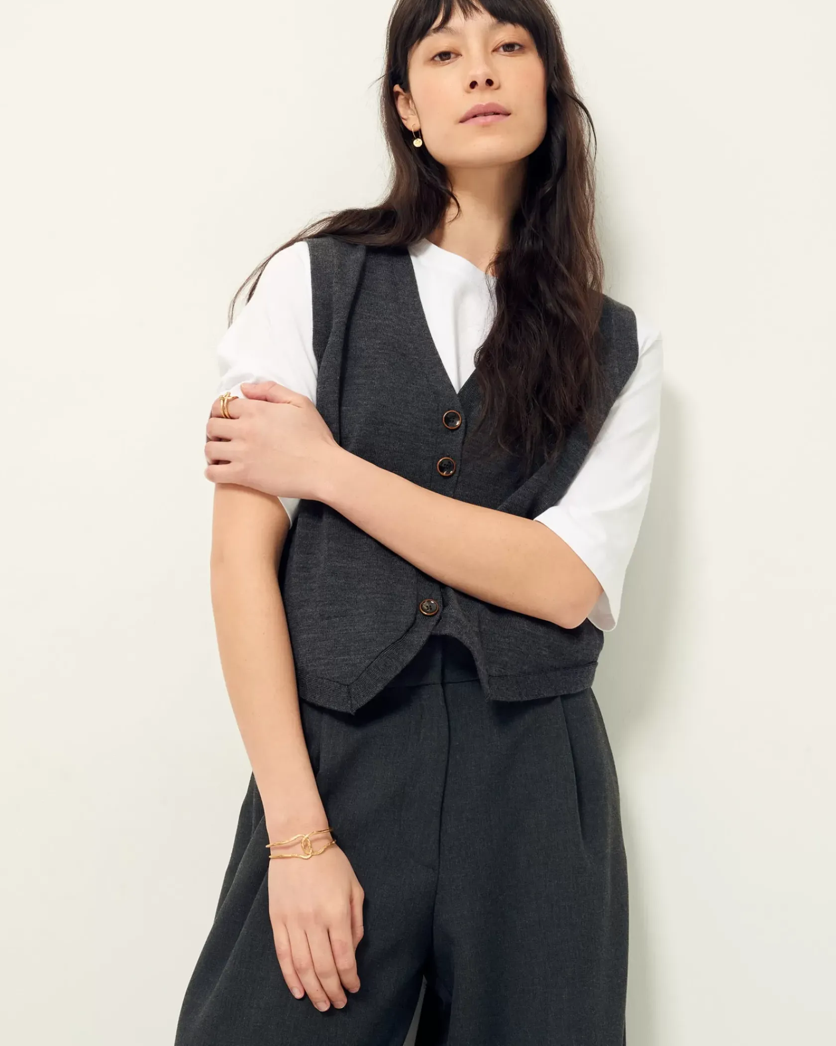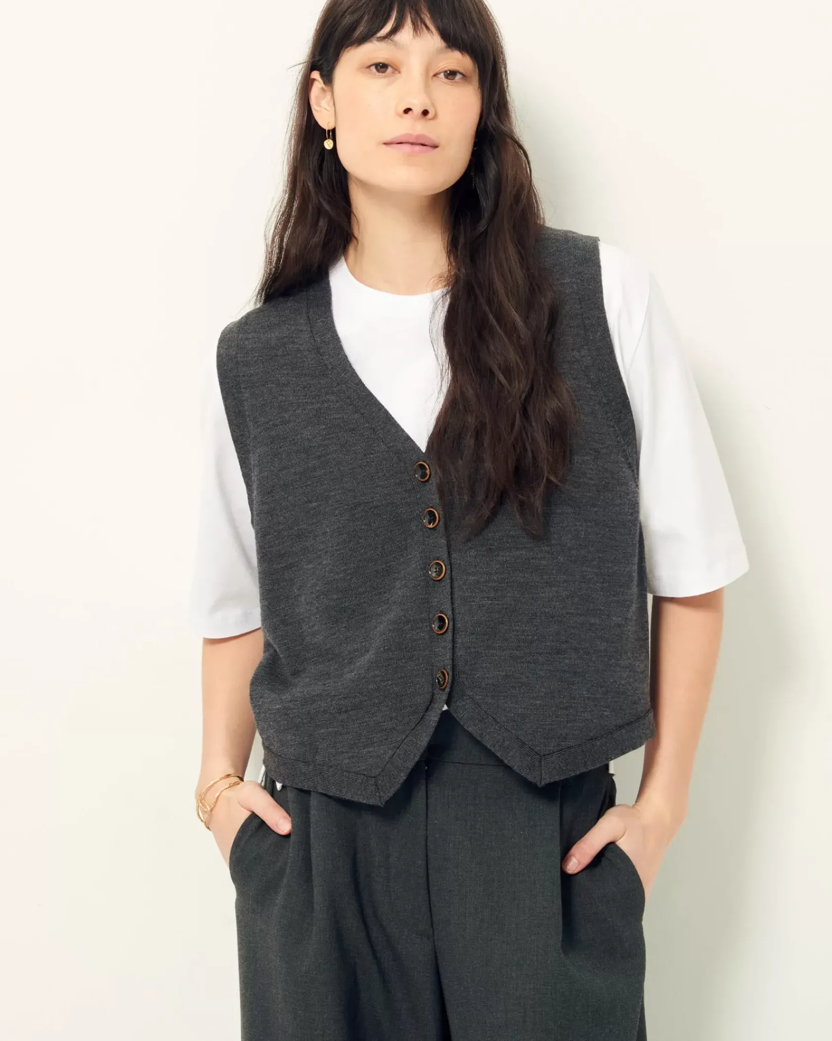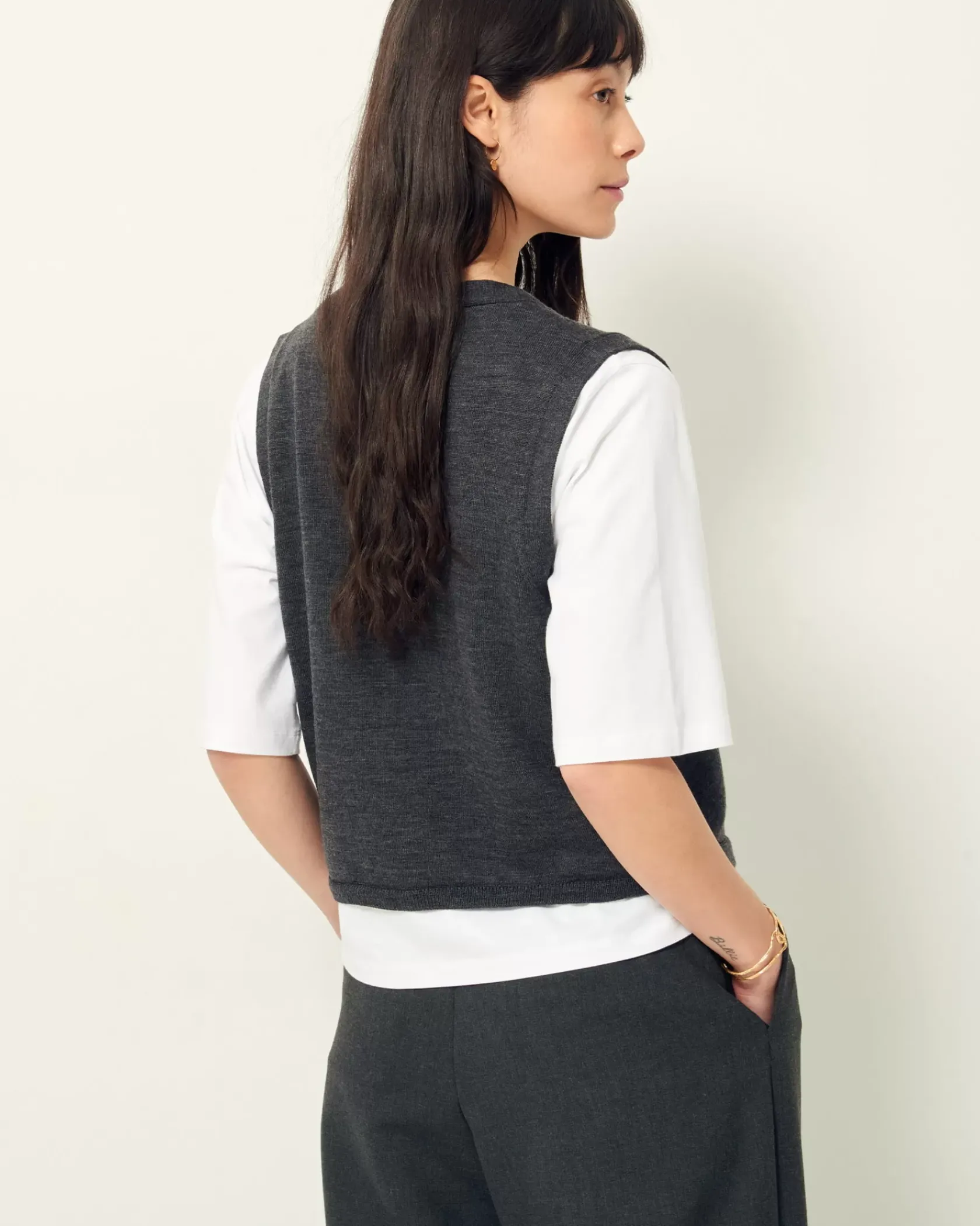 Gilet sans manches en maille fine jauge mérinos, point jersey.
