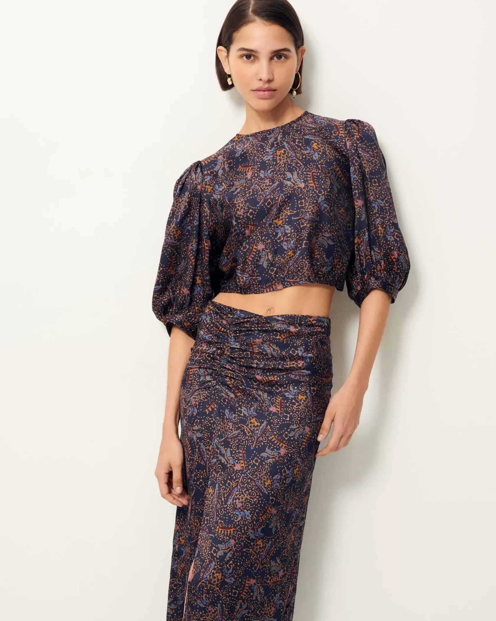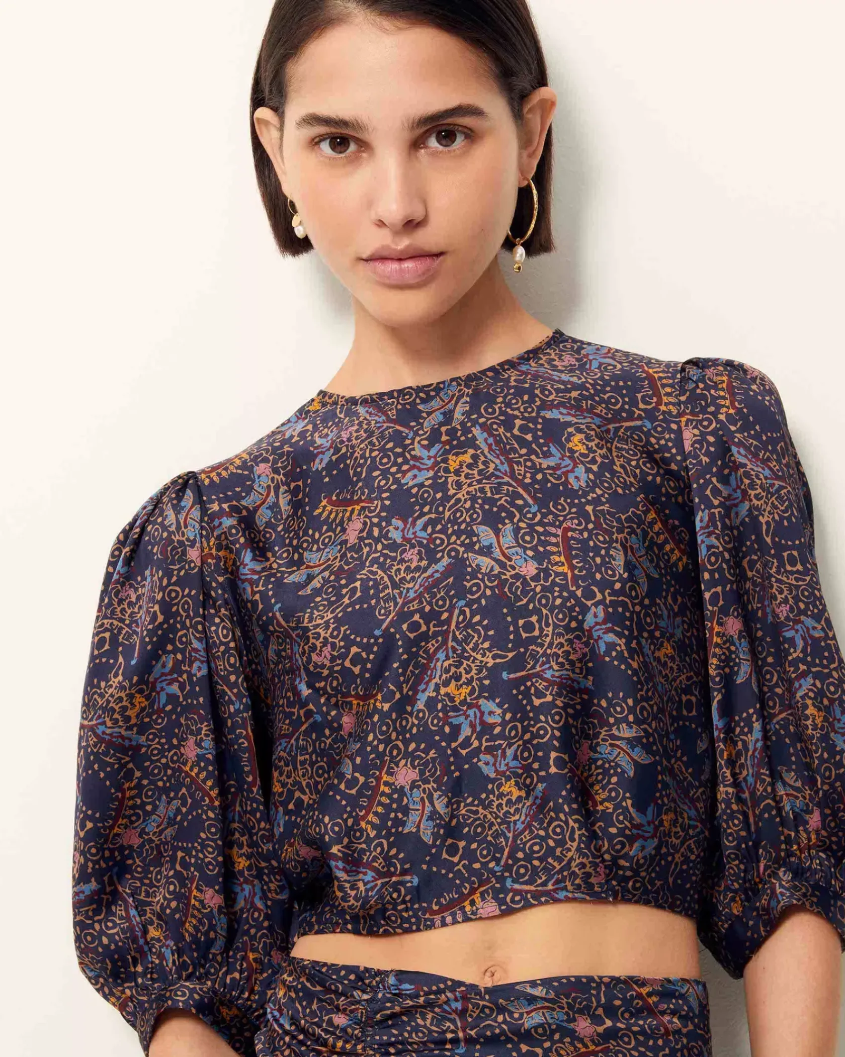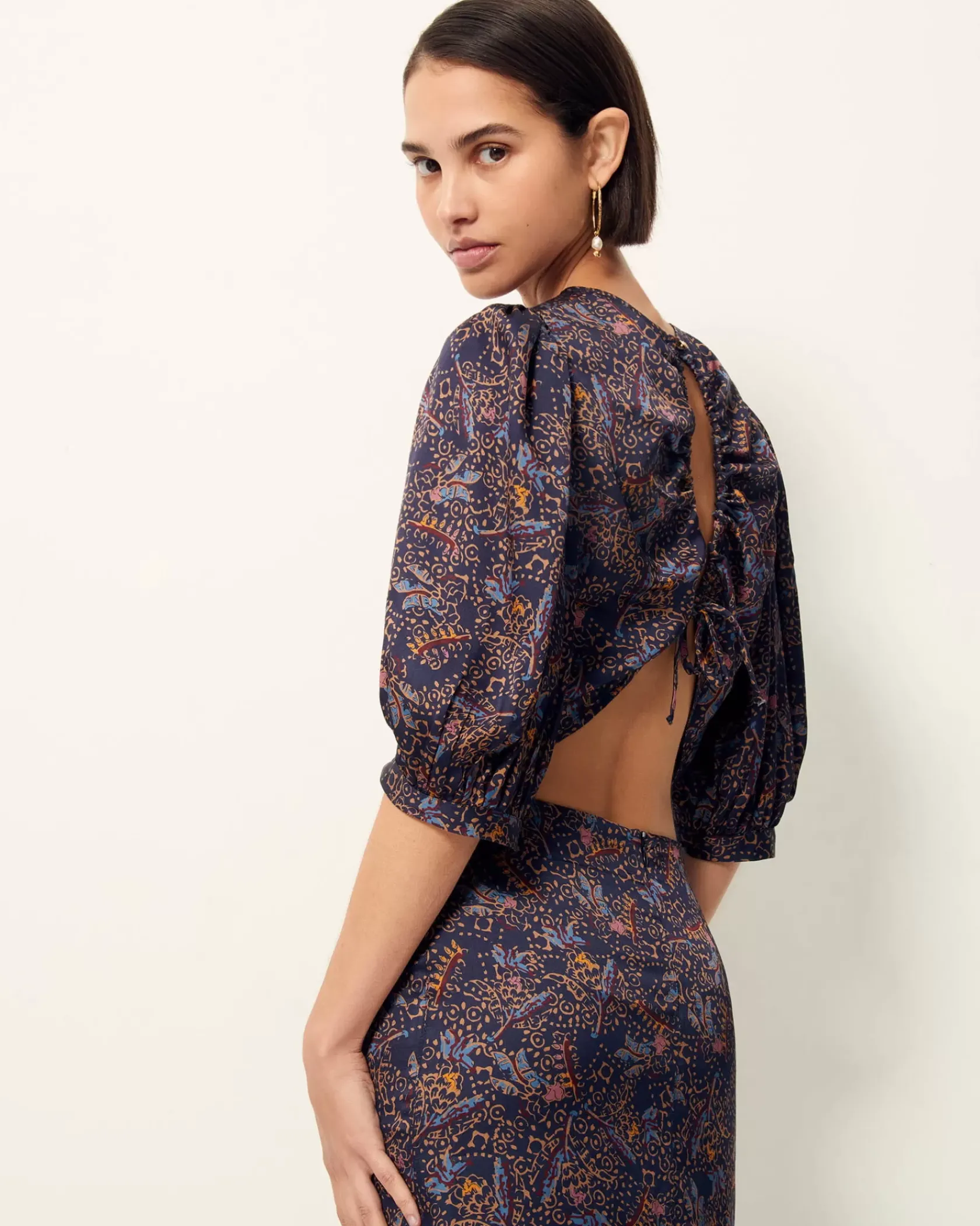 Top court dos nu à détails de liens fantaisie en satin fluide imprimé et apprêté en Italie, motif exclusif Sessùn.