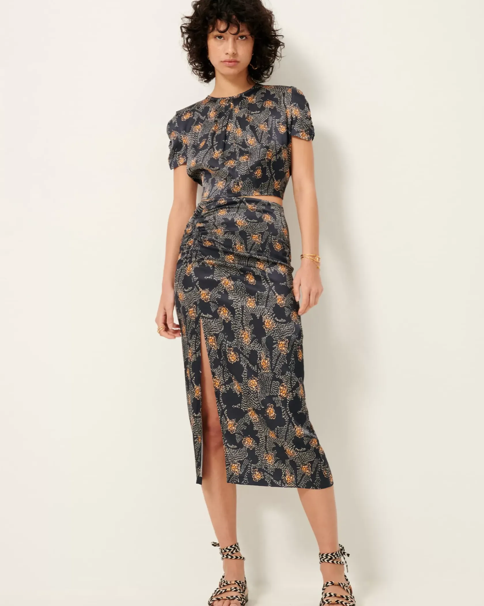 Jupe droite mi-longue fendue en satin fluide imprimé et apprêté en Italie, motif exclusif Sessùn.