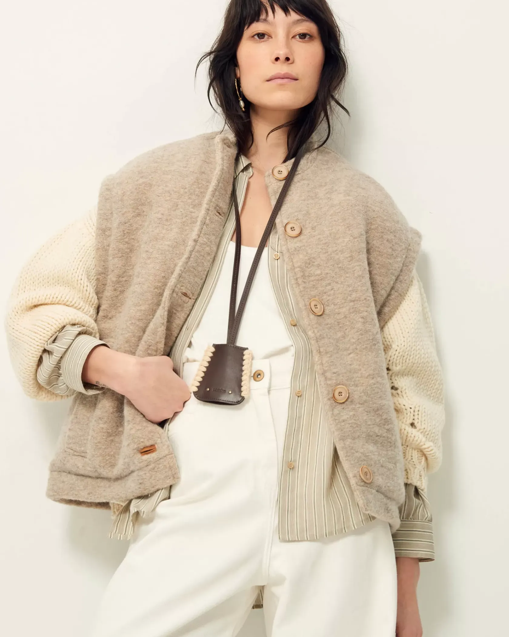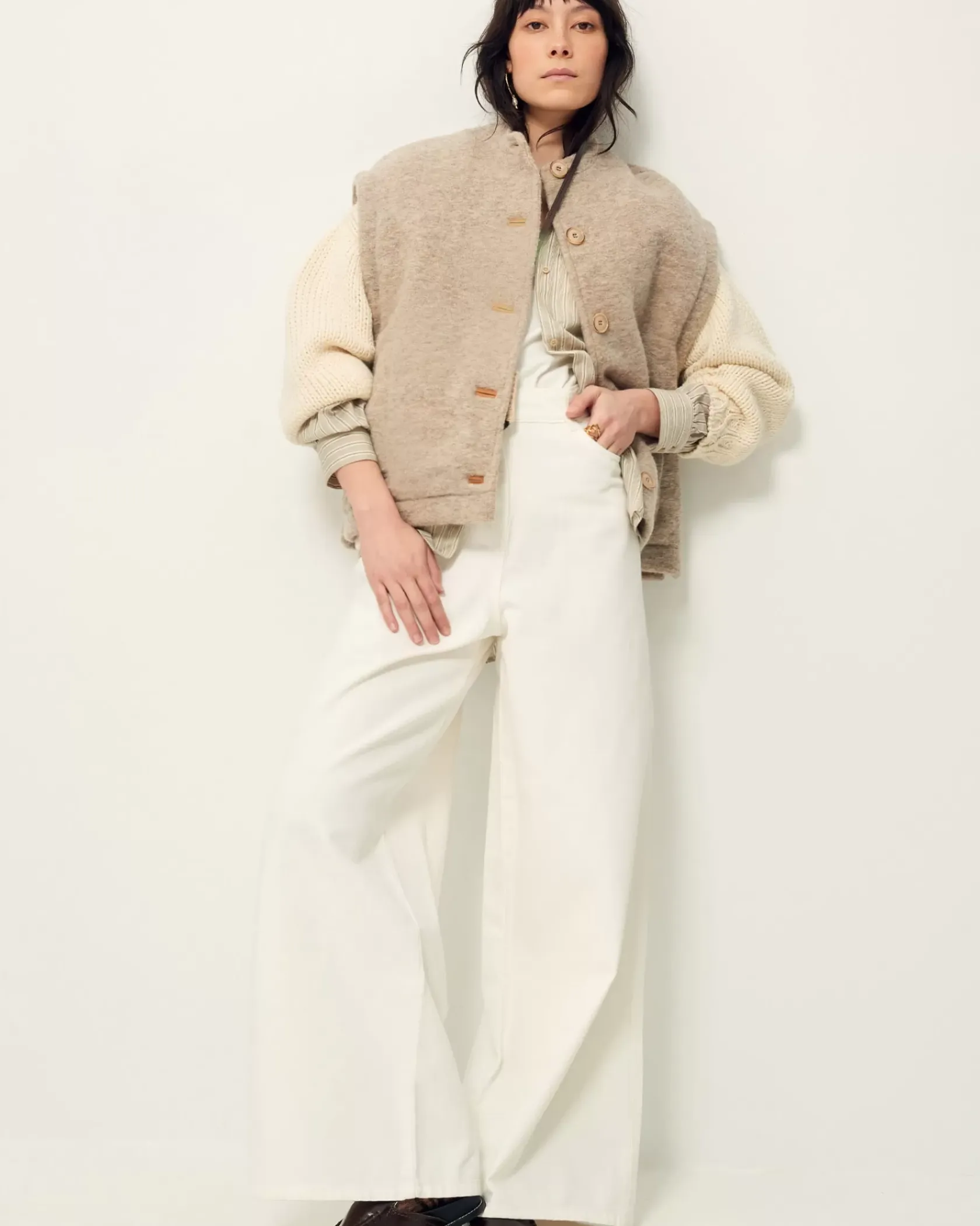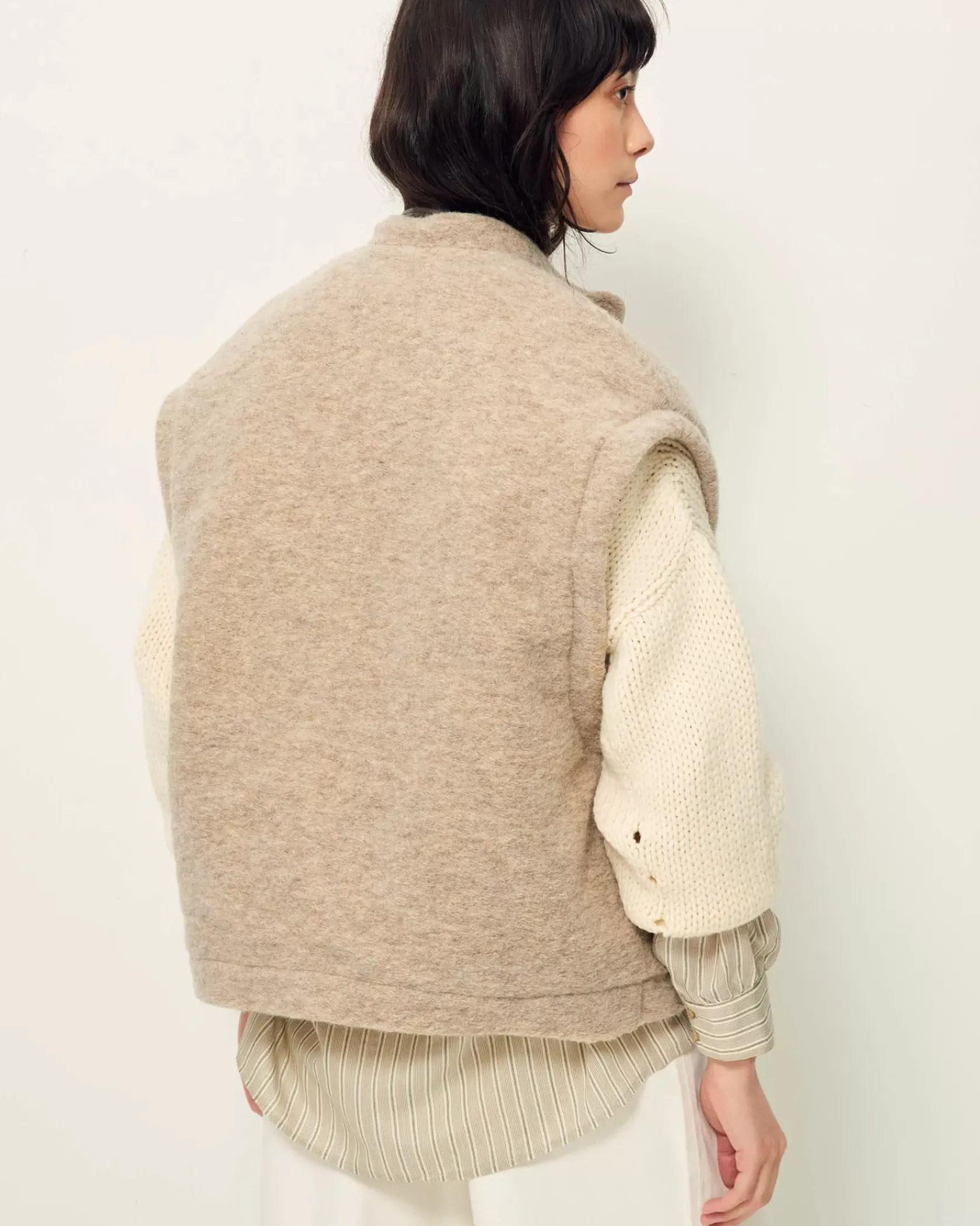 Veste sans manches à col légèrement montant en lainage loden esprit laine bouillie chiné, en armure toile.