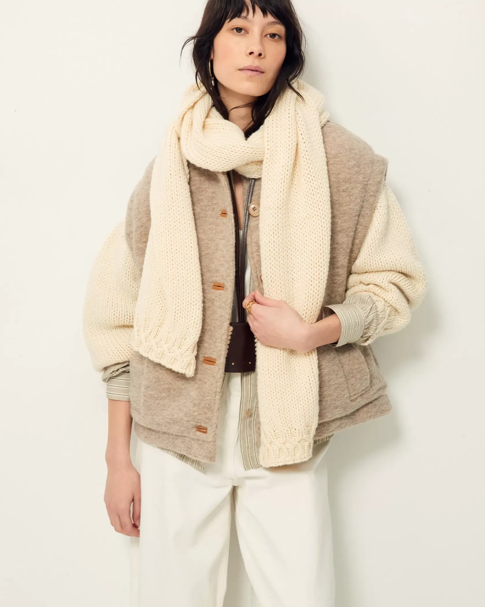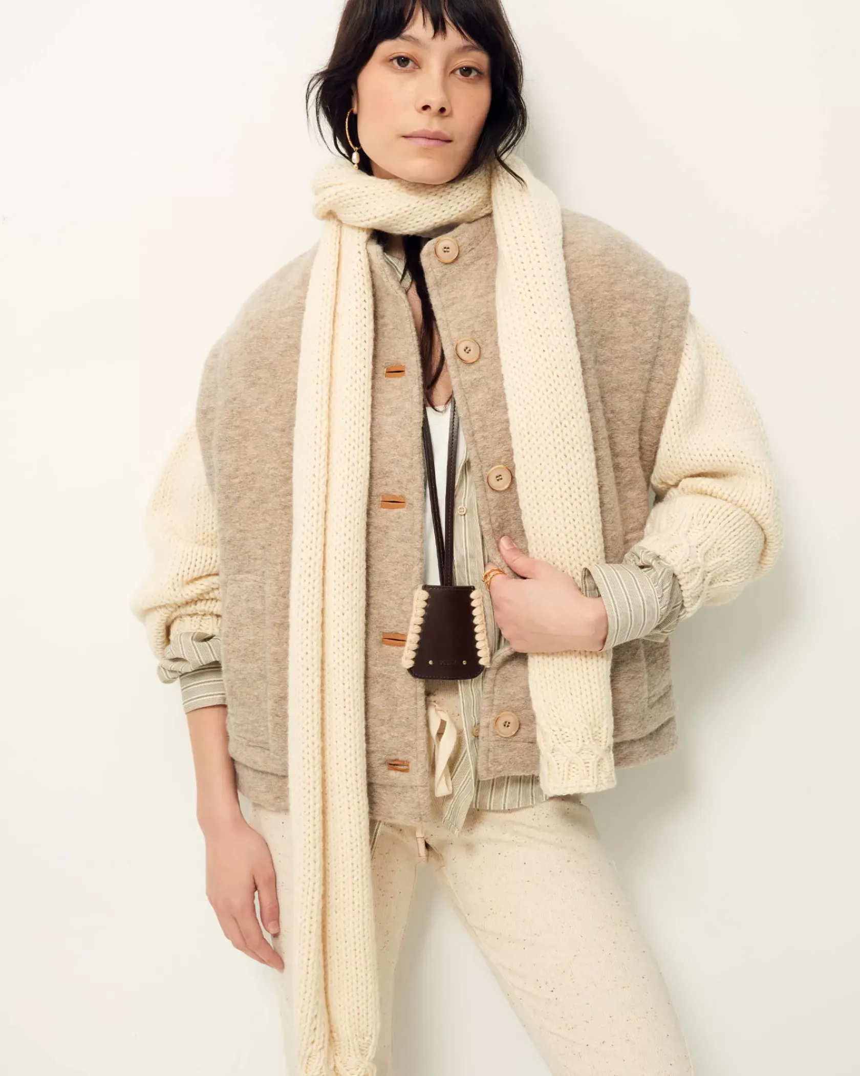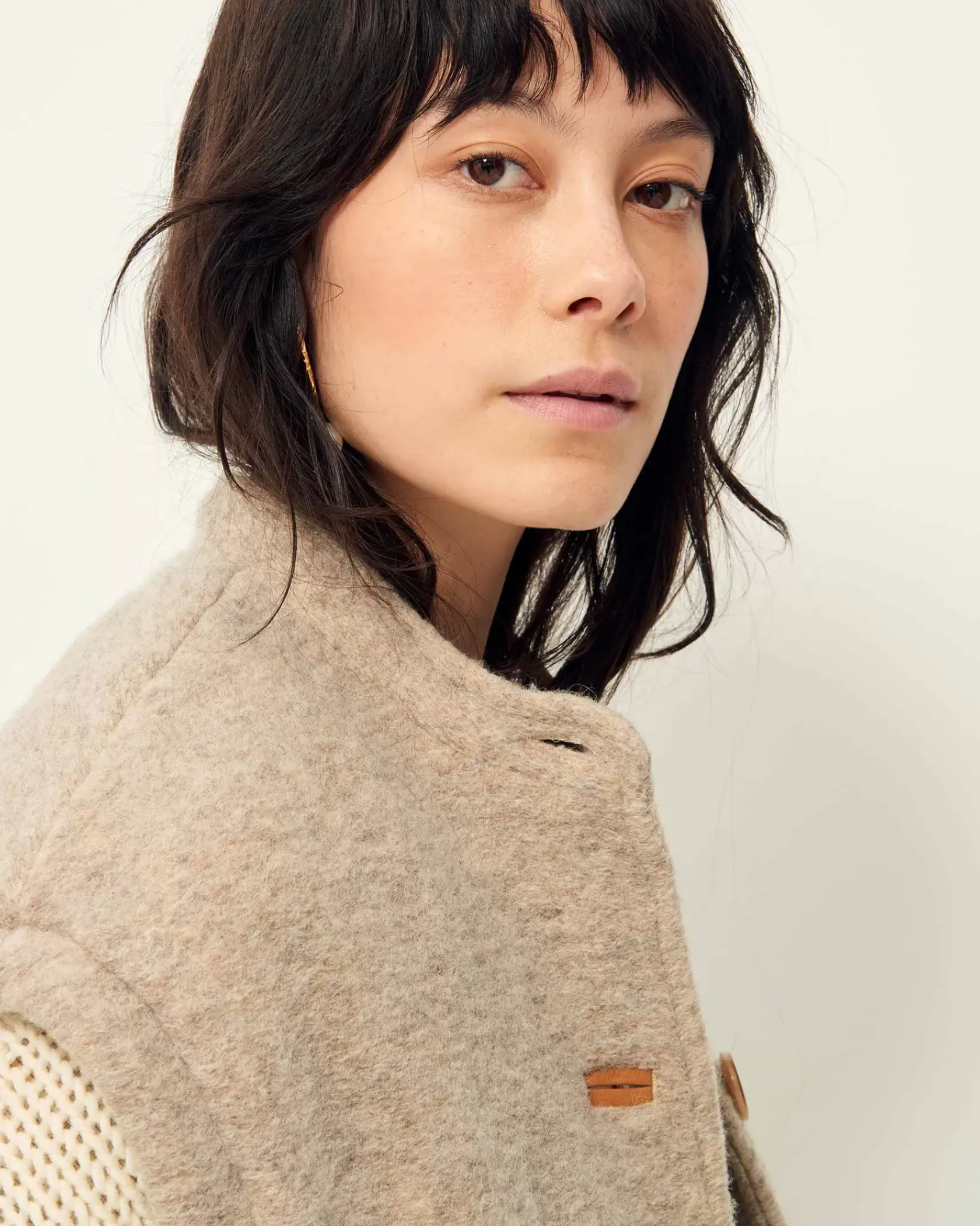 Veste sans manches à col légèrement montant en lainage loden esprit laine bouillie chiné, en armure toile.