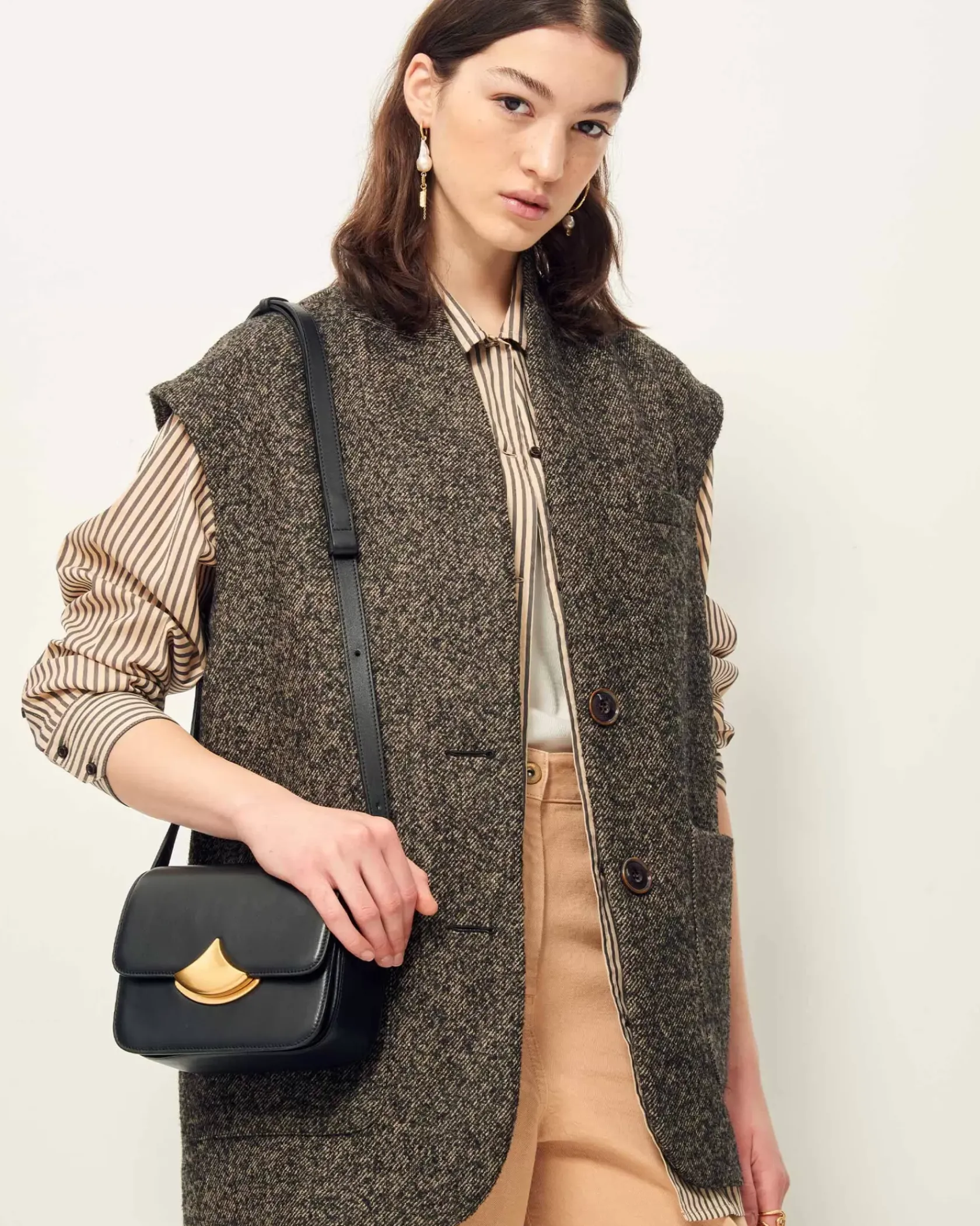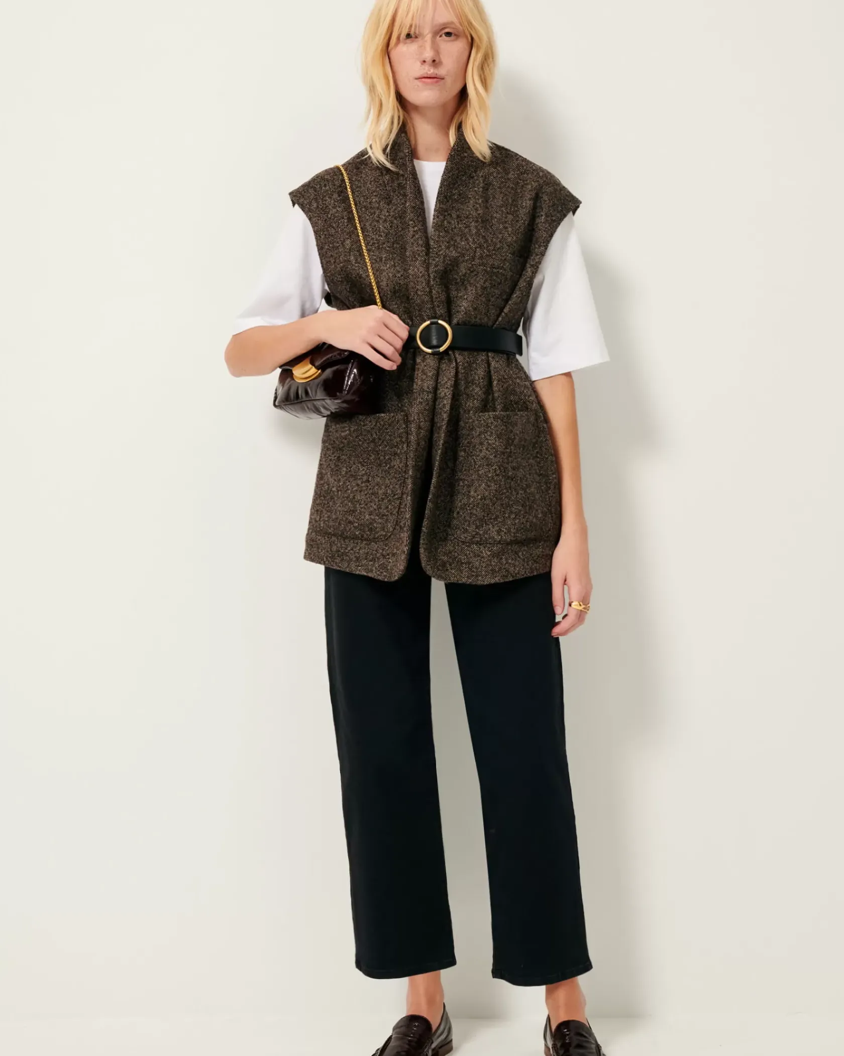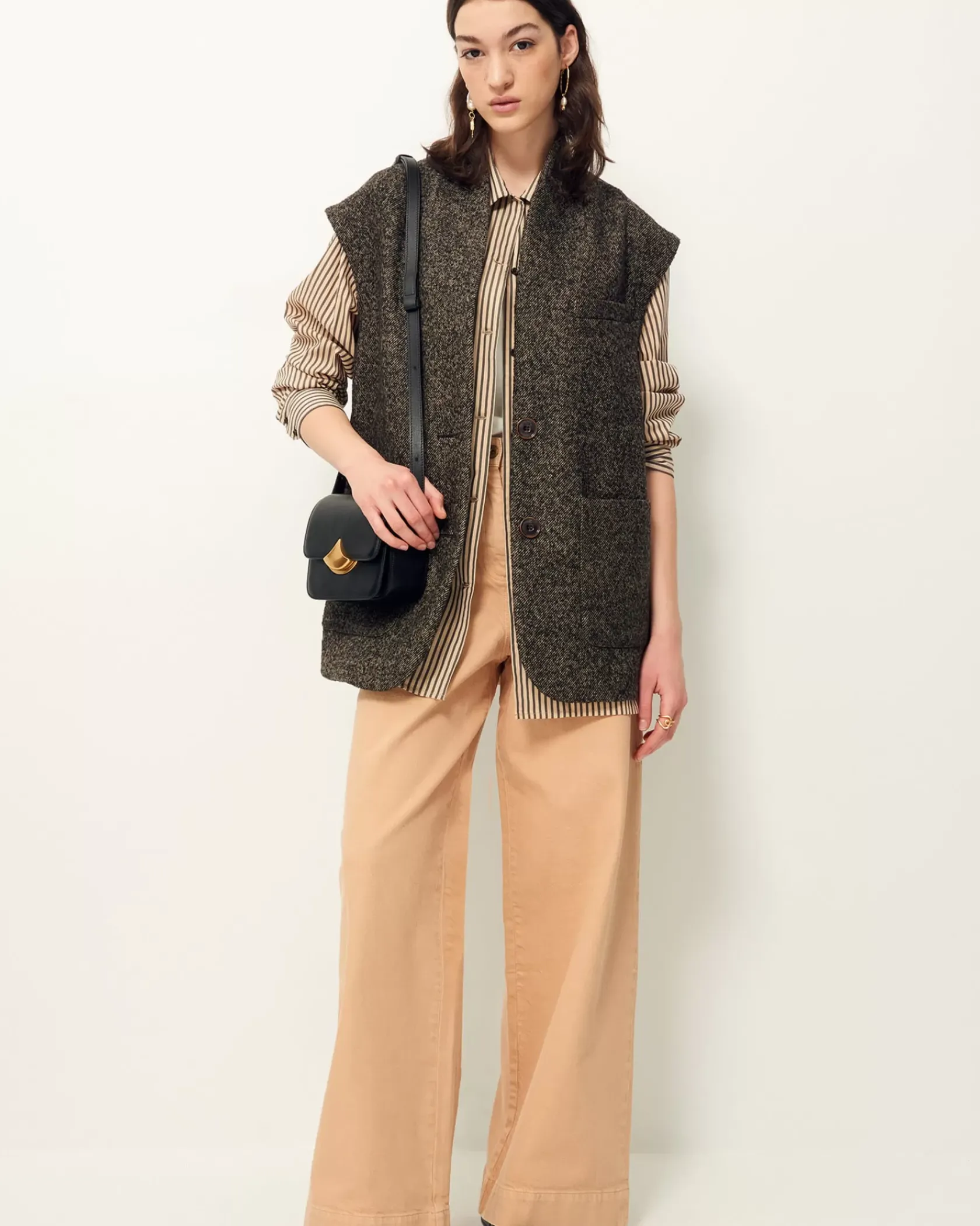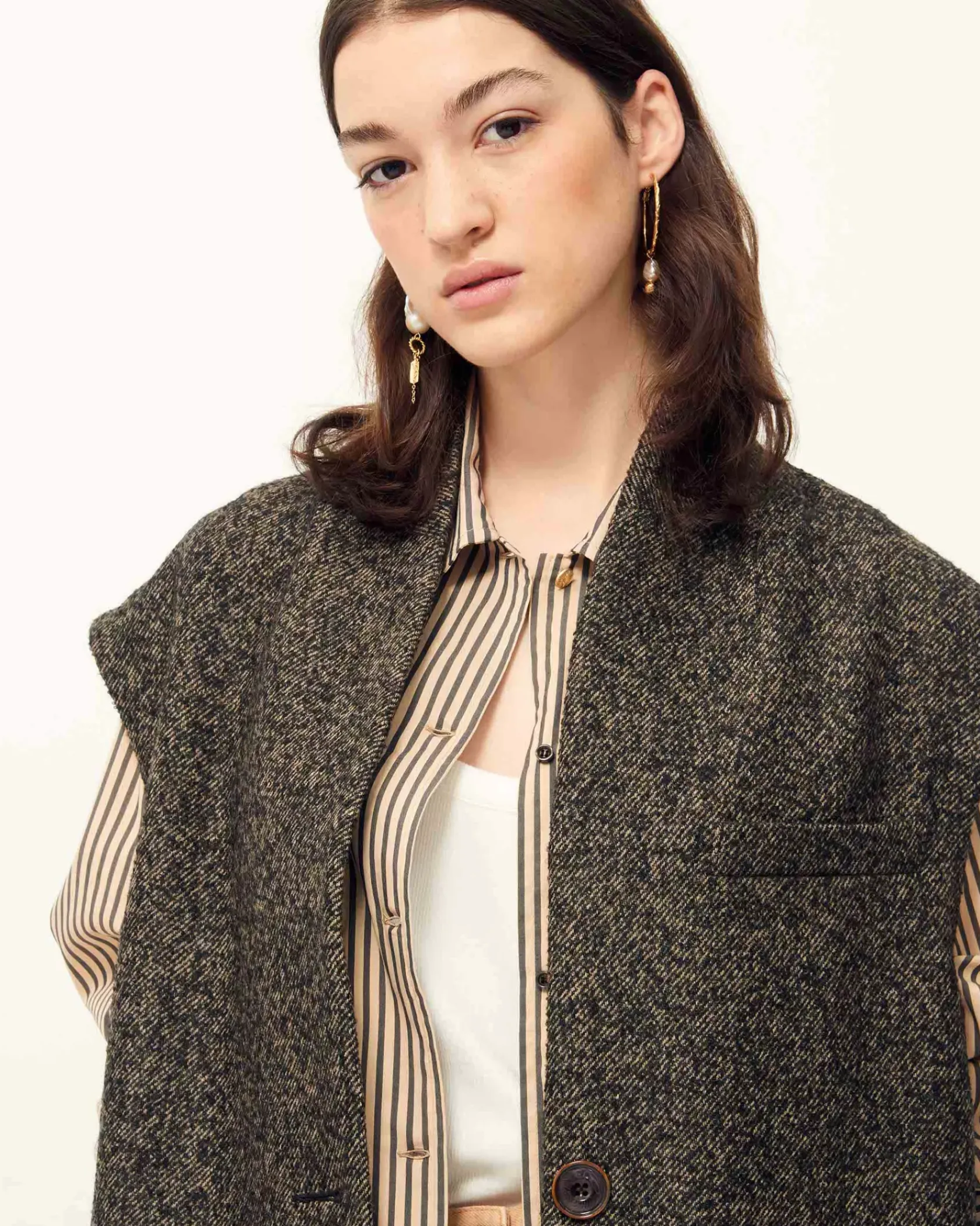 Veste de tailleur à col relevé, sans manches en tissage twill fantaisie de fils chinés tissé en Italie.