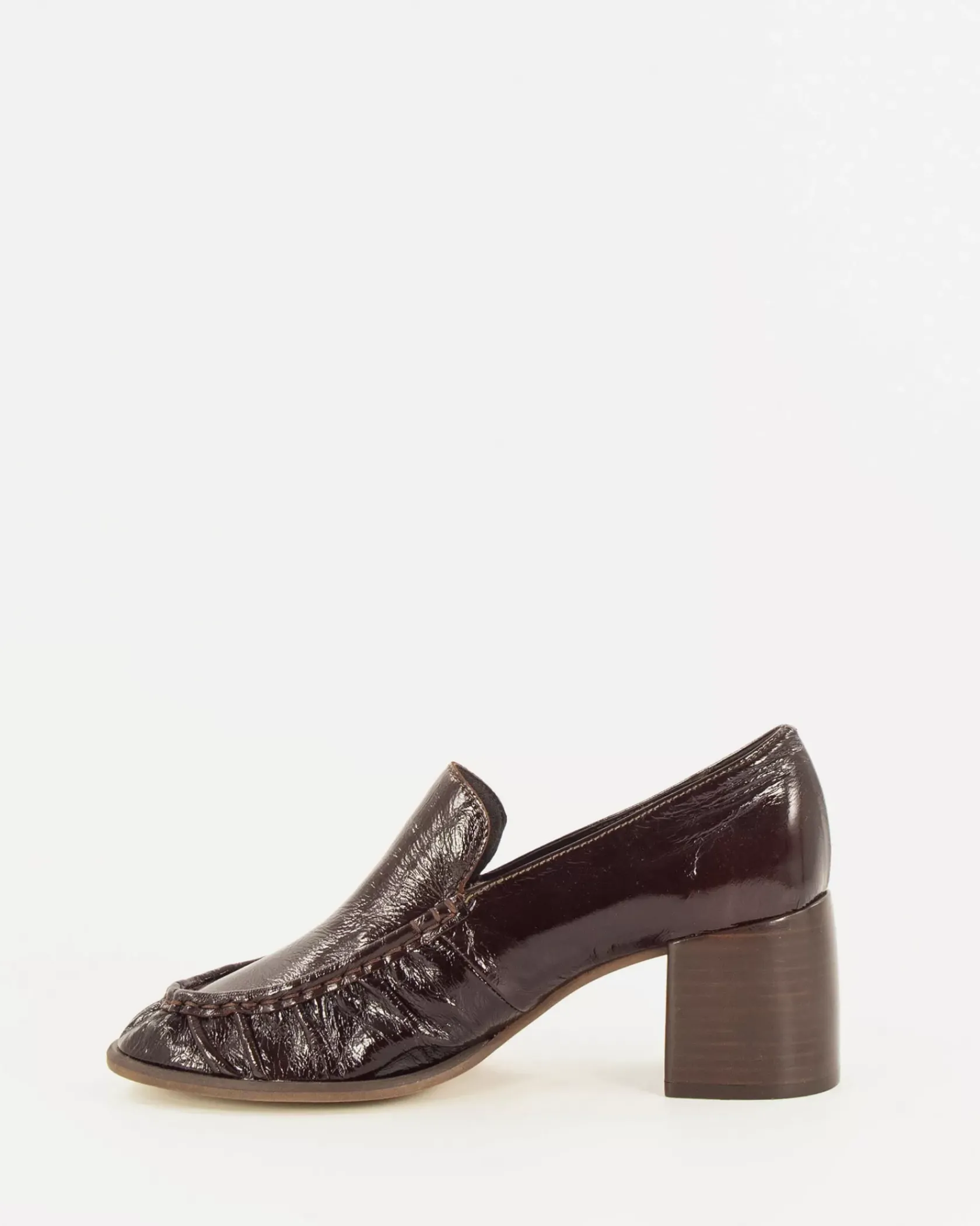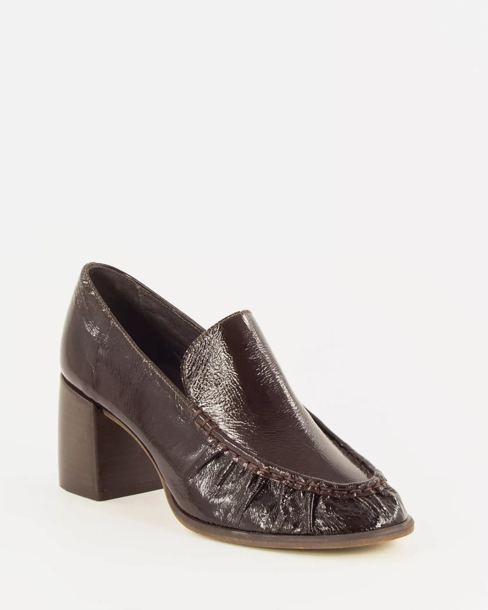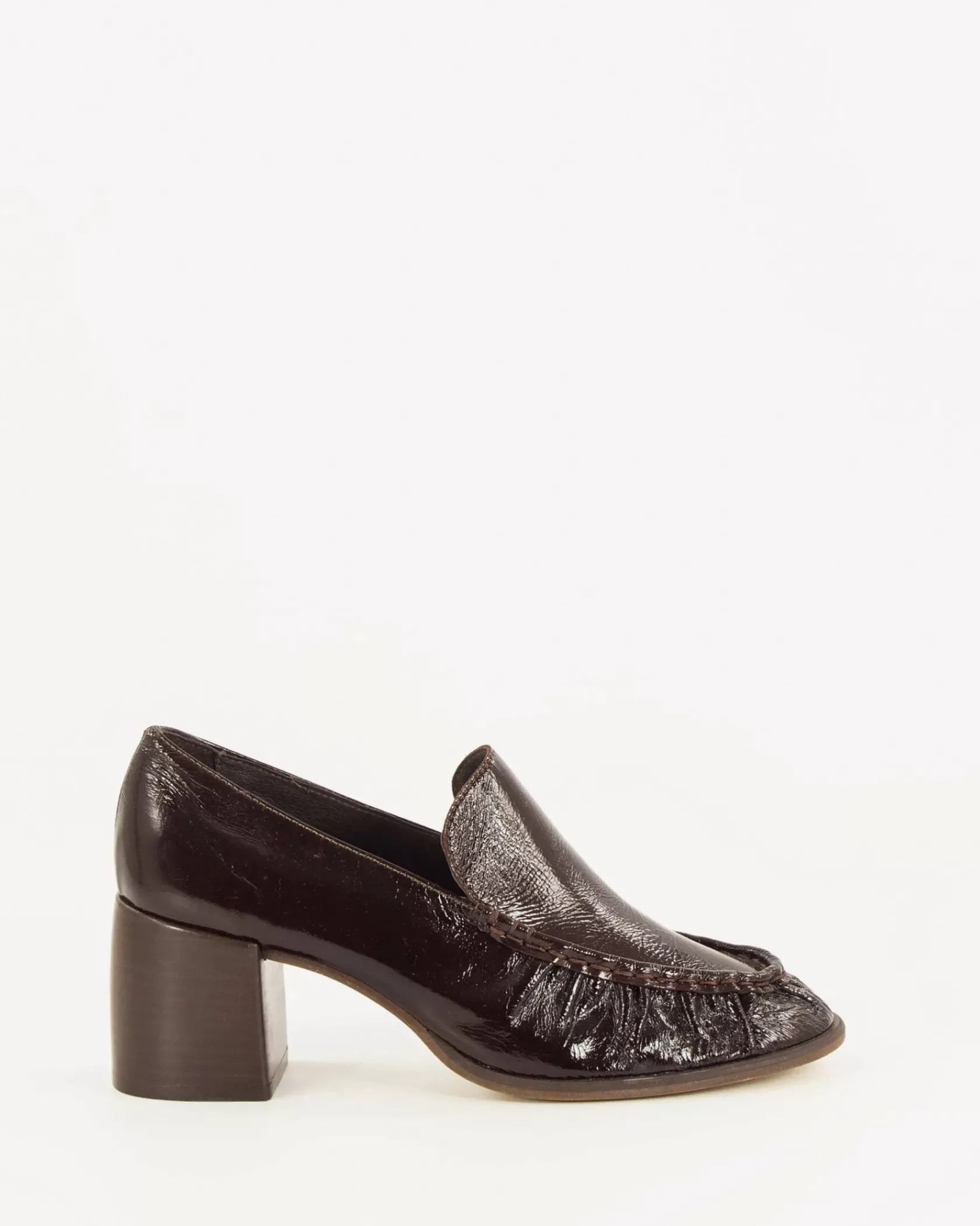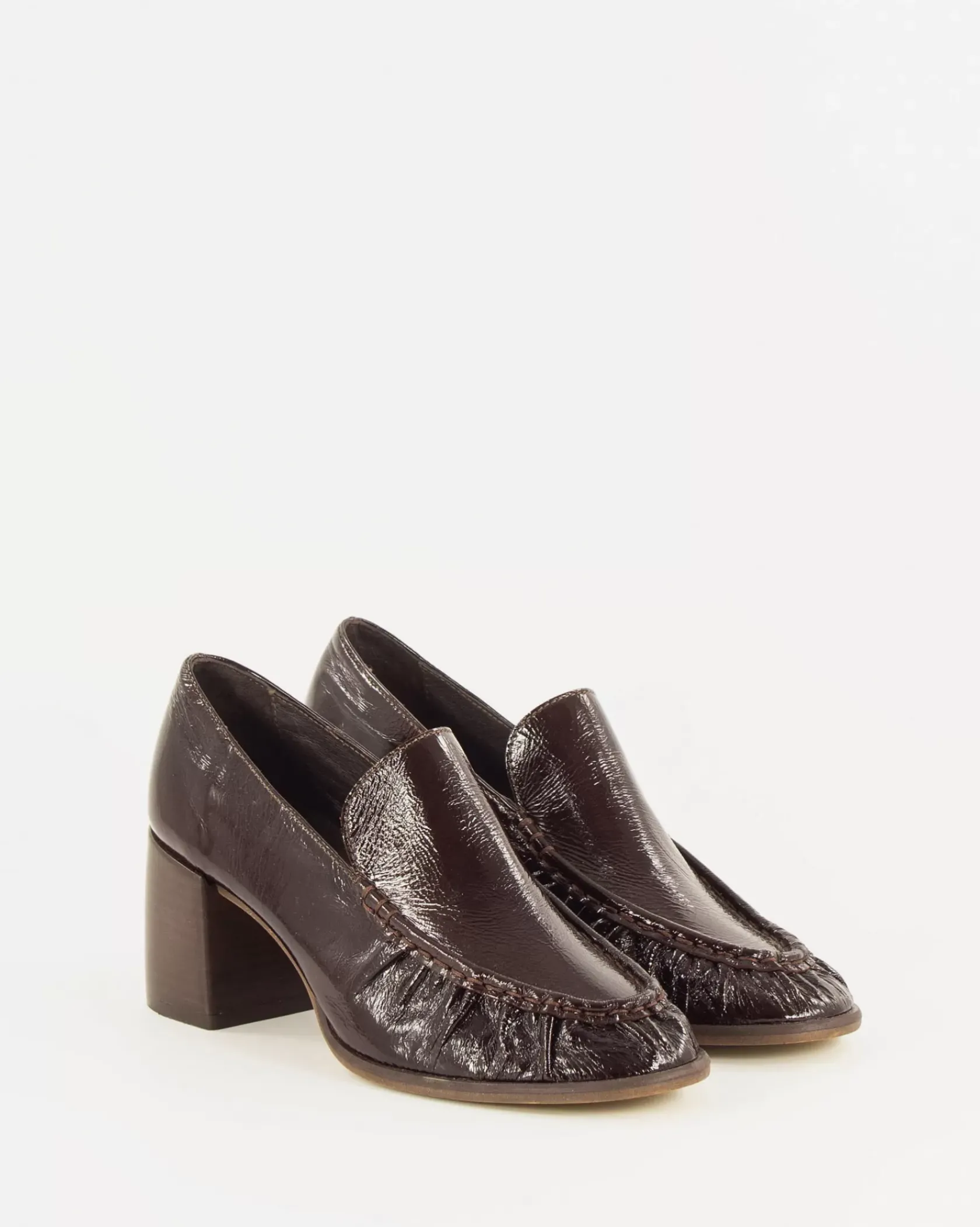 Mocassins souples à talons en cuir verni naplak, empeigne froncée, confectionnés au Portugal.