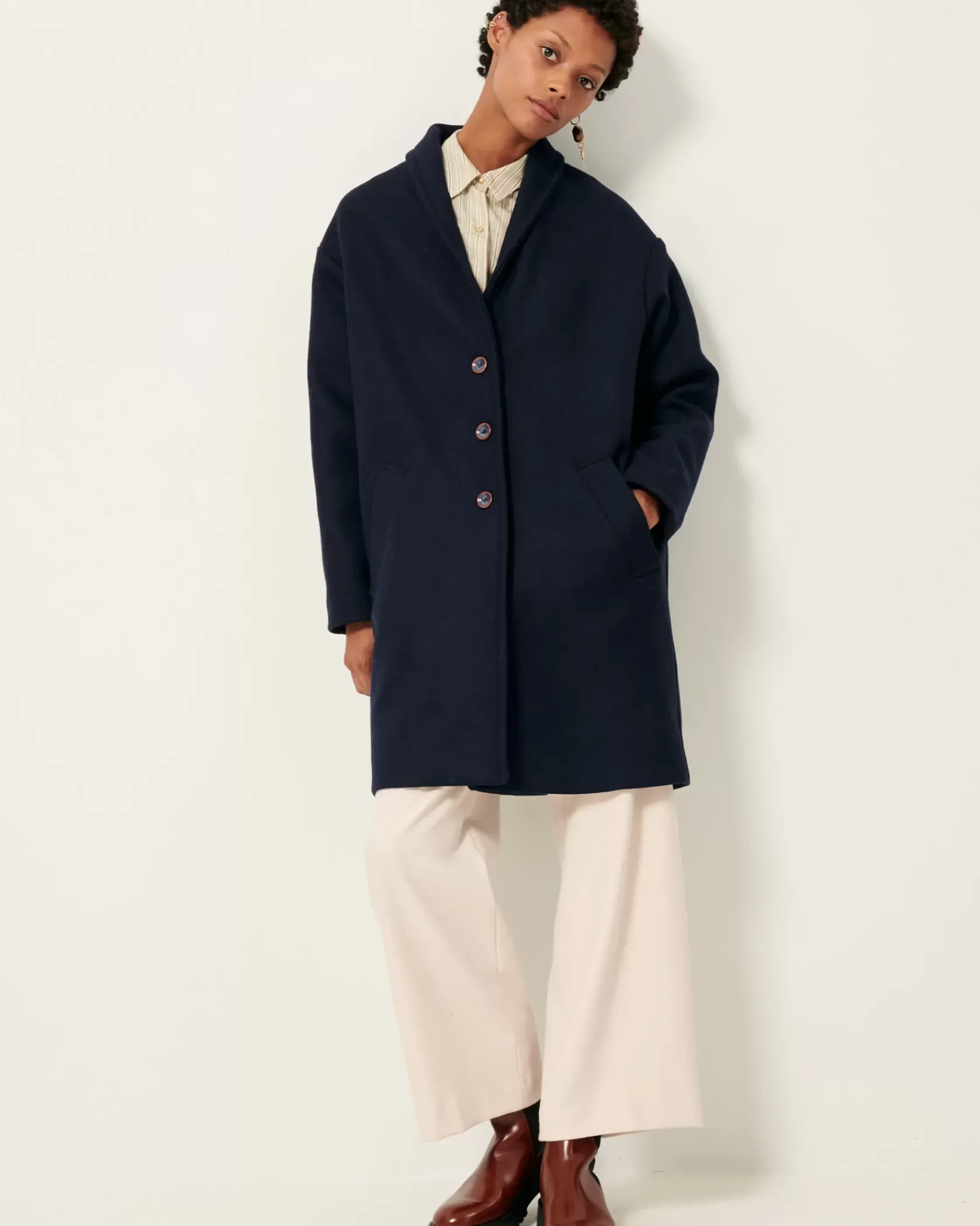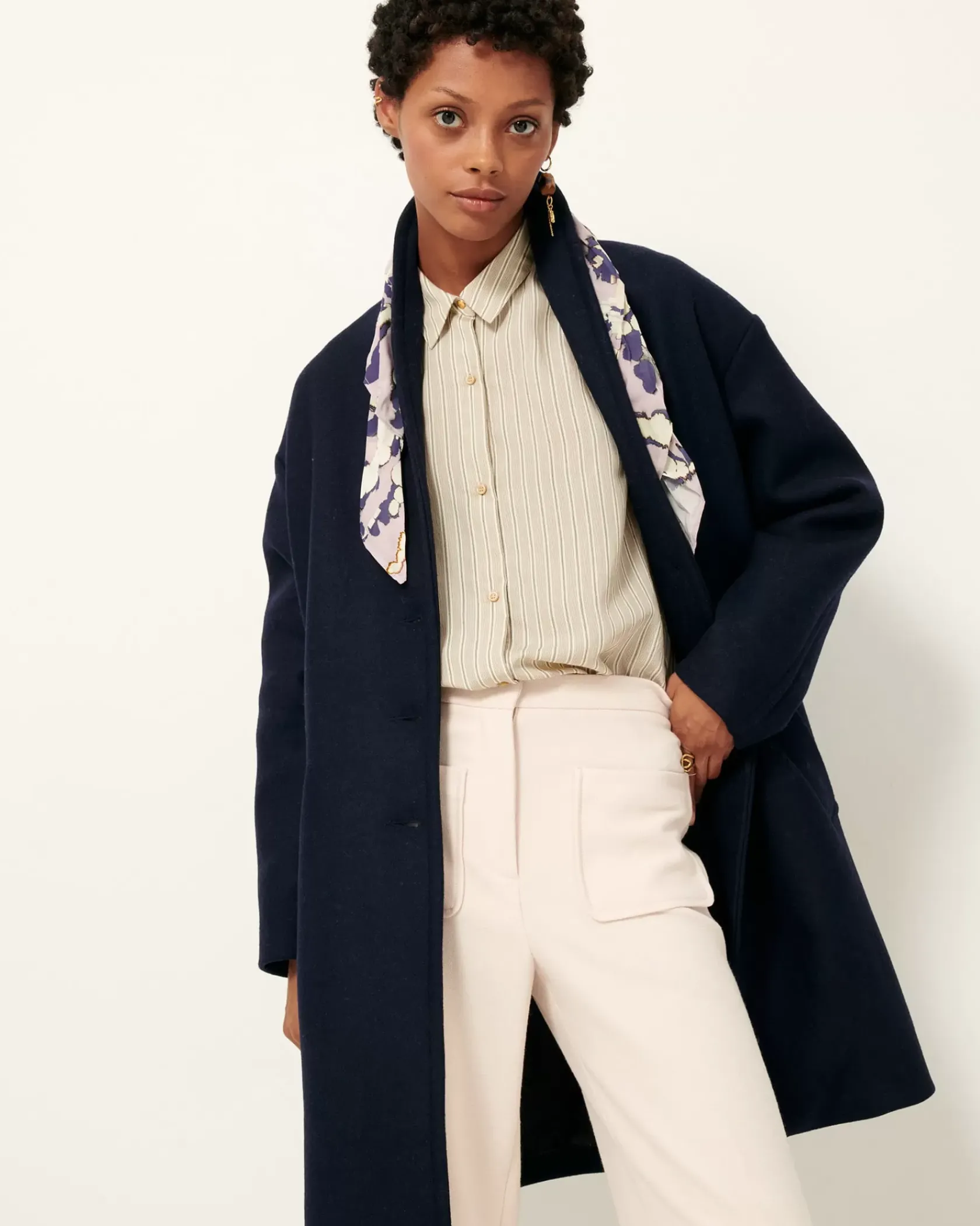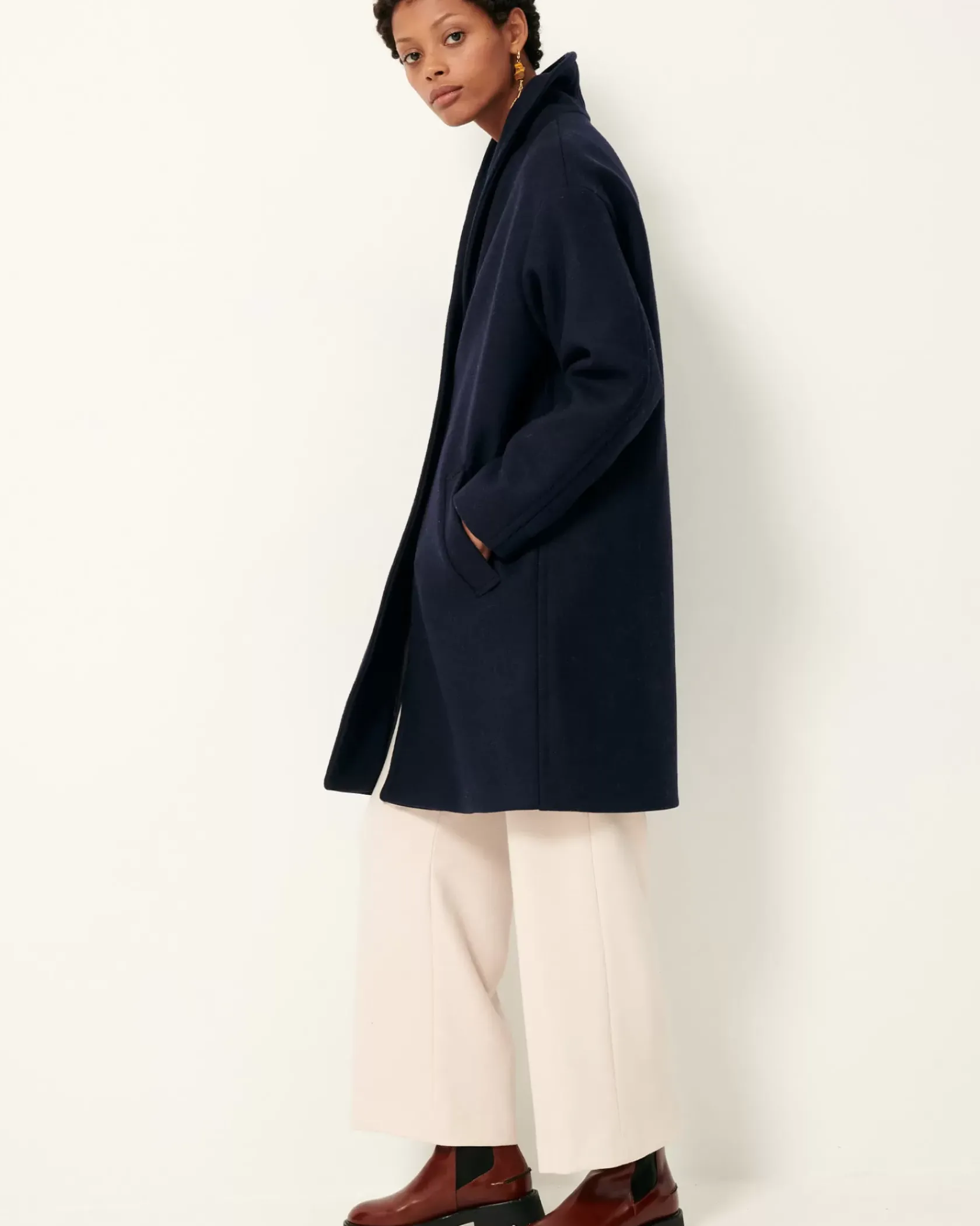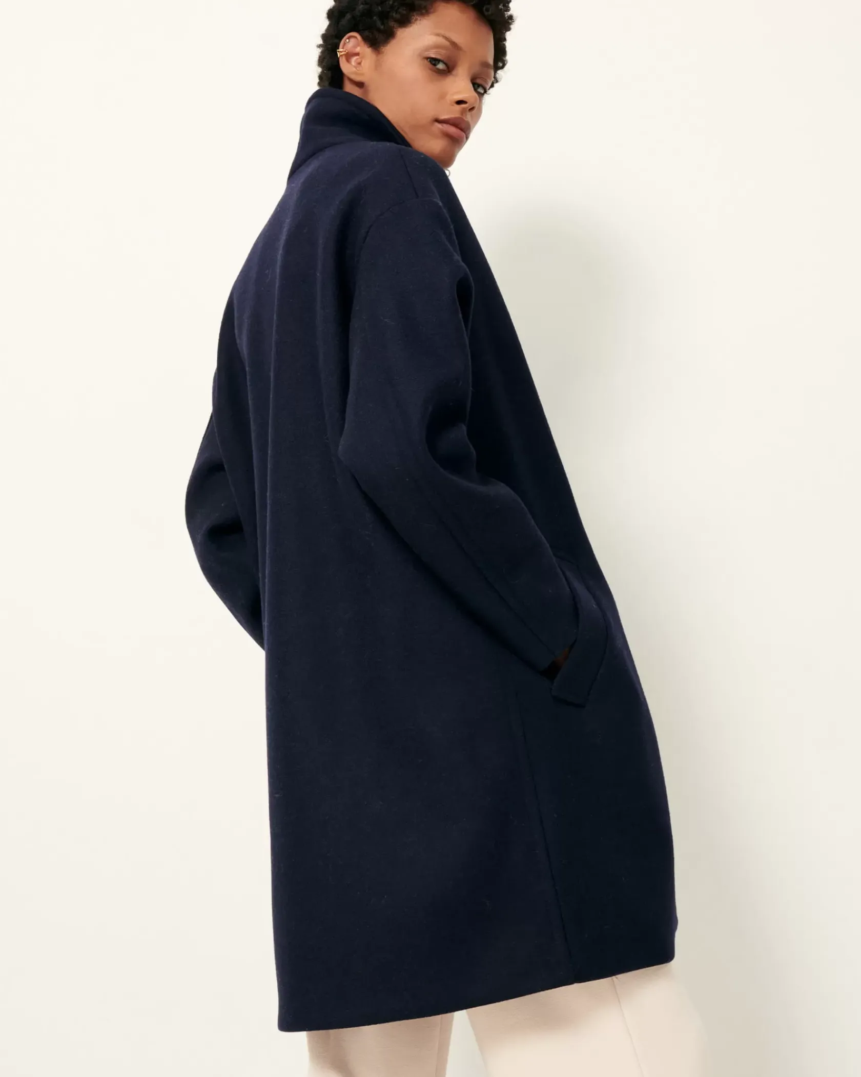 Manteau droit mi-long en double tissage armuré chiné tissé en Italie.
