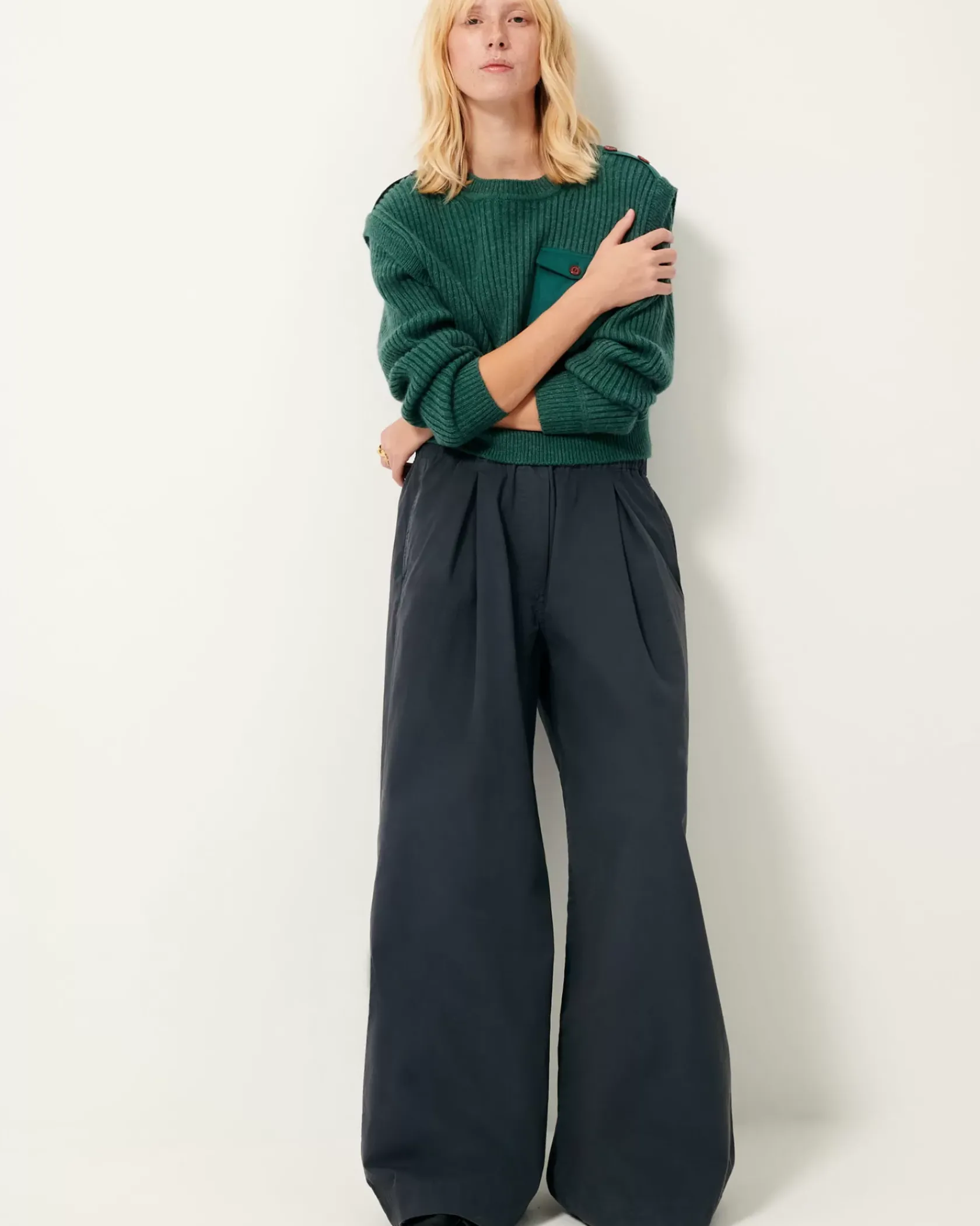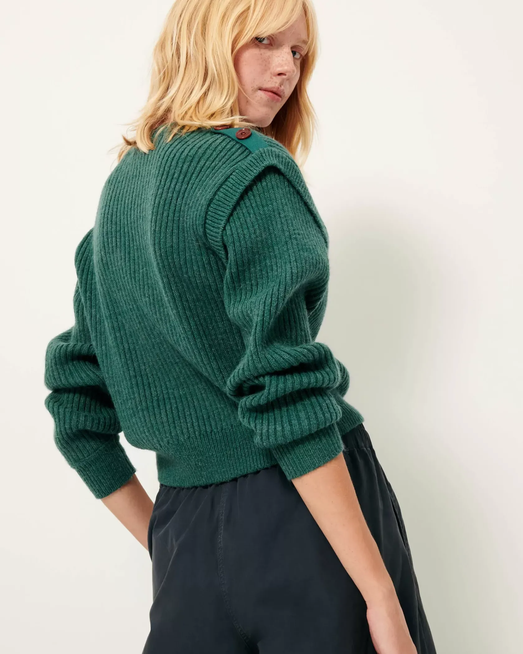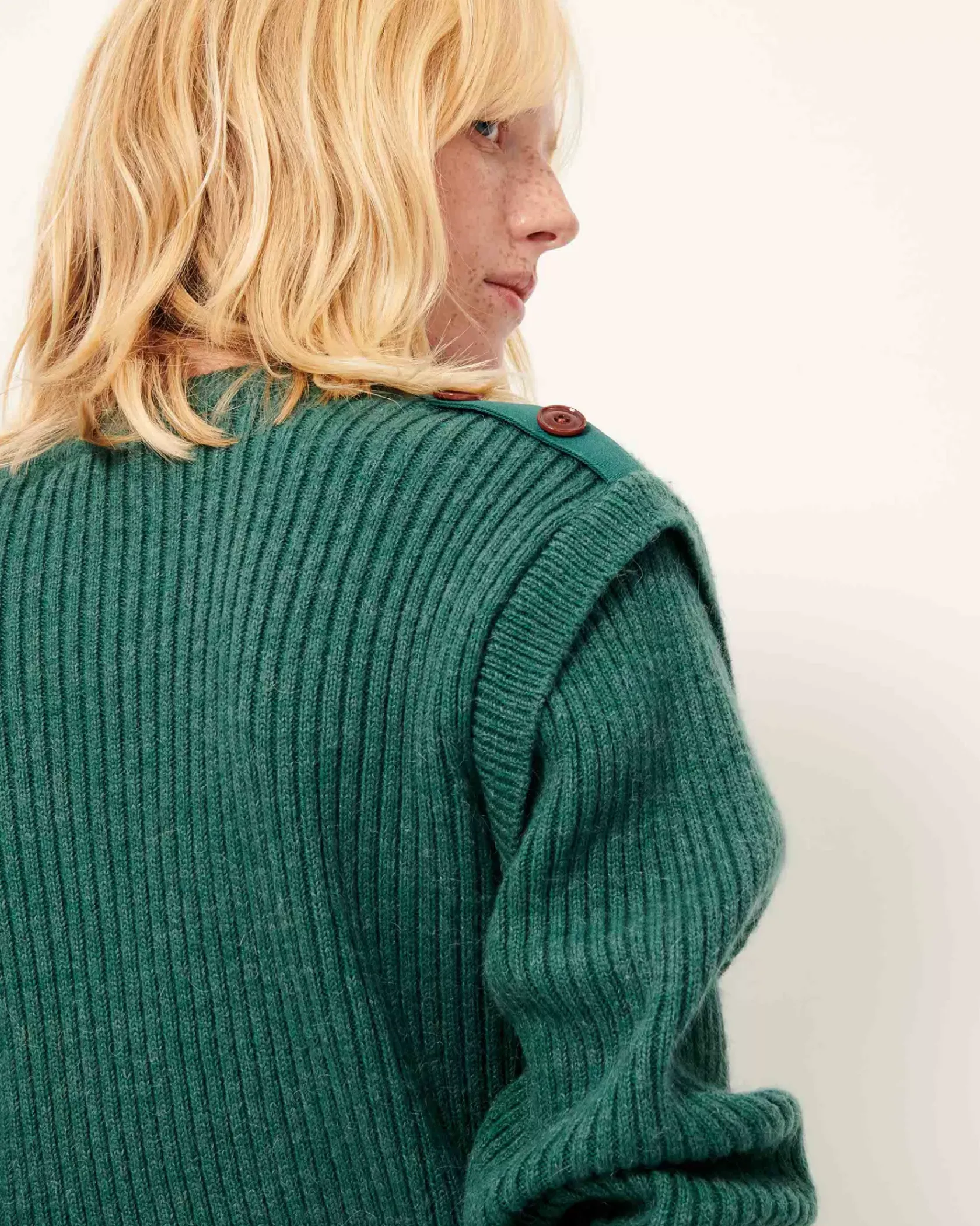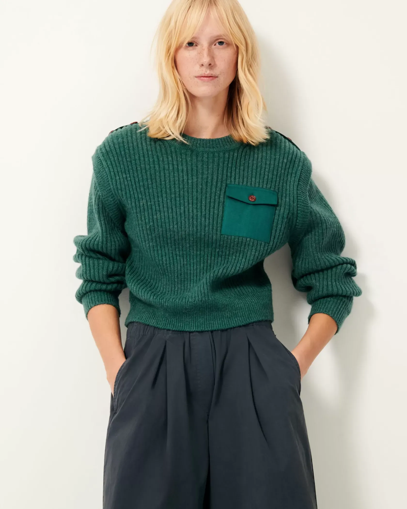 Pull court ajusté en maille côtelée. Poche poitrine et empiècements épaules boutonnés en twill de coton.