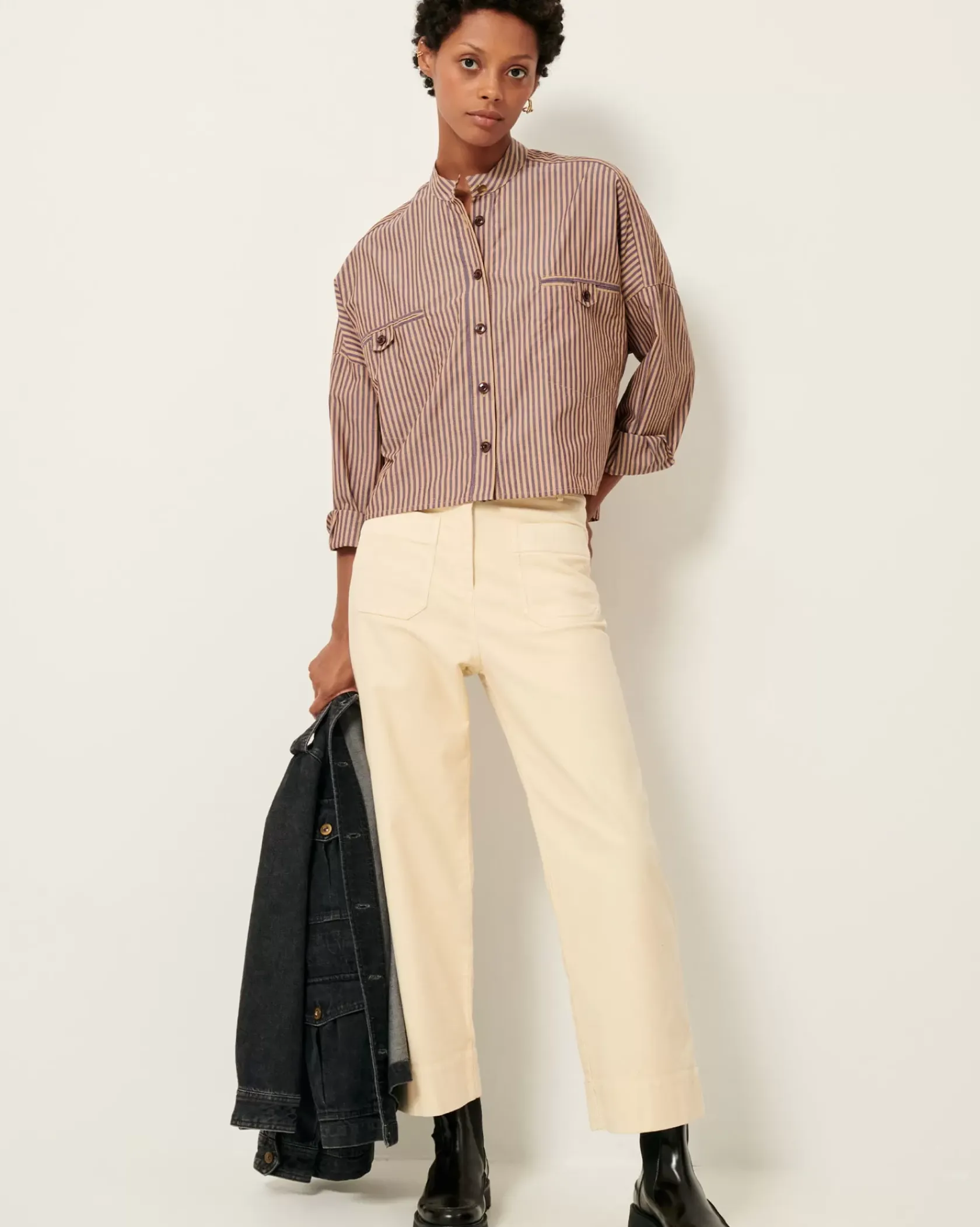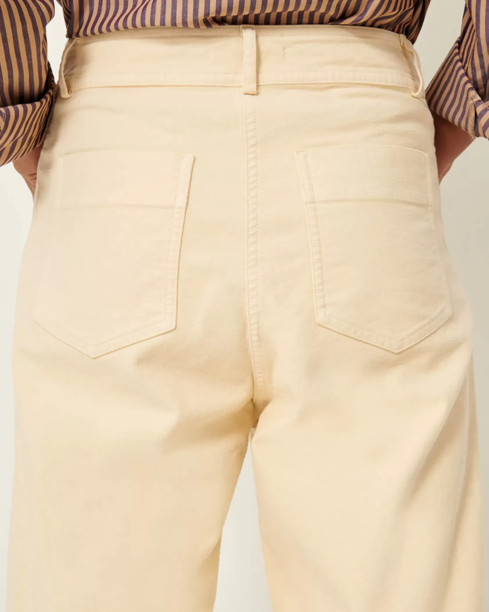 Pantalon en A en gabardine façon suédine, finition velvet, teinte en plongée, tissé en Espagne.