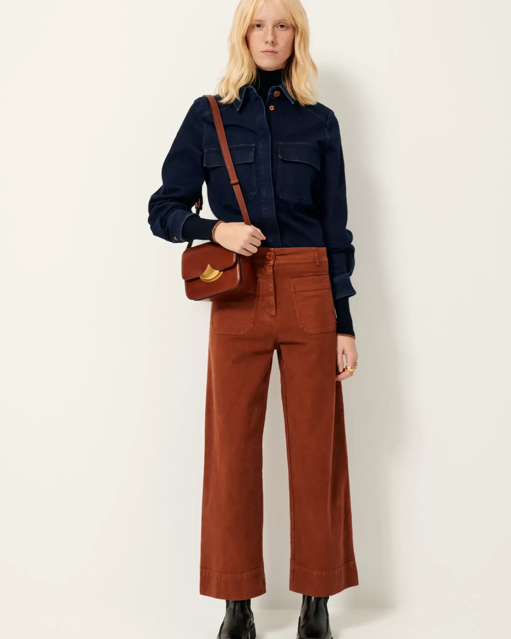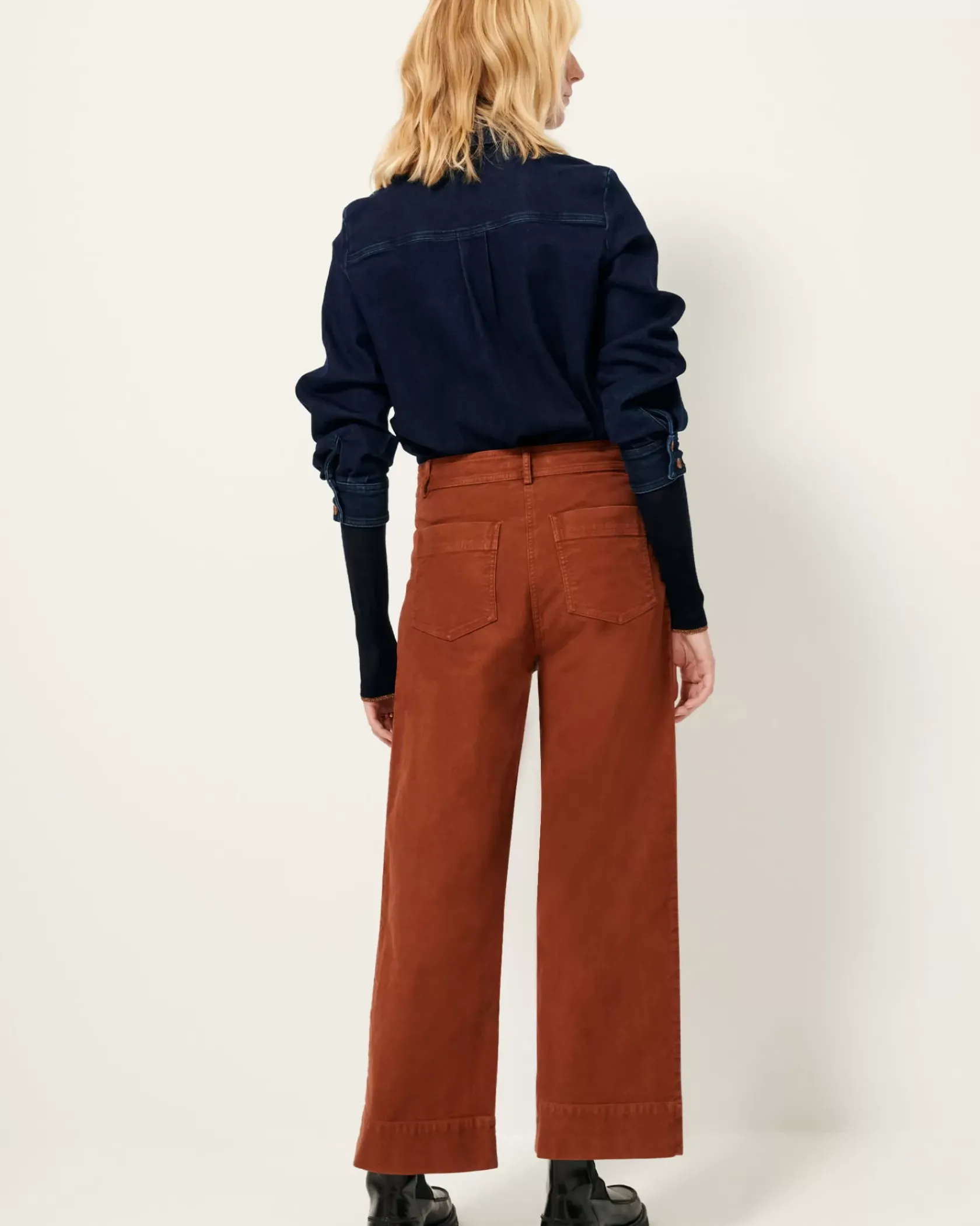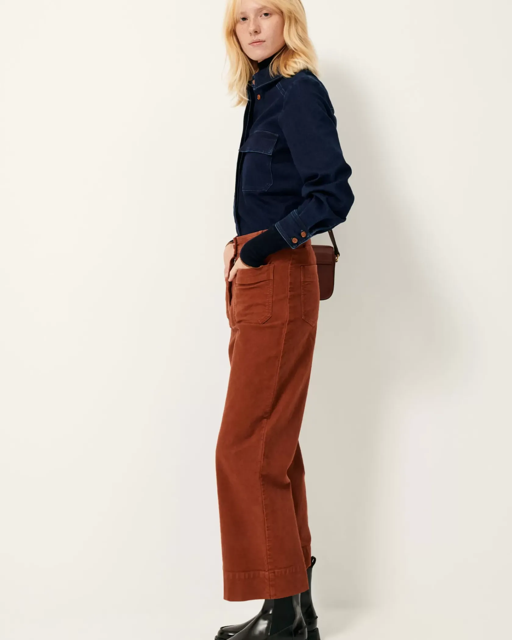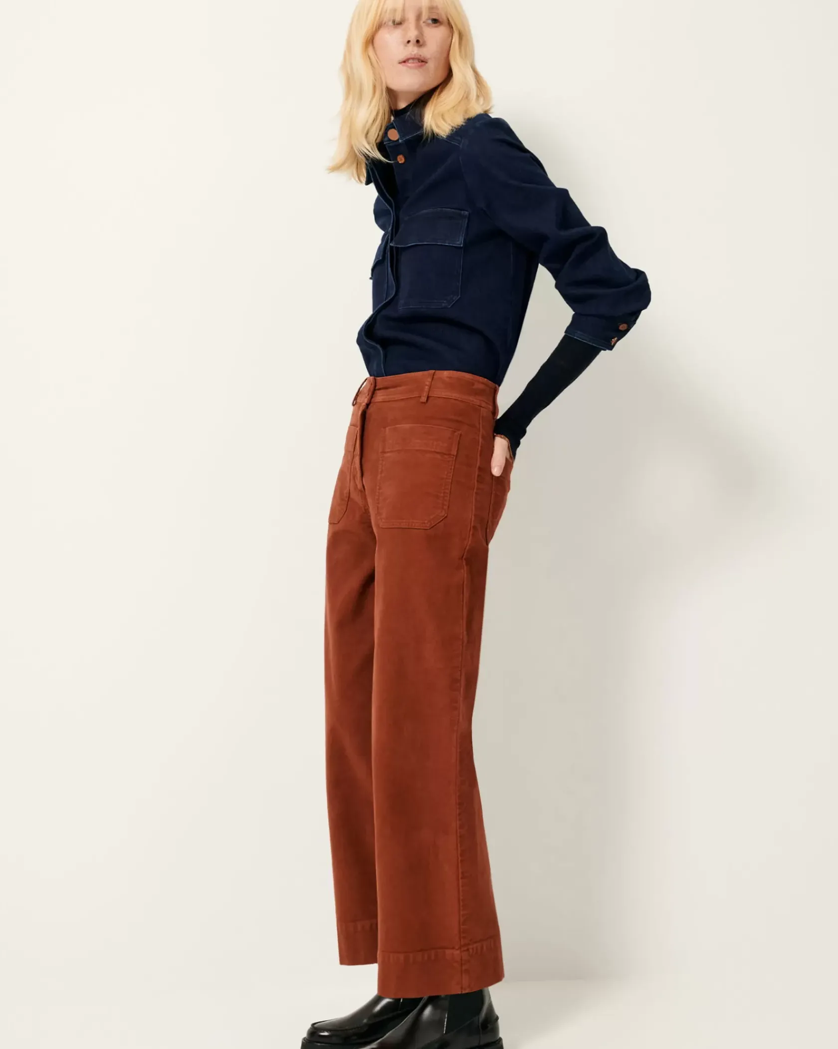 Pantalon en A en gabardine façon suédine, finition velvet, teinte en plongée, tissé en Espagne.