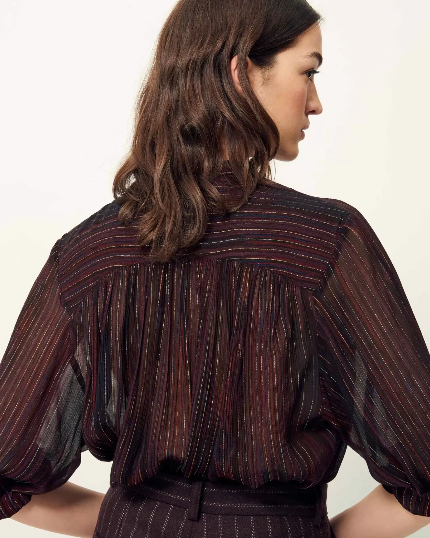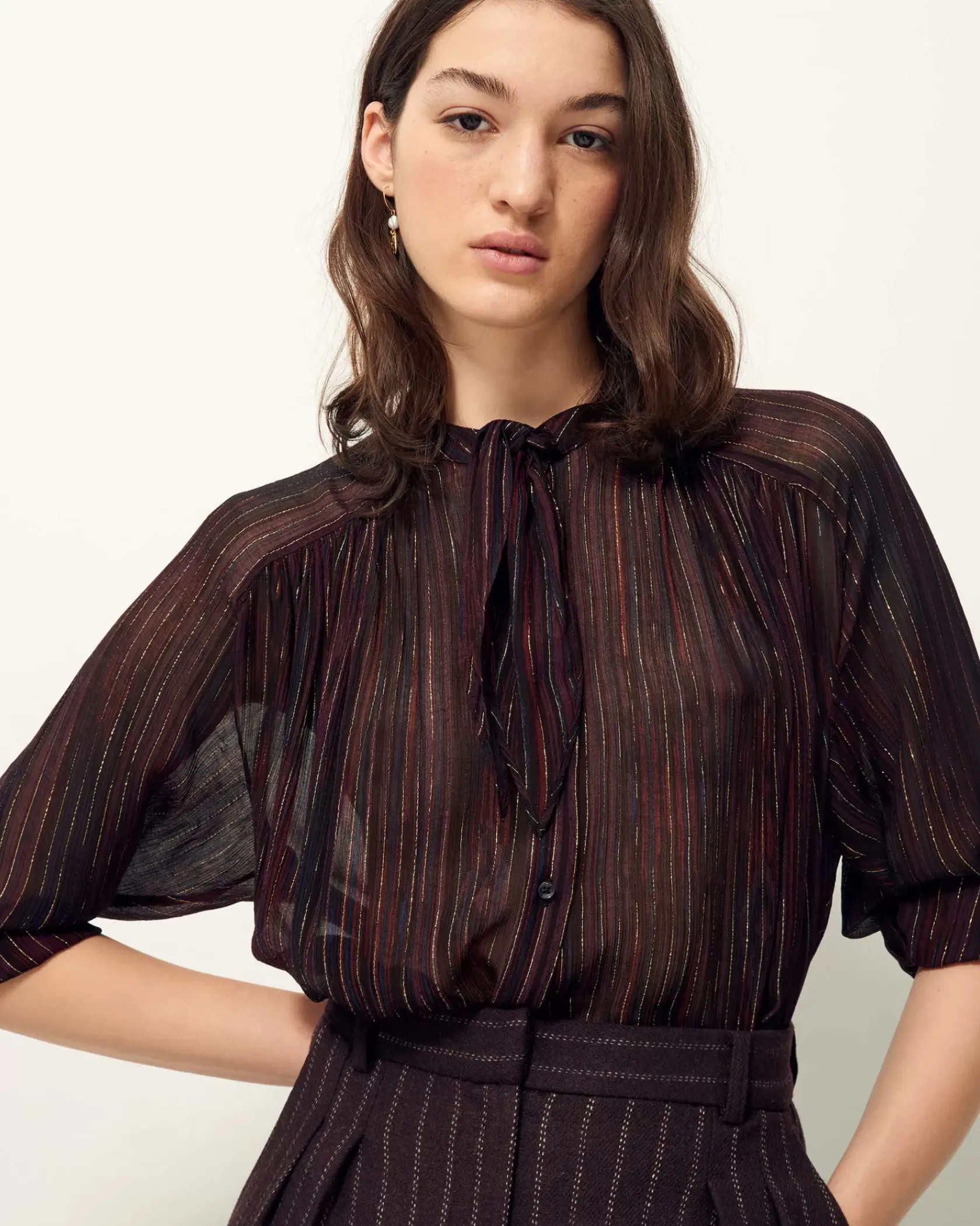 Chemise froncée à col noué en crépon mousseline de soie viscose imprimé, à fines rayures métallisées, motif exclusif Sessùn.