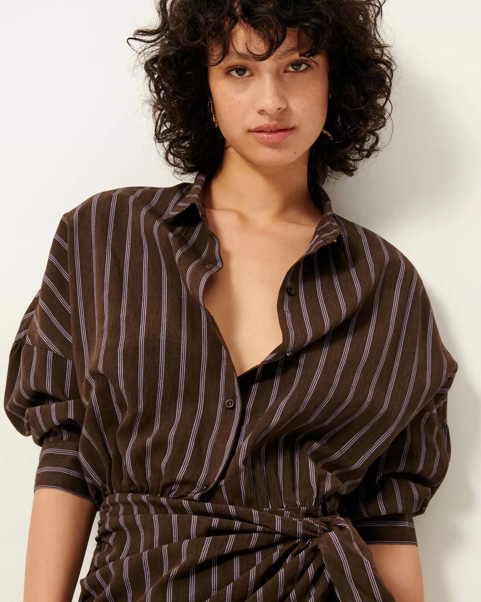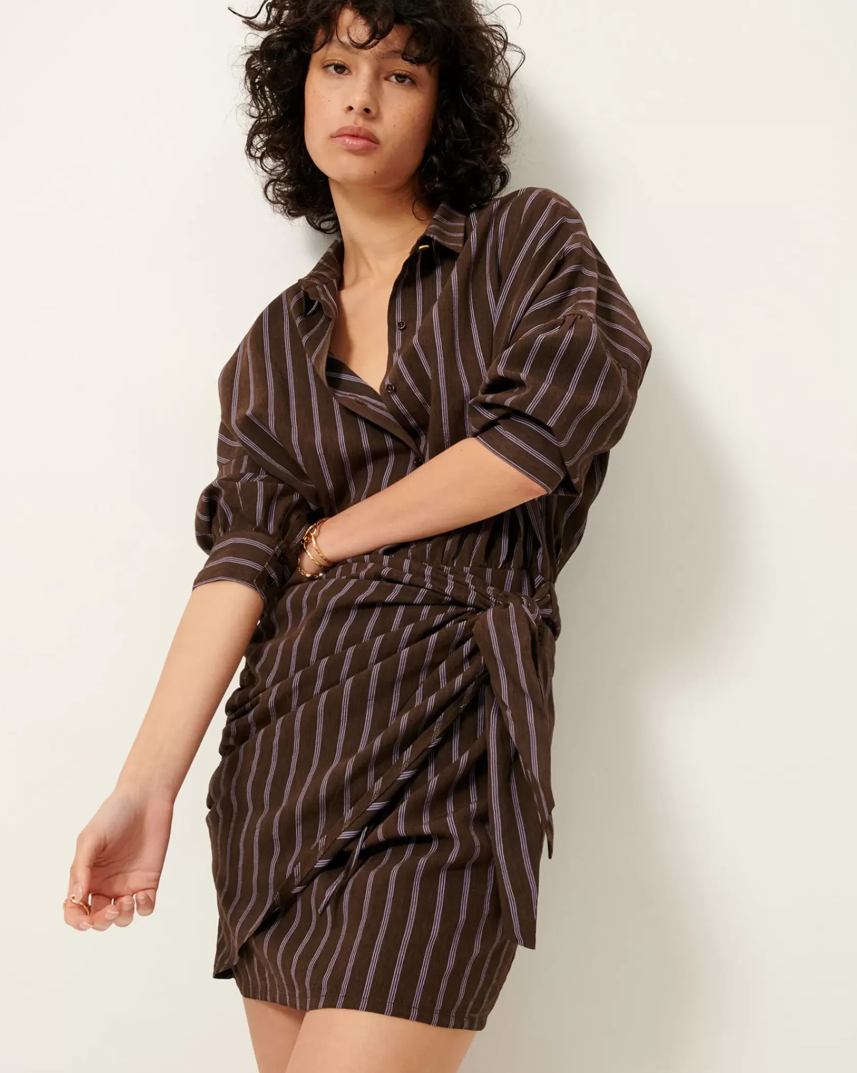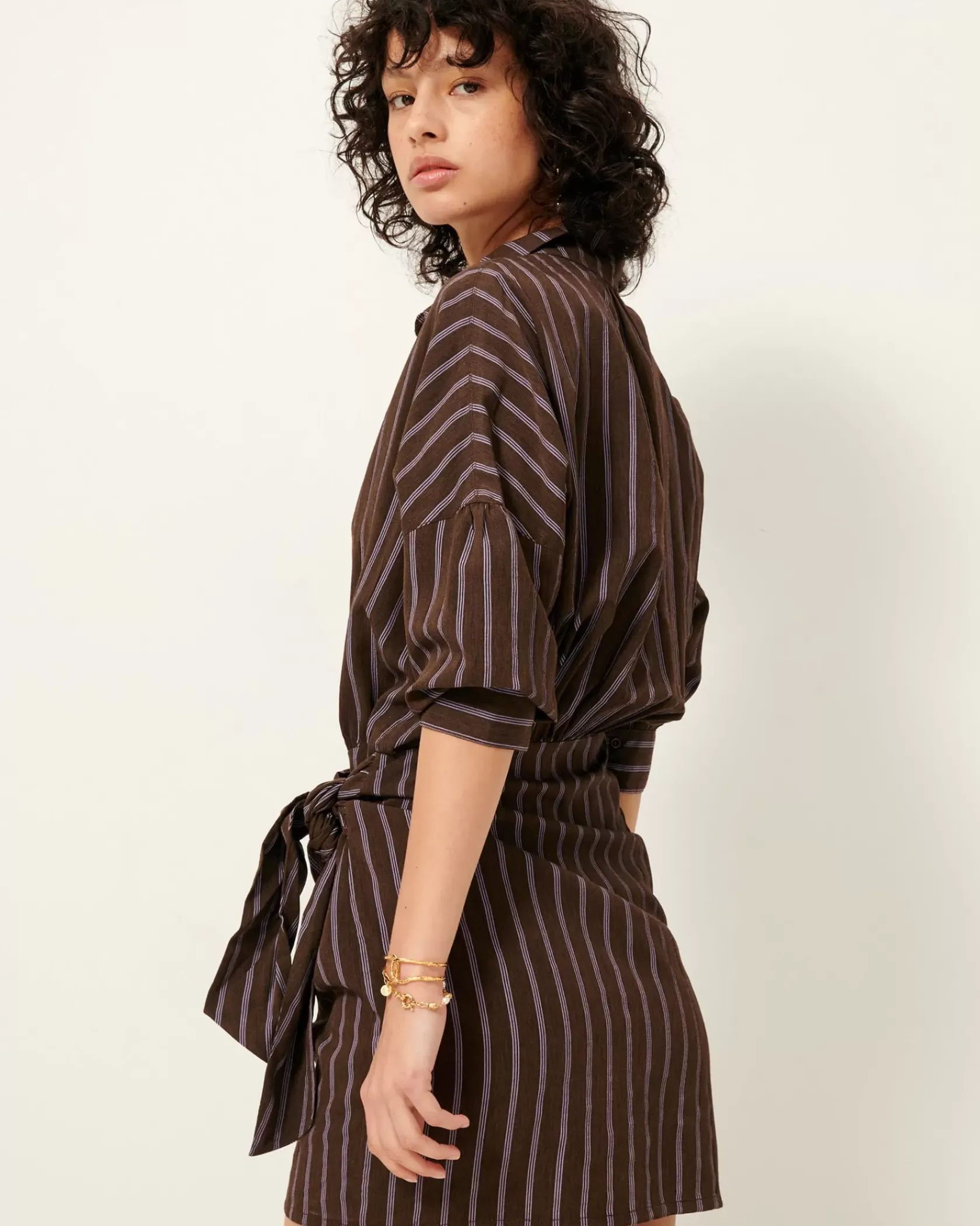 Robe chemisier courte nouée à la taille en linon à rayures avec travail d’armure et fil chiné, tissé en Italie.