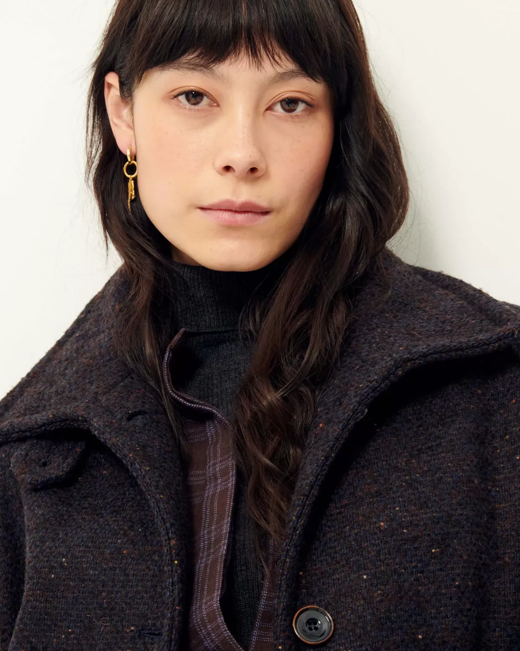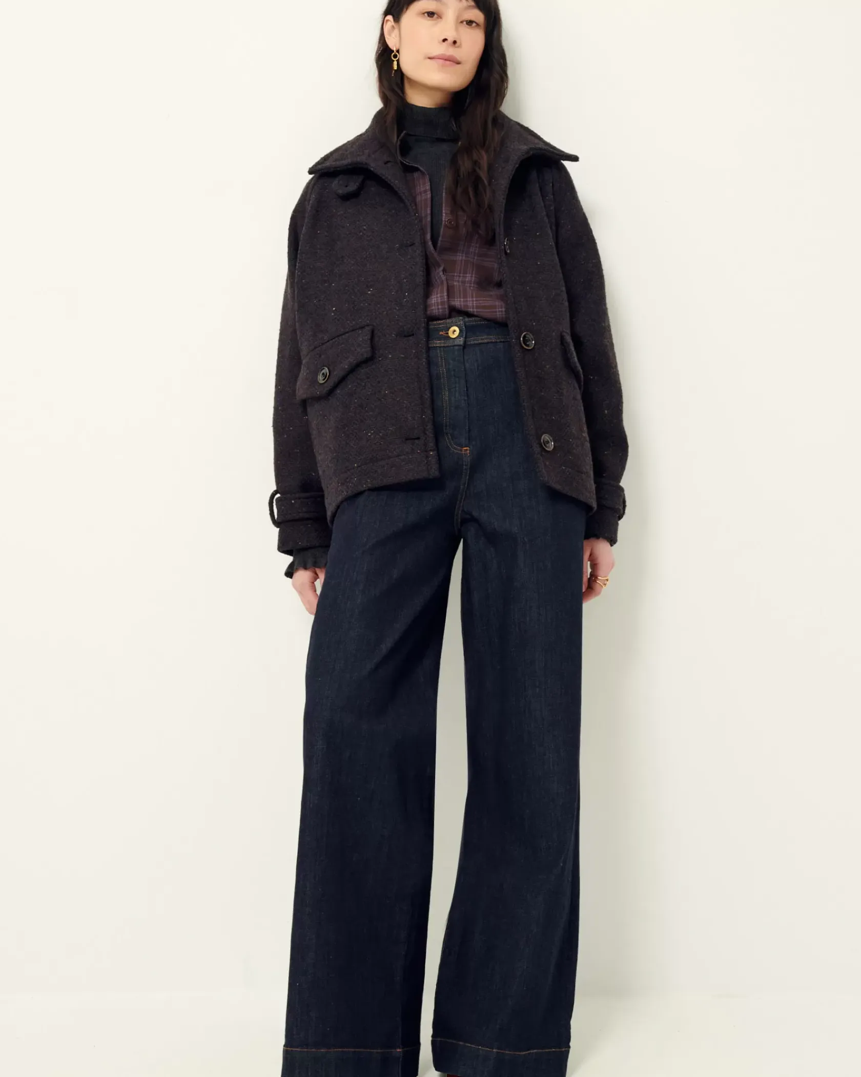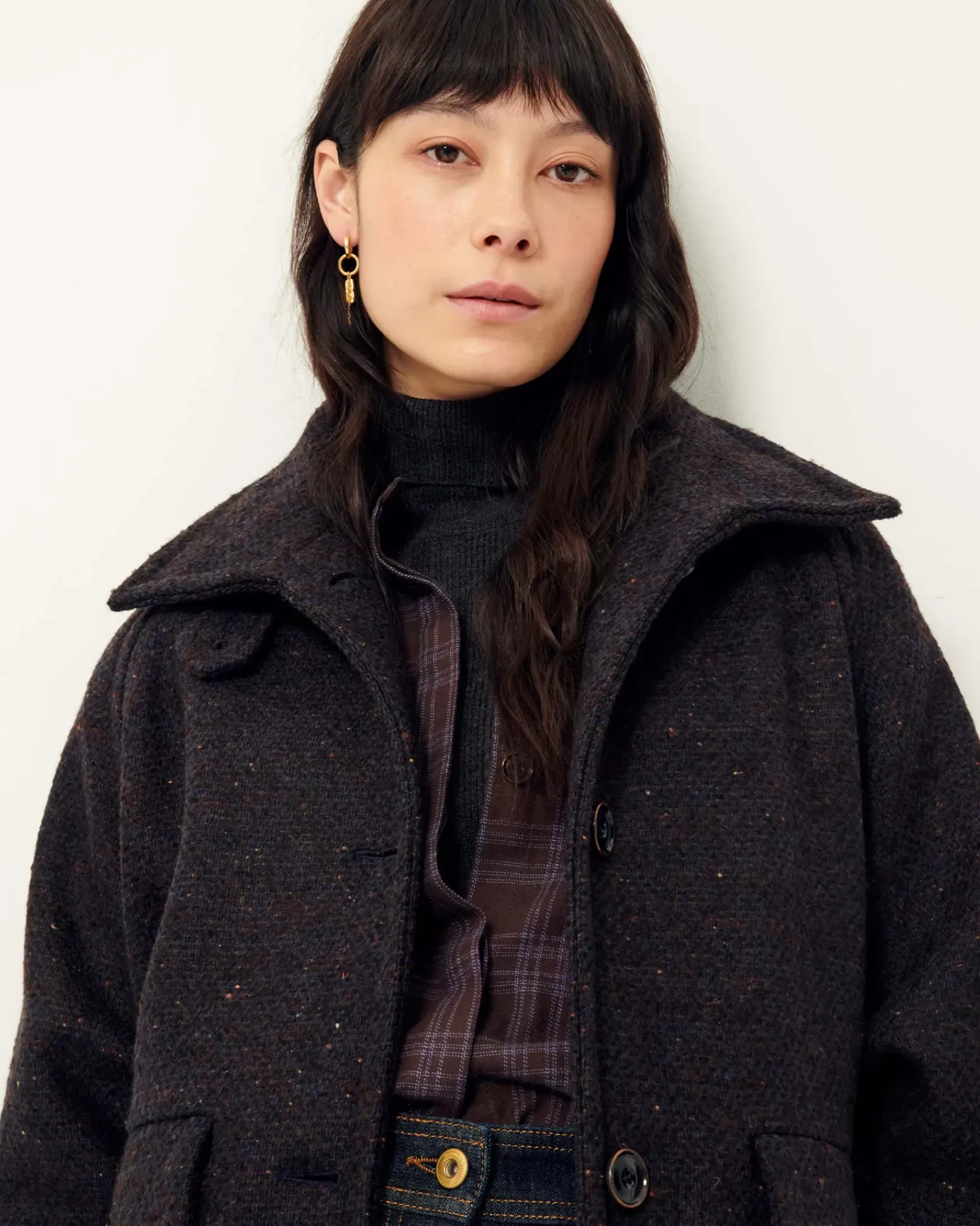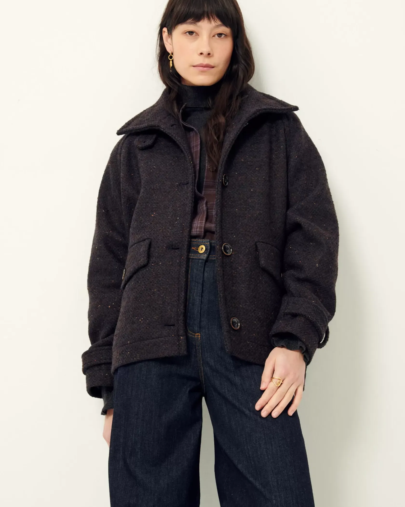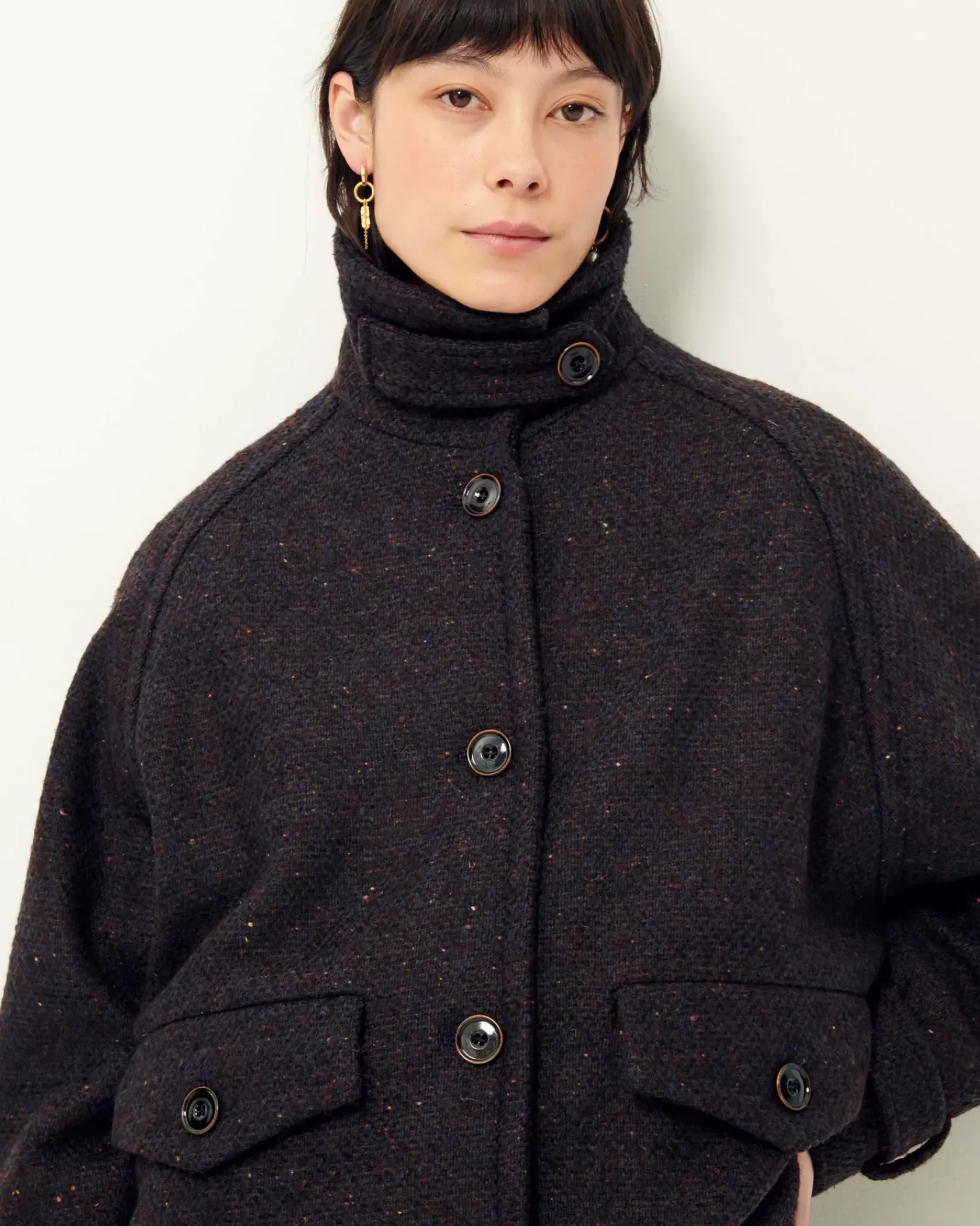 Manteau esprit blouson à emmanchures raglan et col haut en double tissage natté bicolore de fils bouclés, tissé en Italie
