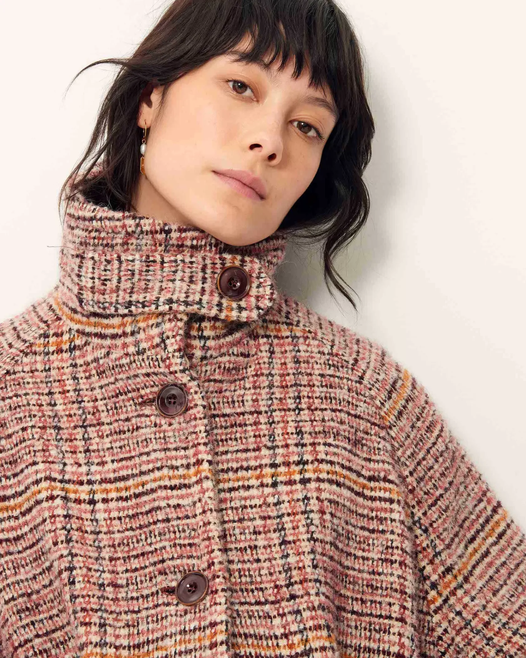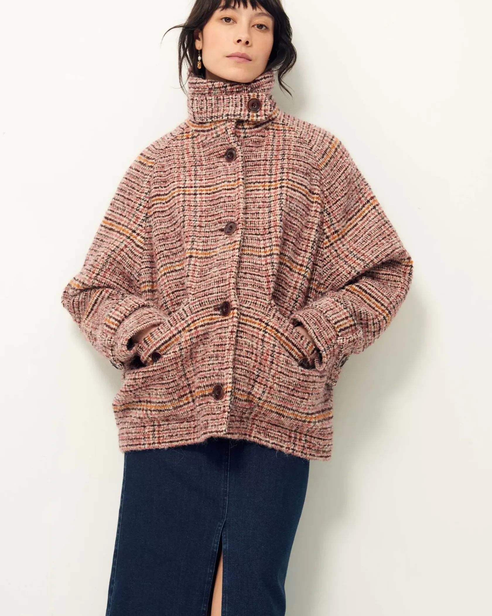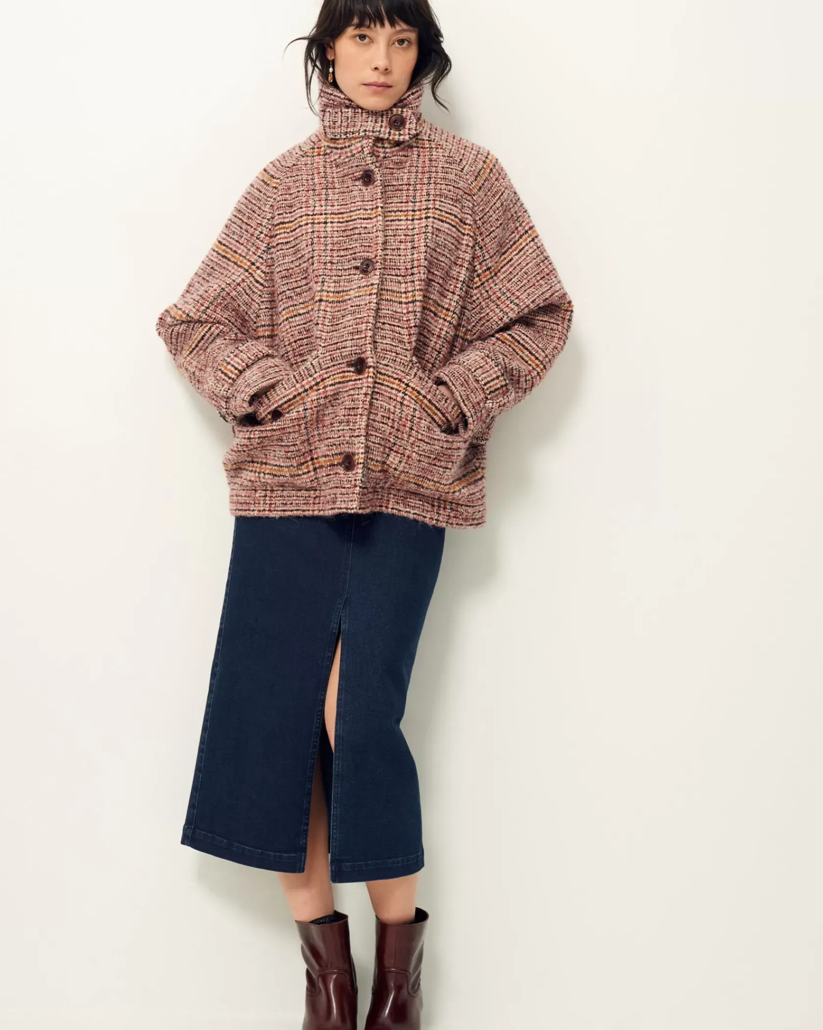 Manteau esprit blouson à emmanchures raglan et col haut en tissage tartan fantaisie de fils bouclés, exclusif Sessùn, tissé en Italie.