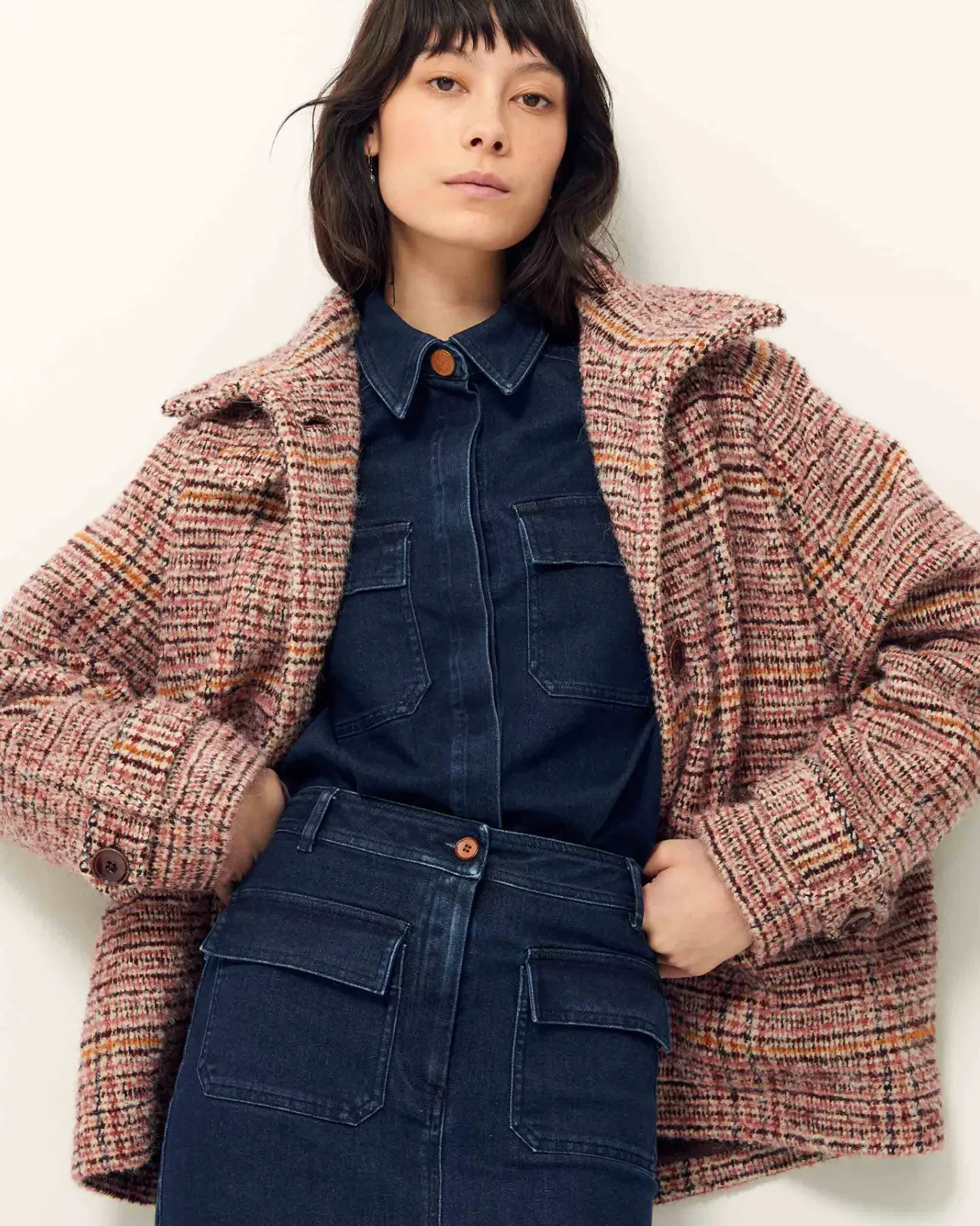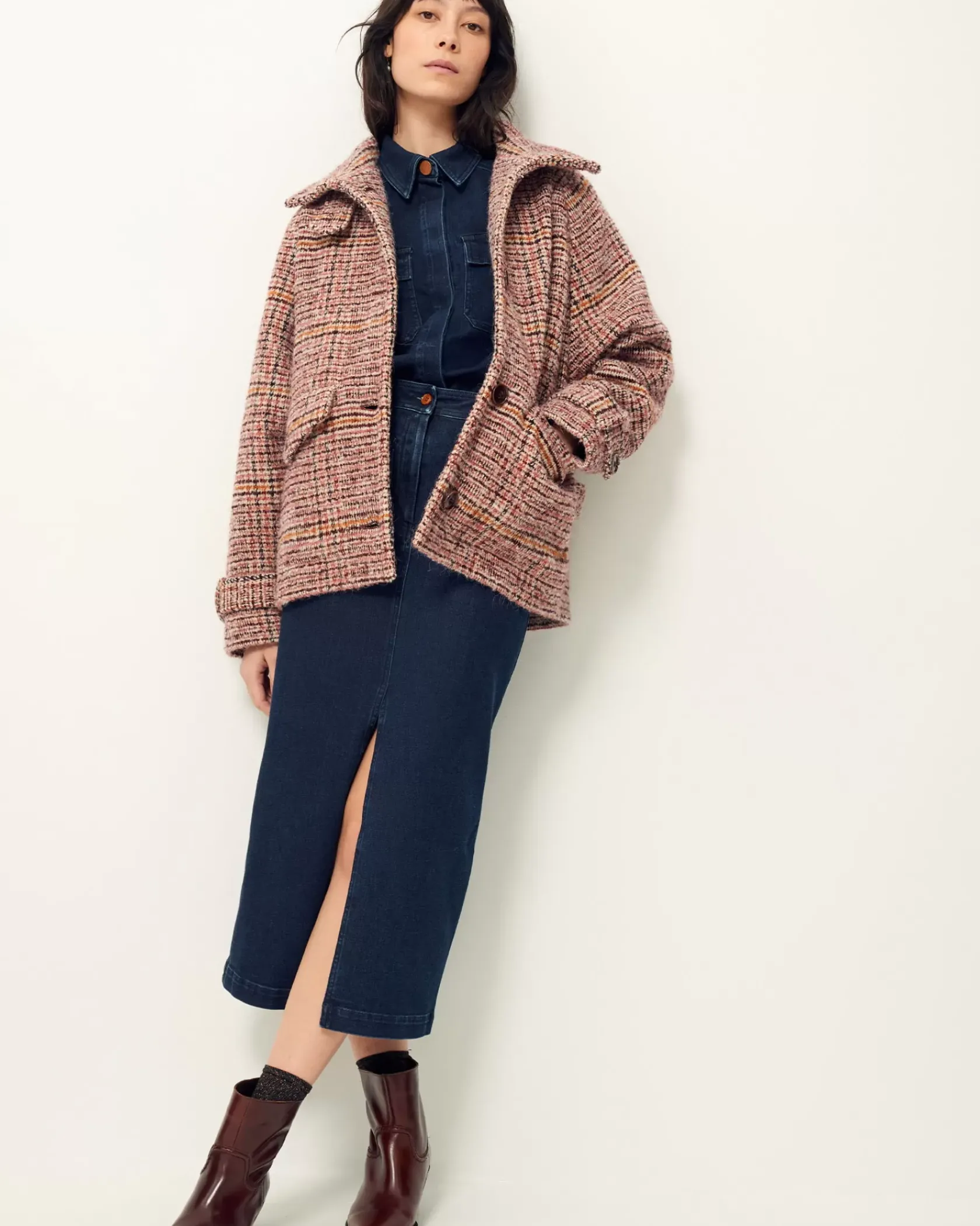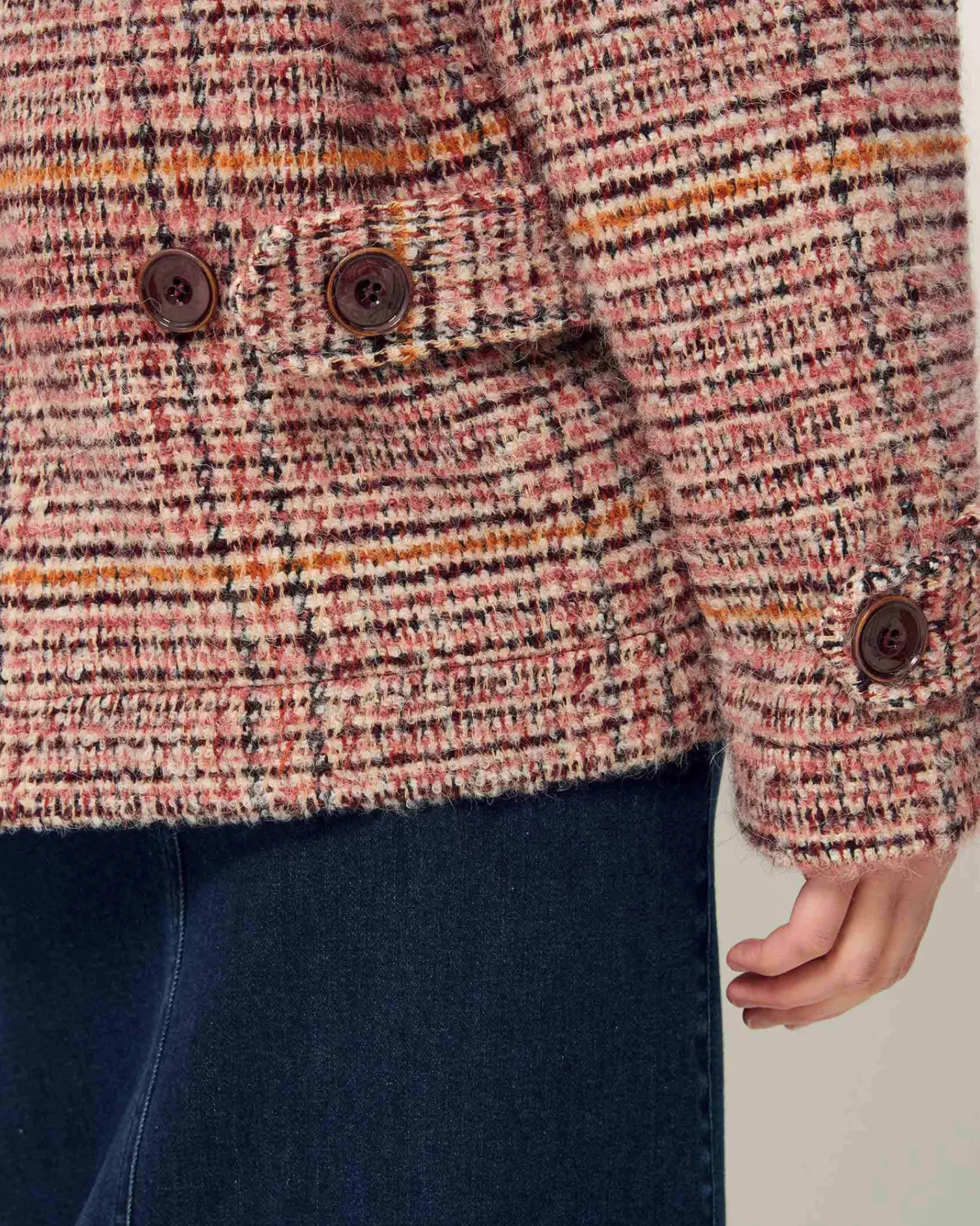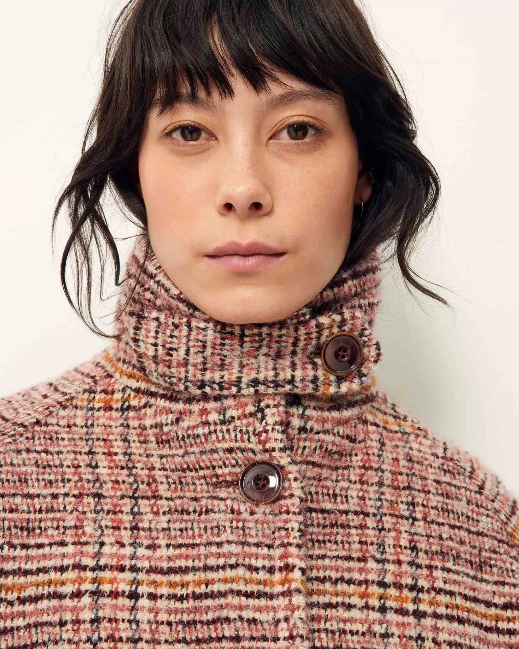 Manteau esprit blouson à emmanchures raglan et col haut en tissage tartan fantaisie de fils bouclés, exclusif Sessùn, tissé en Italie.