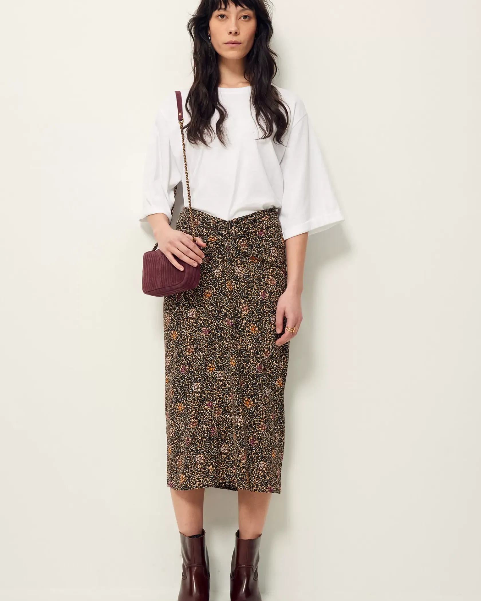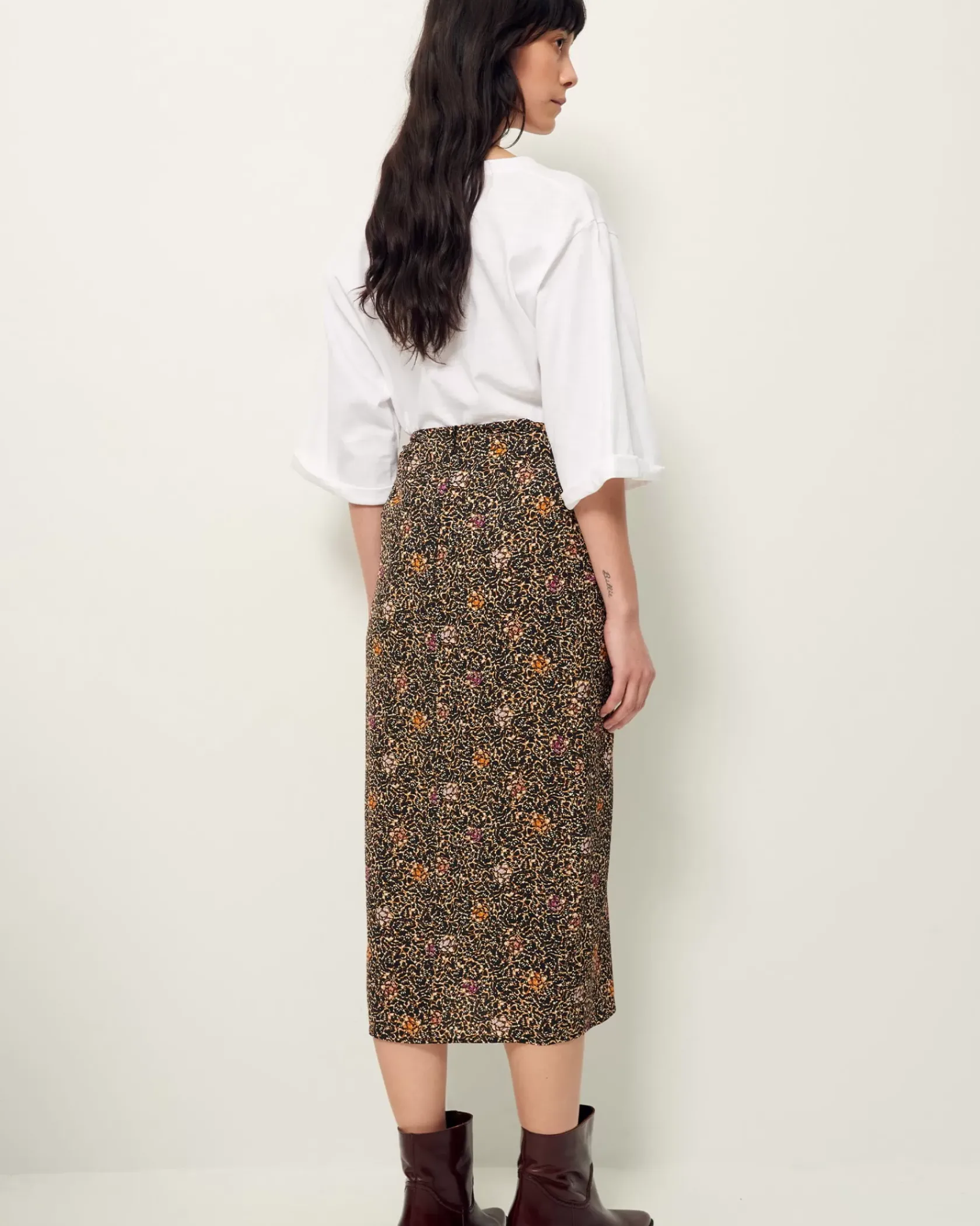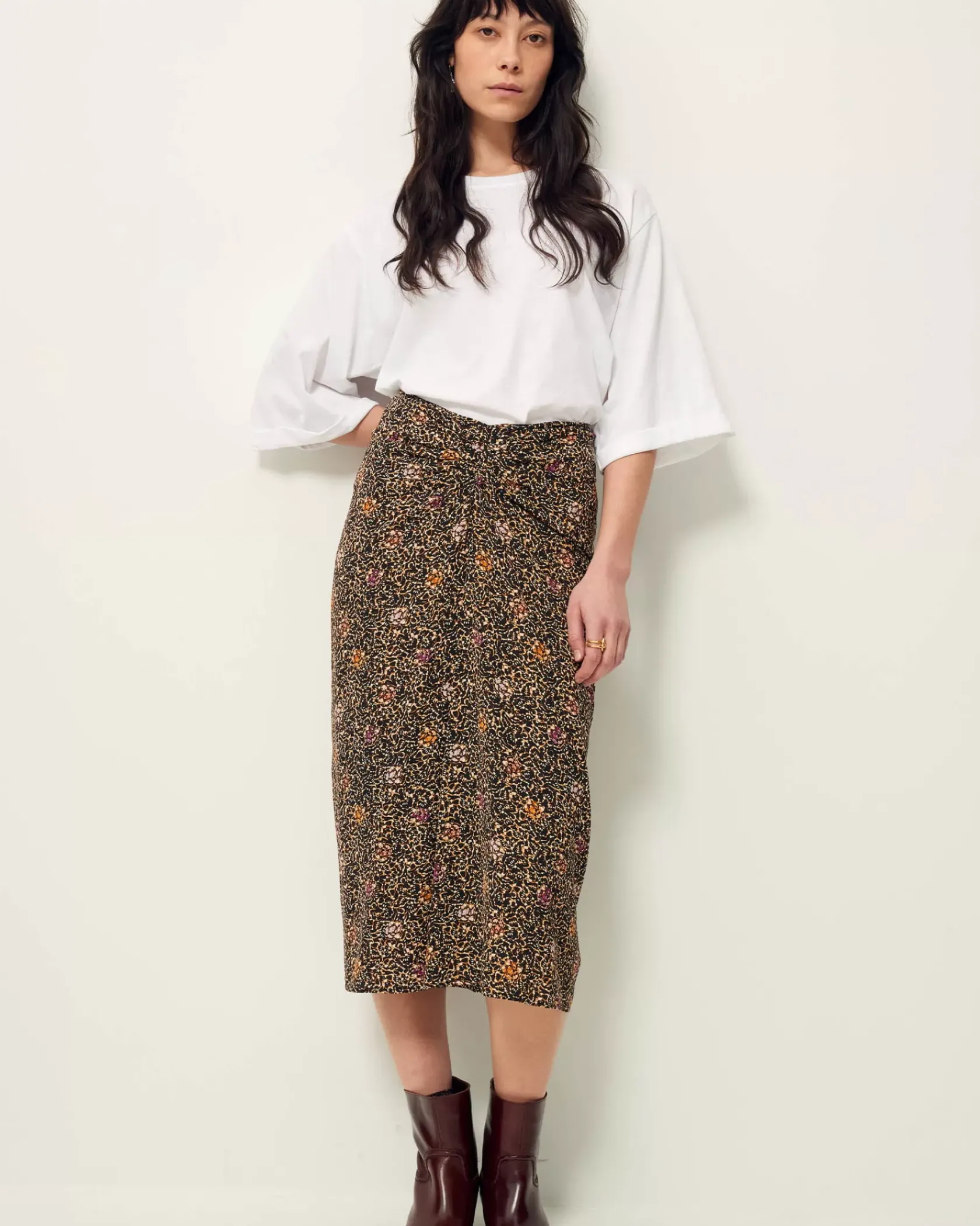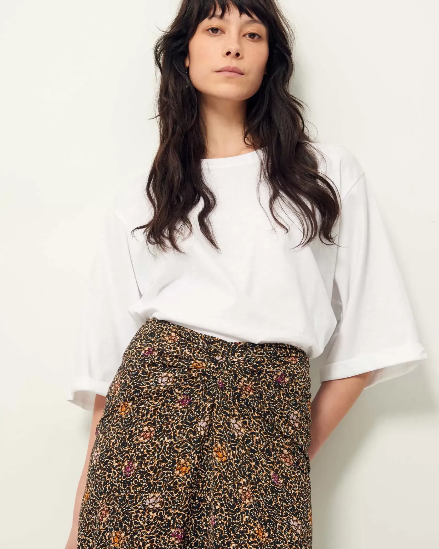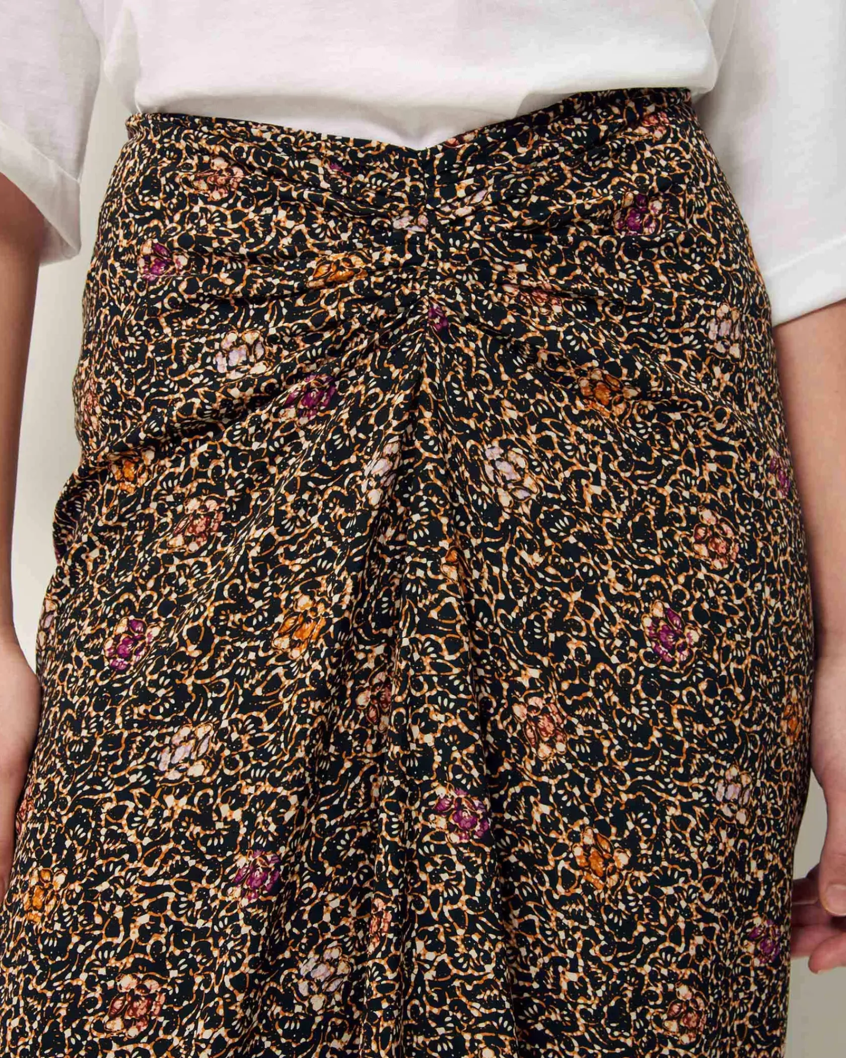 Jupe mi-longue froncée devant en toile de viscose fluide et aérienne imprimée, motif exclusif Sessùn.