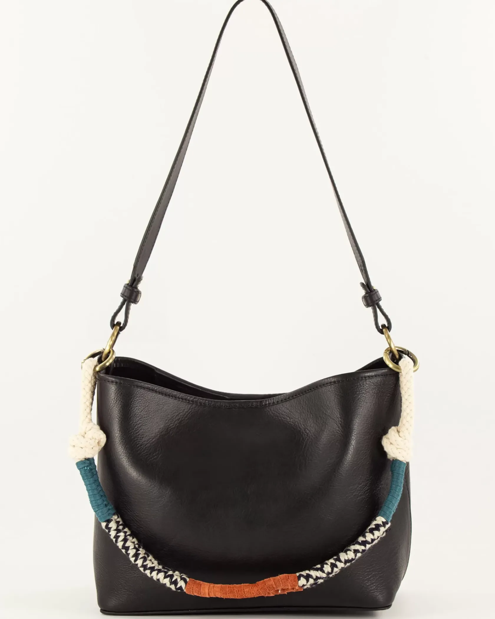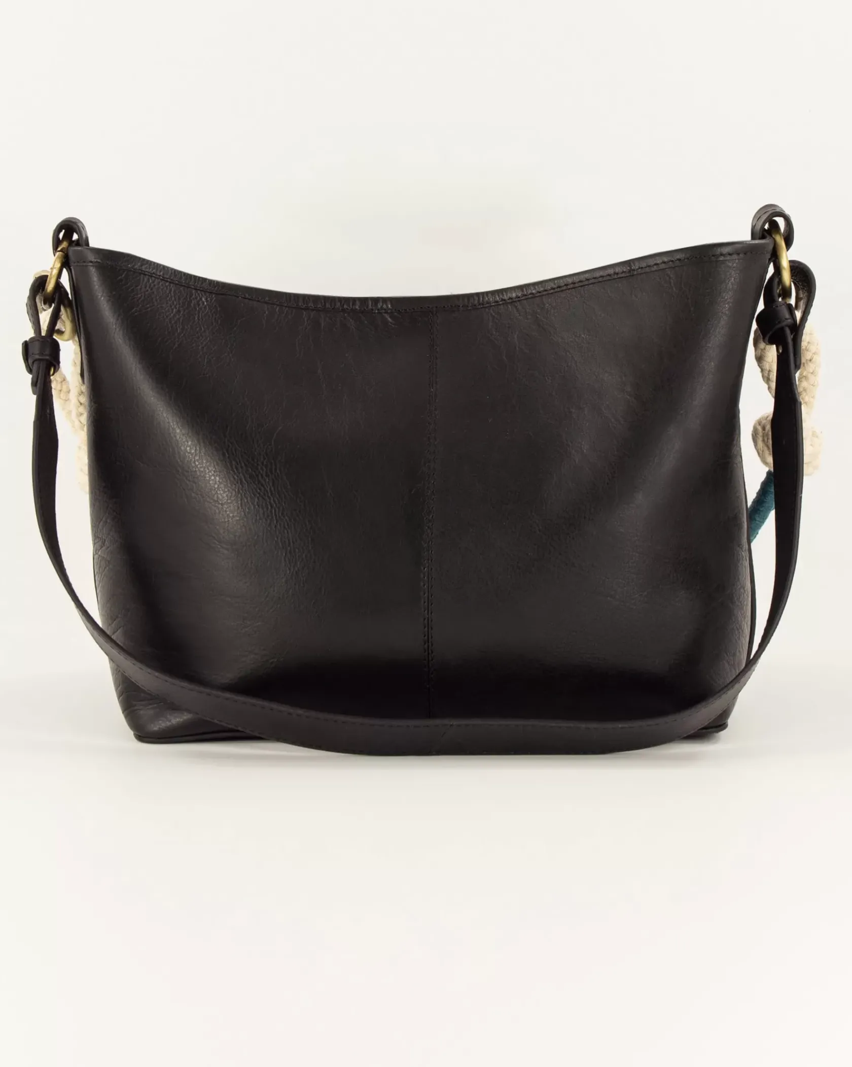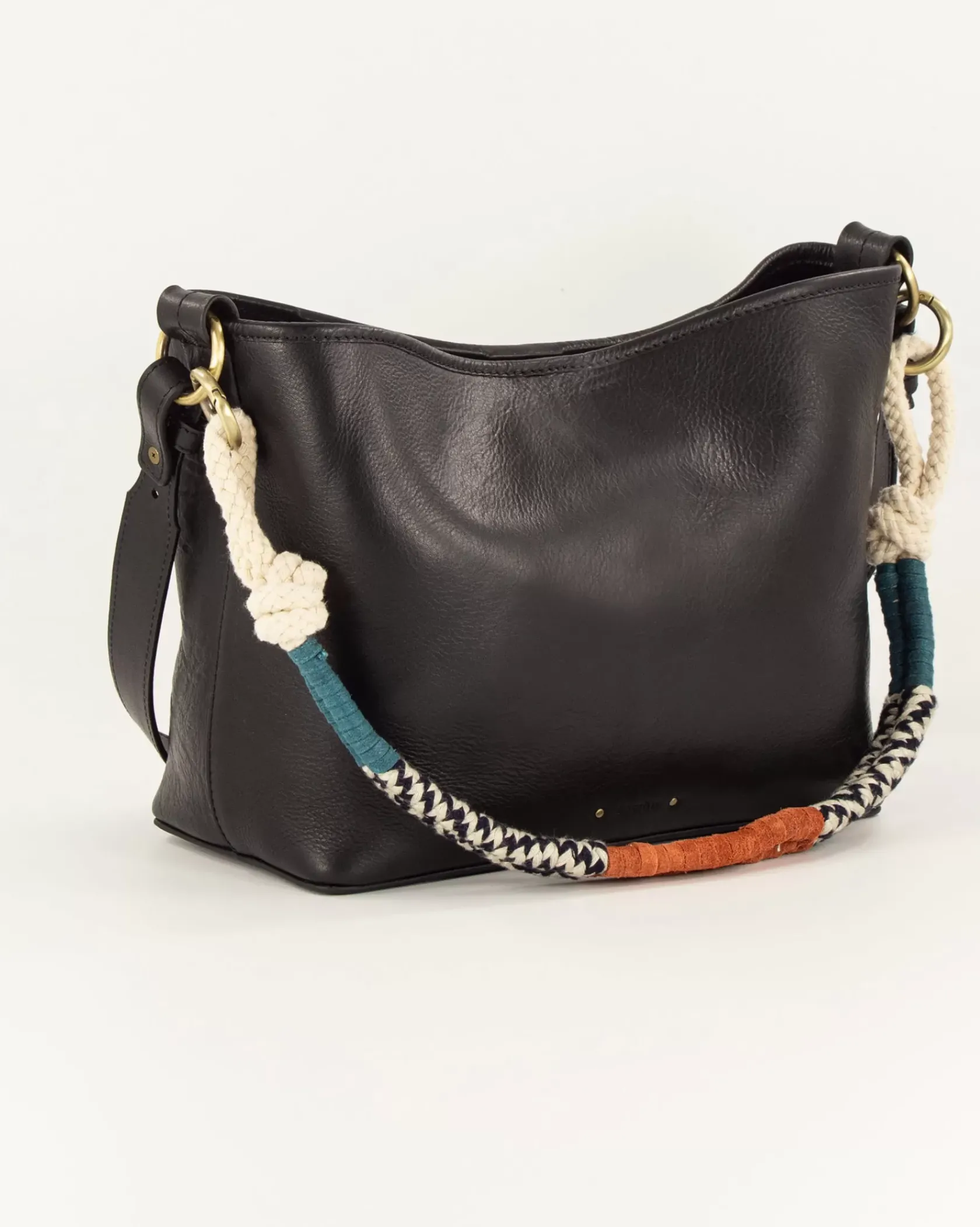 Sac en cuir de vache, jeu de anses corde tressée fantaisie et anse cuir.