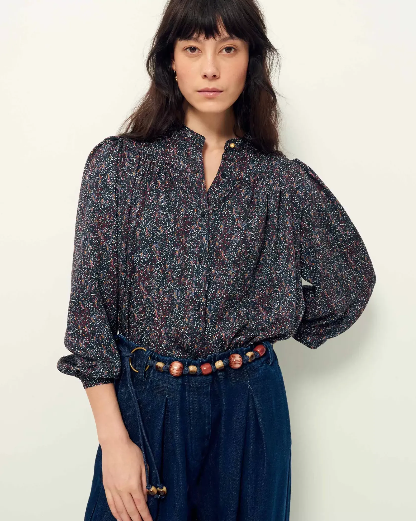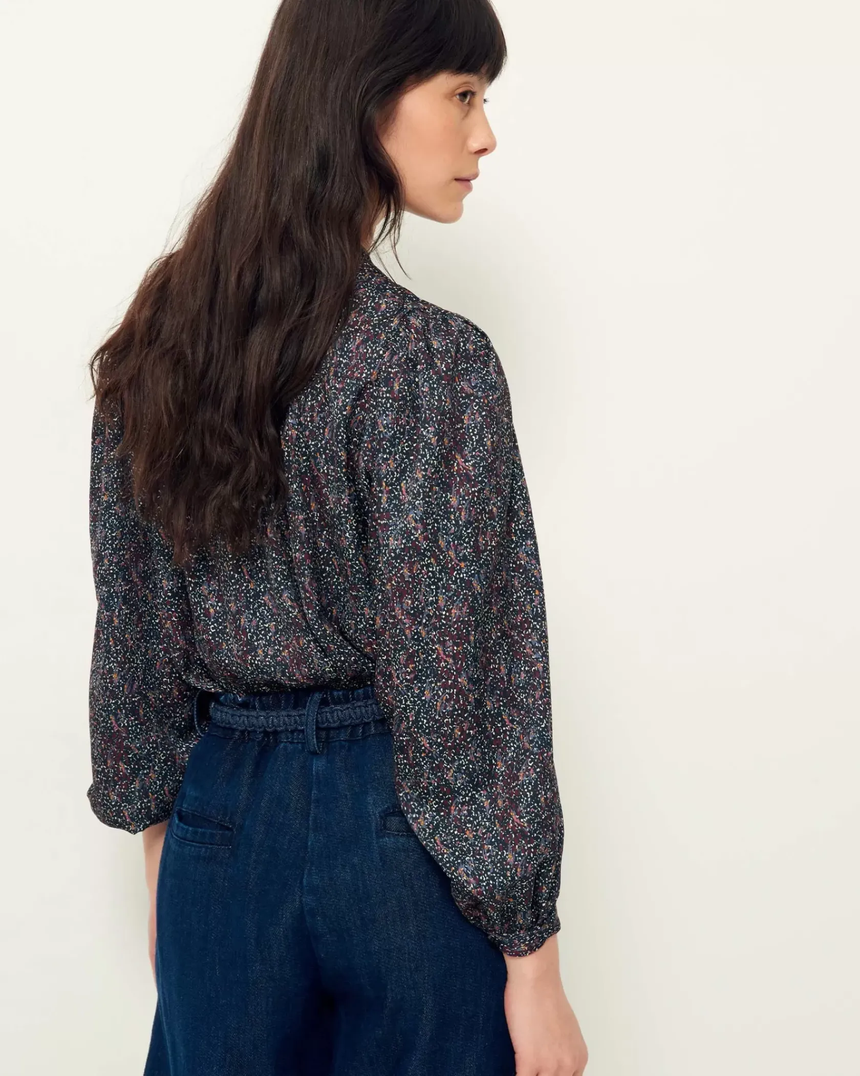 Blouse froncée et manches ballon en satin fluide de viscose.