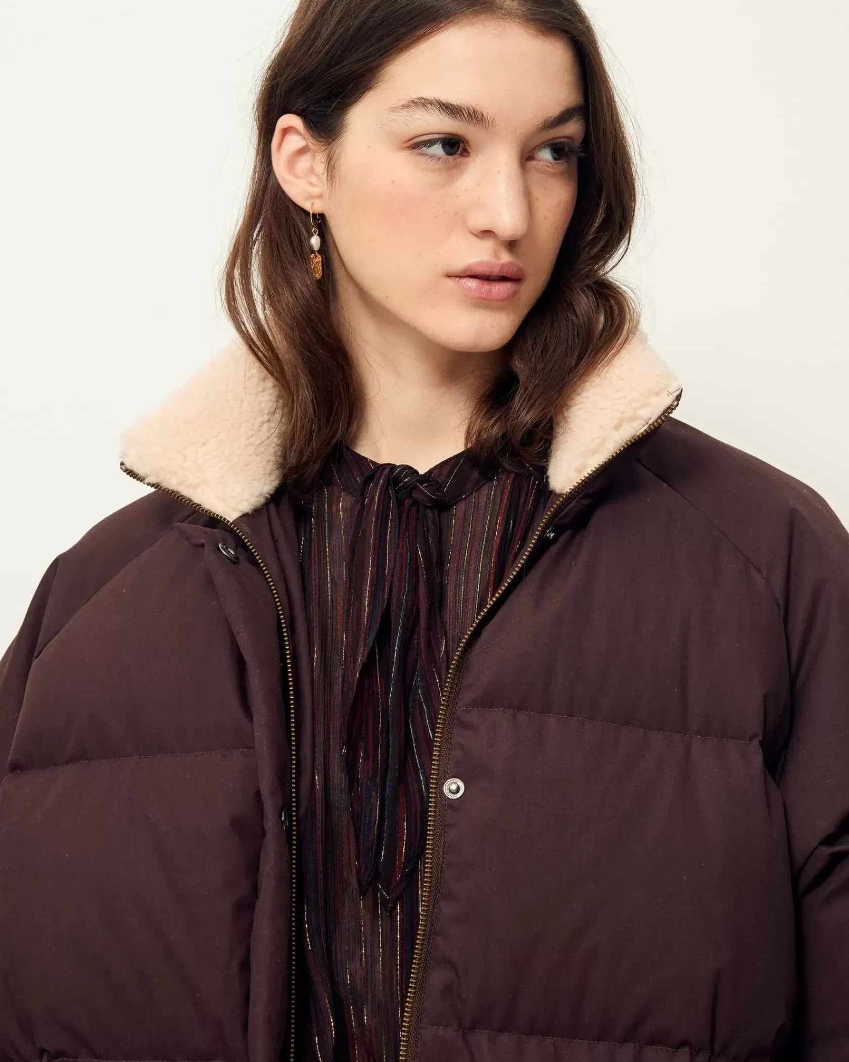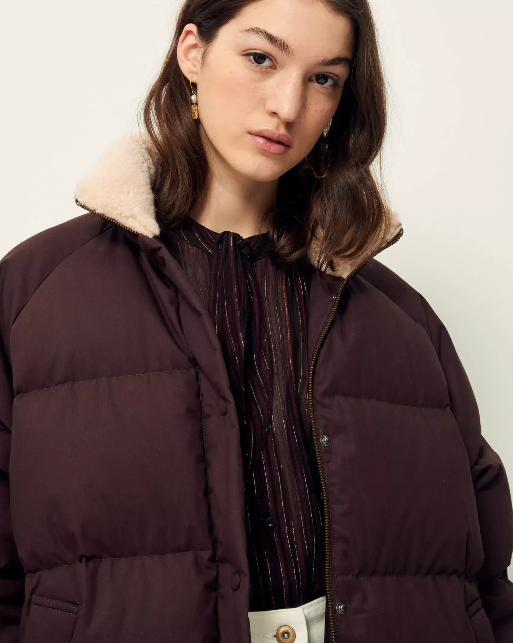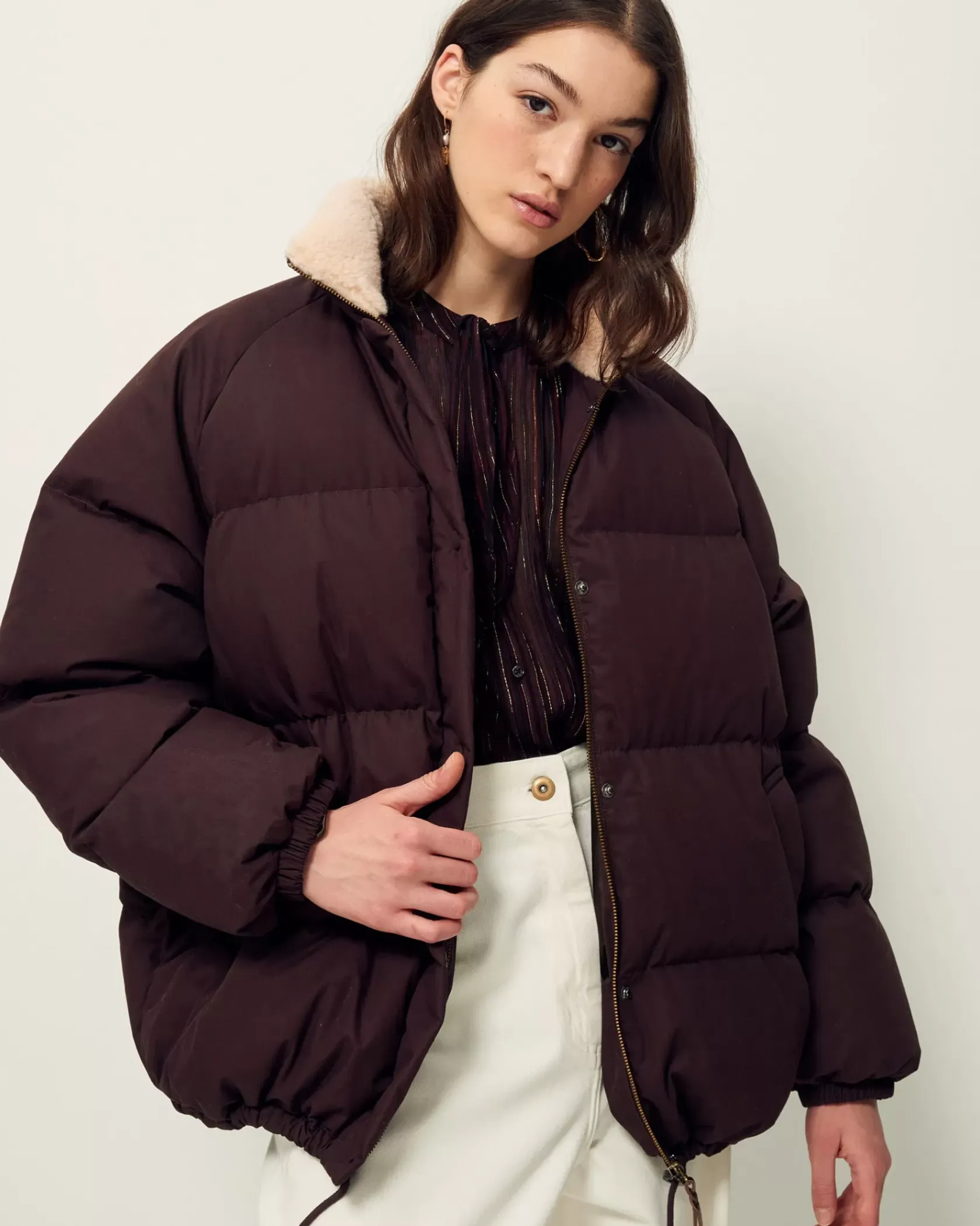 Doudoune légèrement oversize à col montant doublé de fausse fourrure de mouton en toile compacte de coton déperlante ouatinée, garnissage en duvet et plumes d’origine naturelle certifiée.