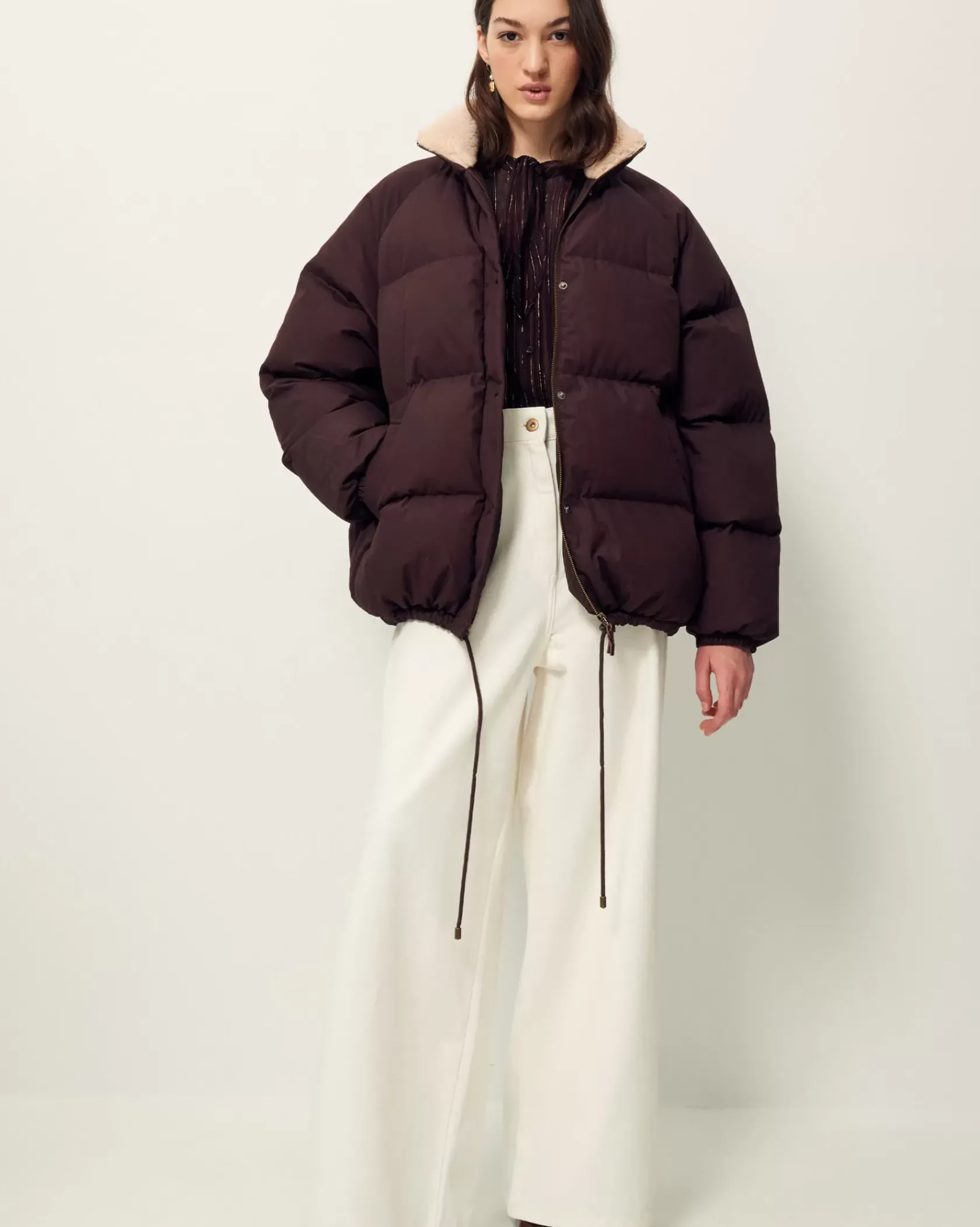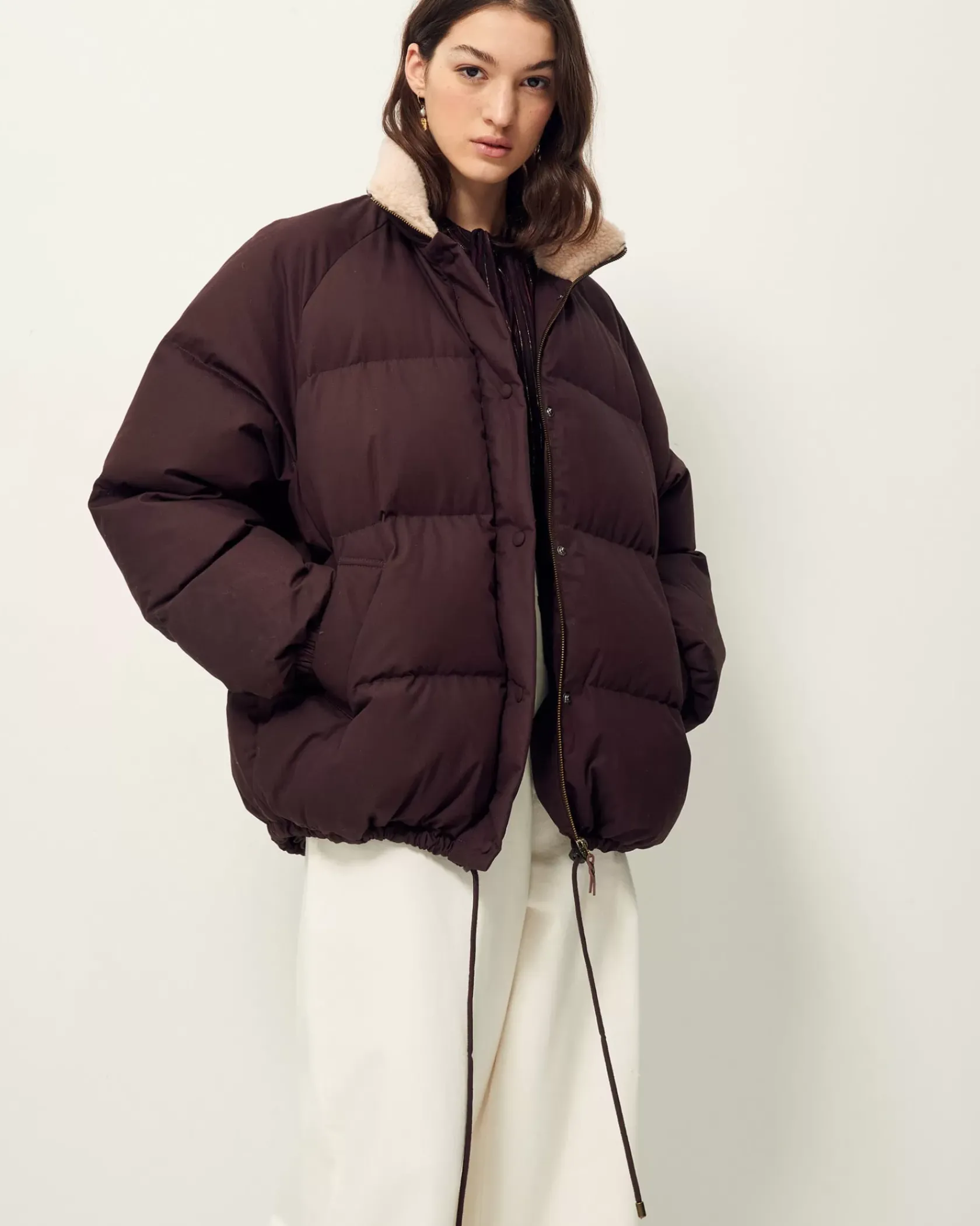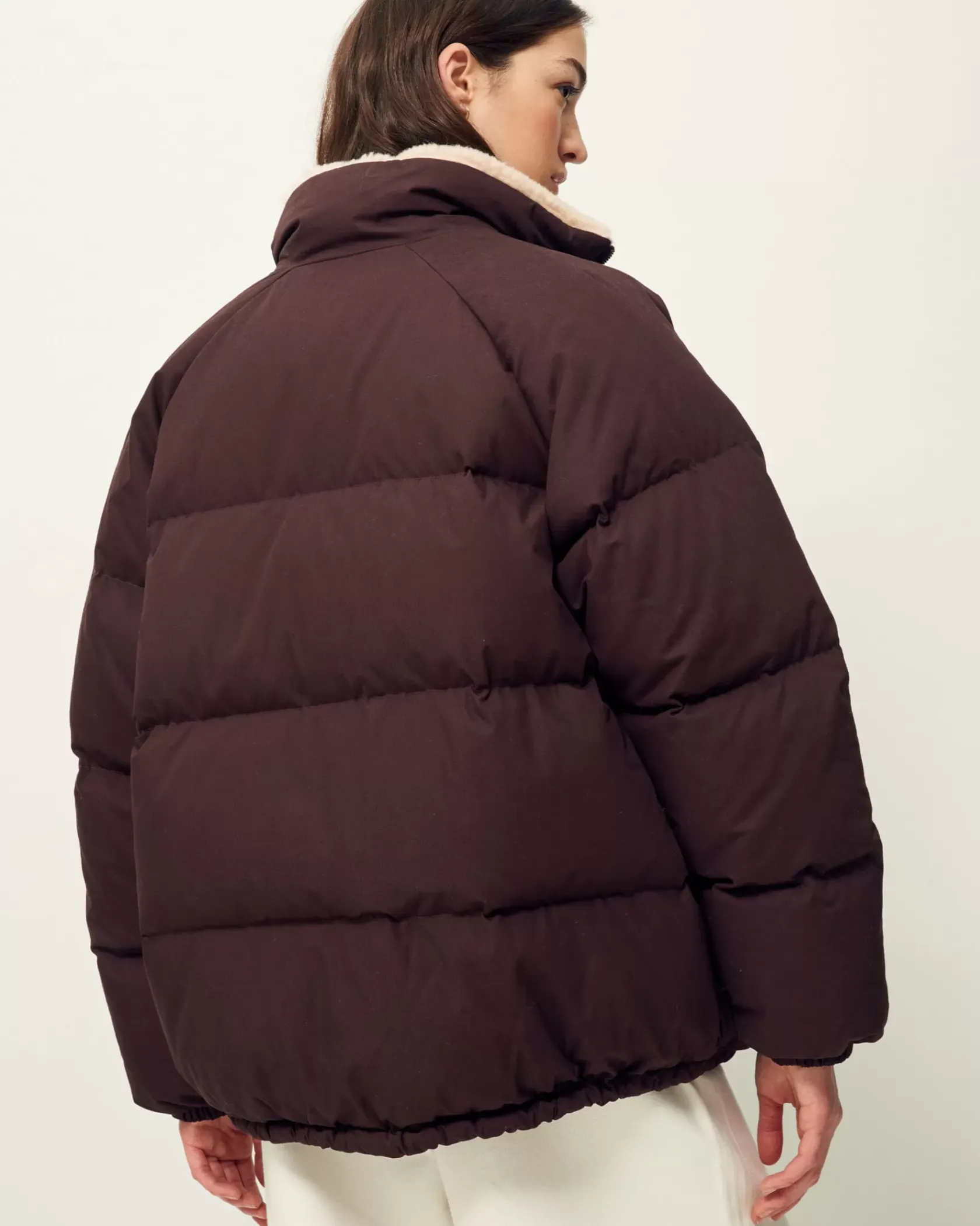 Doudoune légèrement oversize à col montant doublé de fausse fourrure de mouton en toile compacte de coton déperlante ouatinée, garnissage en duvet et plumes d’origine naturelle certifiée.