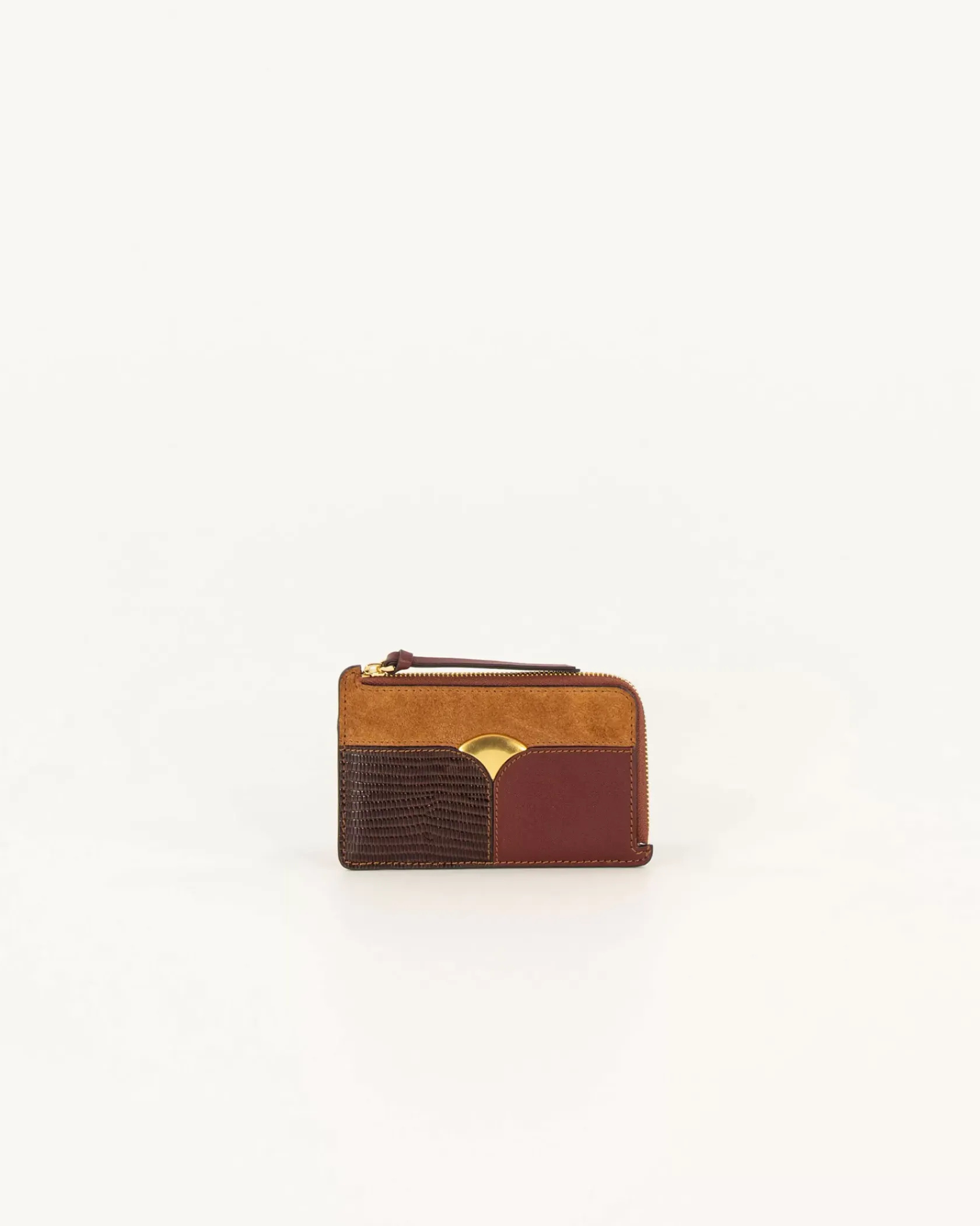 Porte-cartes et monnaie avec empiècements de cuirs en cuir de vache lisse et cuir de vache suédé. Pièce métallique décorative, développement propre à Sessùn.