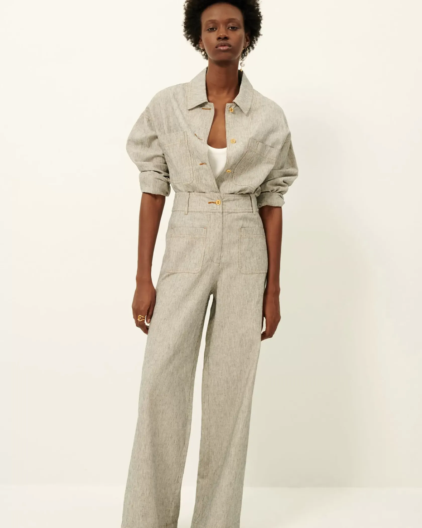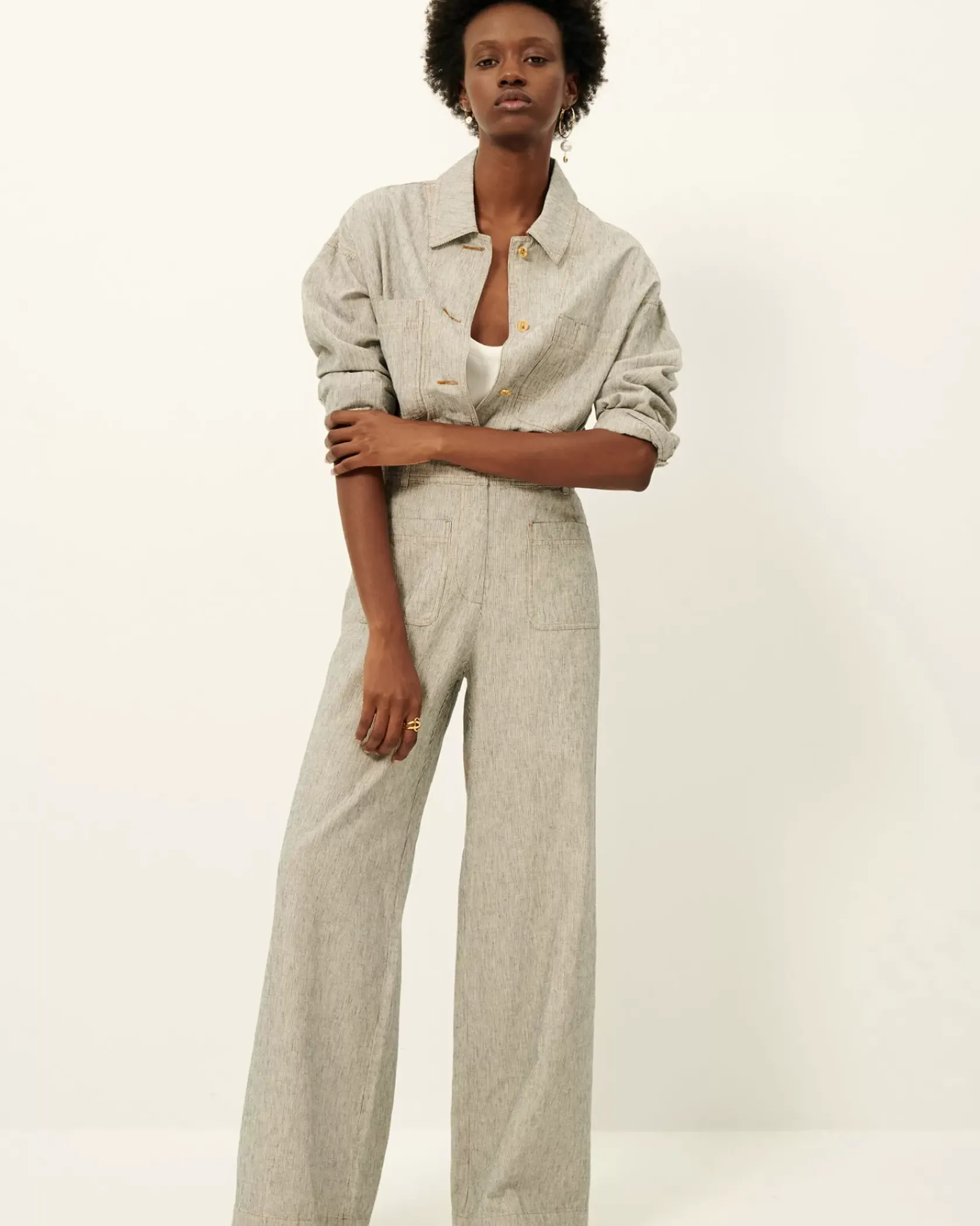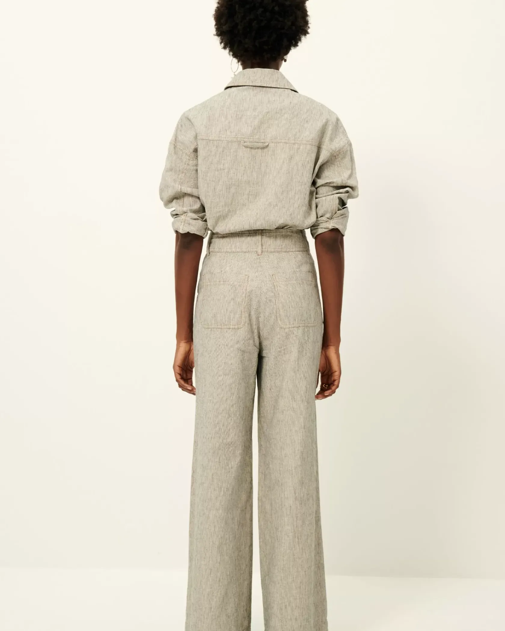 Pantalon évasé taille haute en toile armurée lin / coton rayée bicolore de fil flammé tissée en Espagne, surpiqûres contrastées en détail.