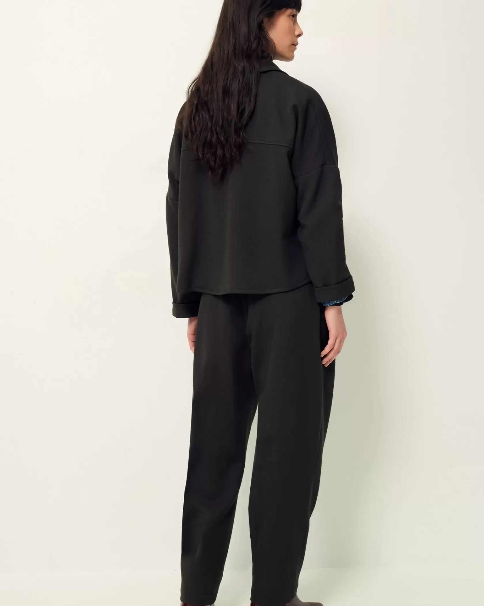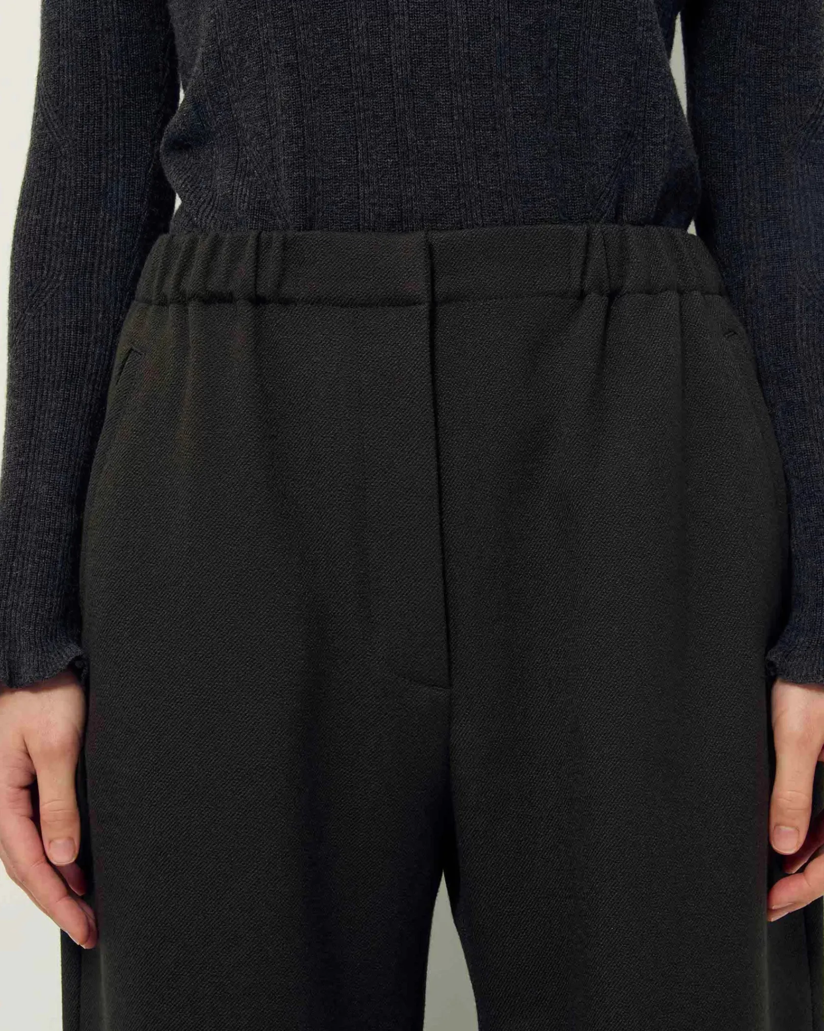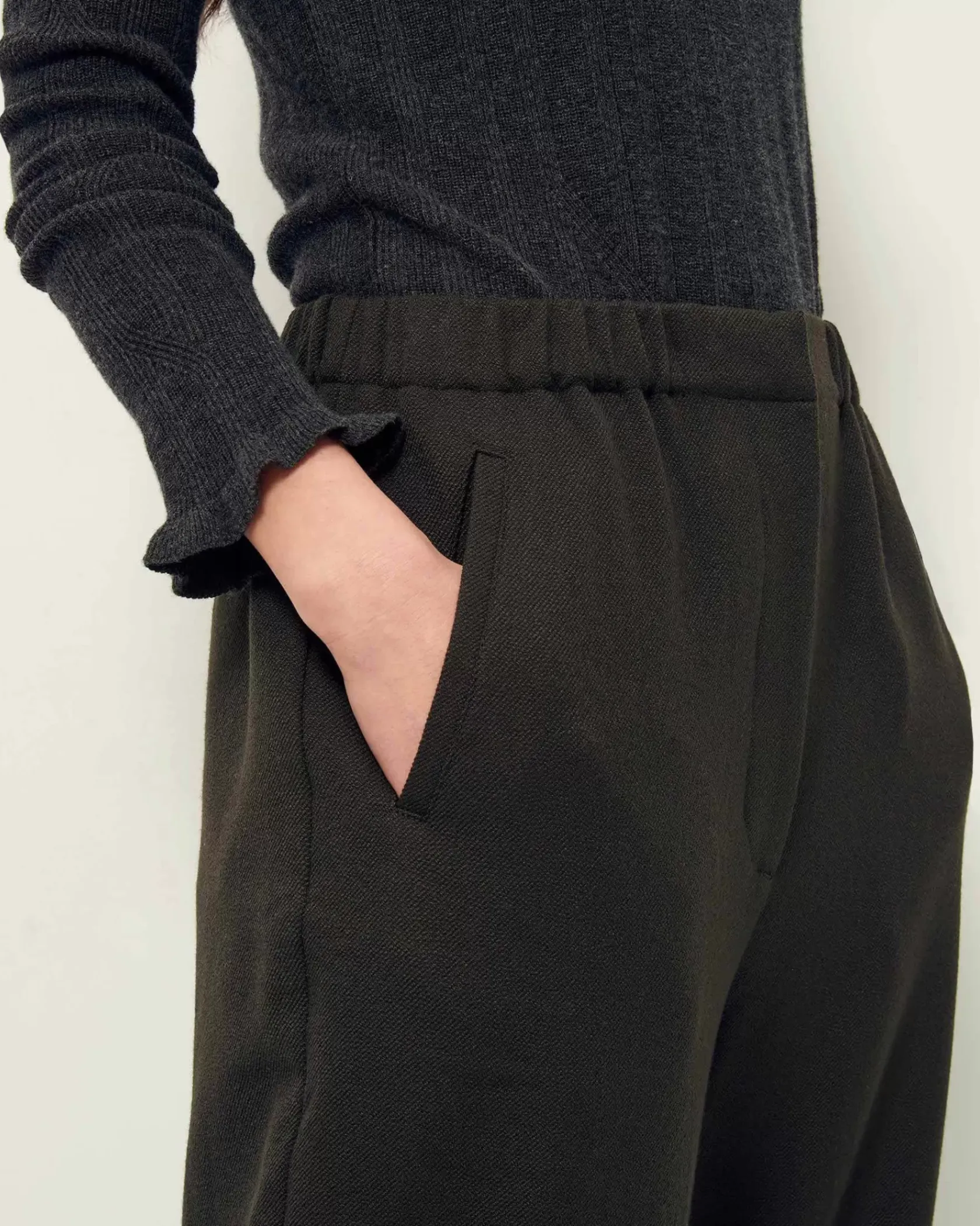 Pantalon ceinture élastiquée resserré en bas de jambes en tricotine tissée au Portugal.