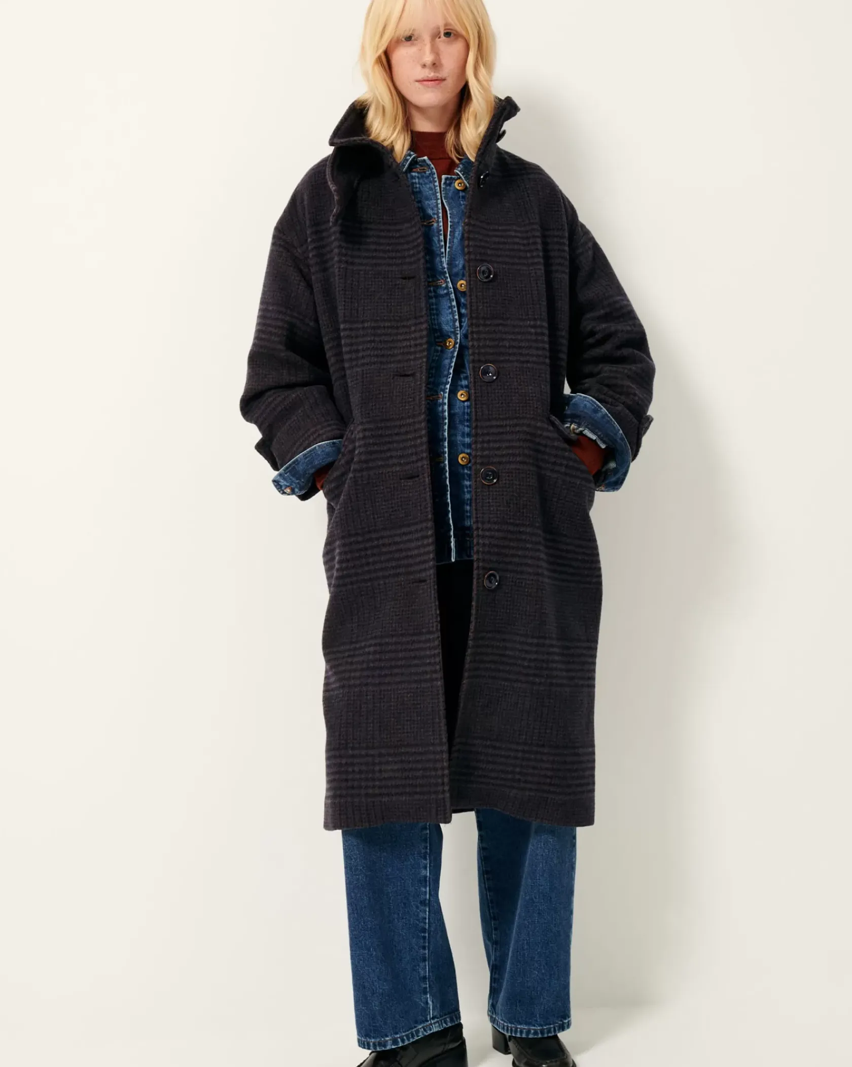 Manteau long col montant simple boutonnage en tartan double tissage finition velvet, tissé en Italie.
