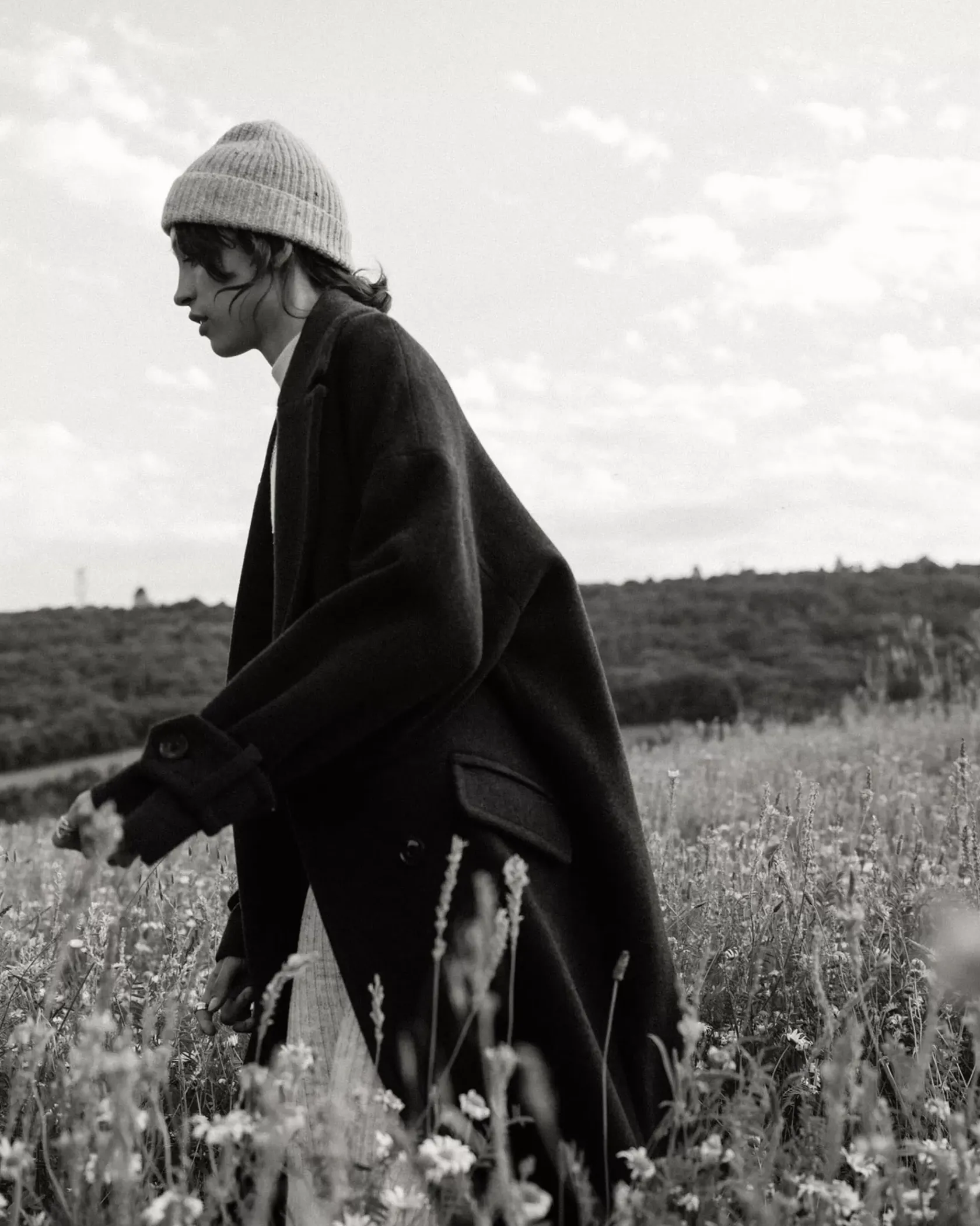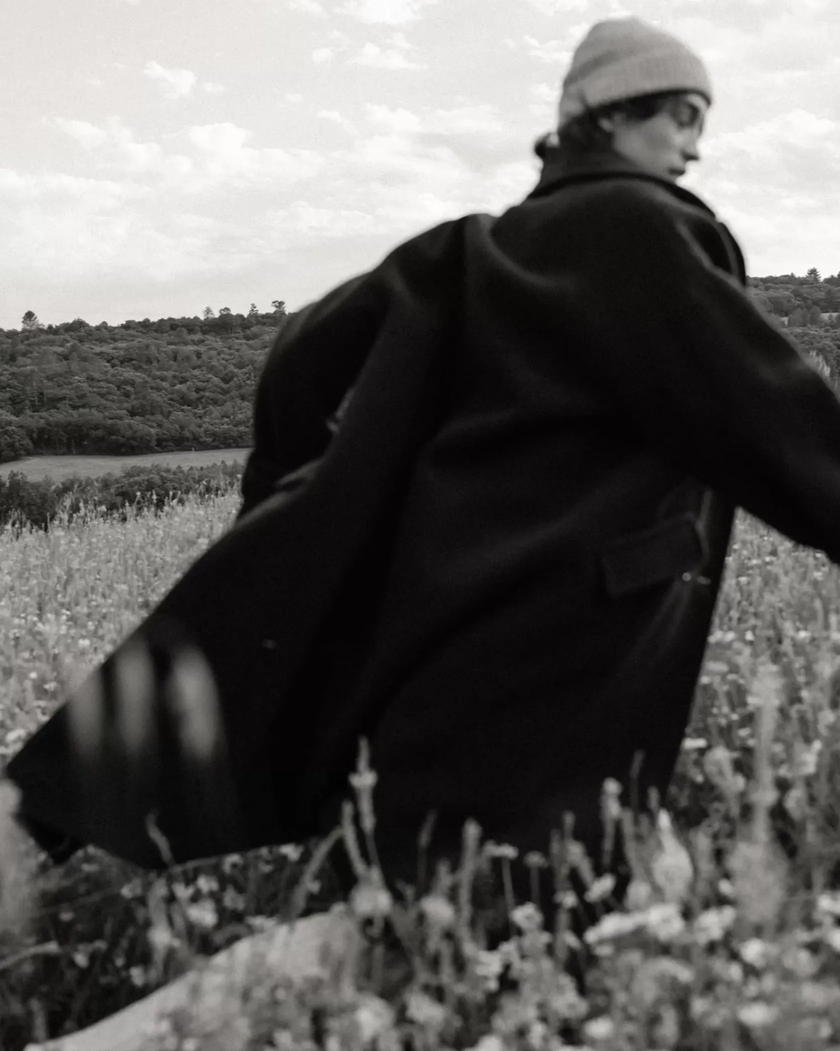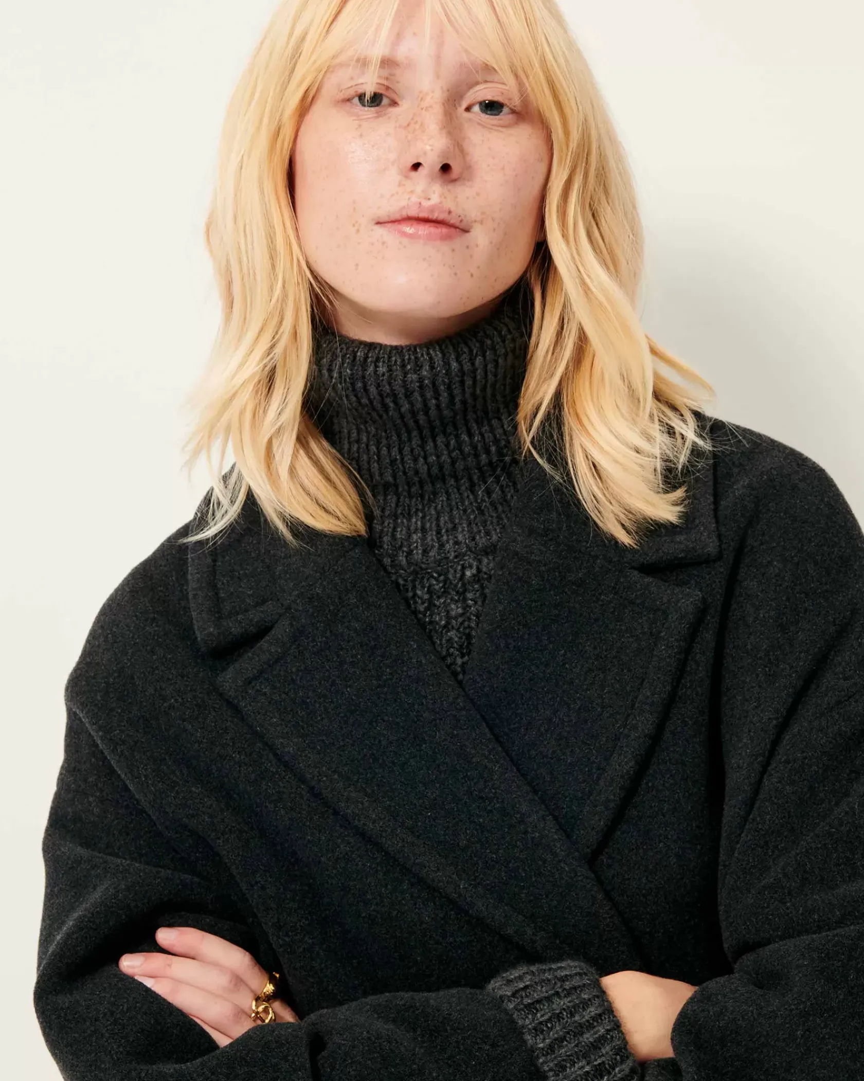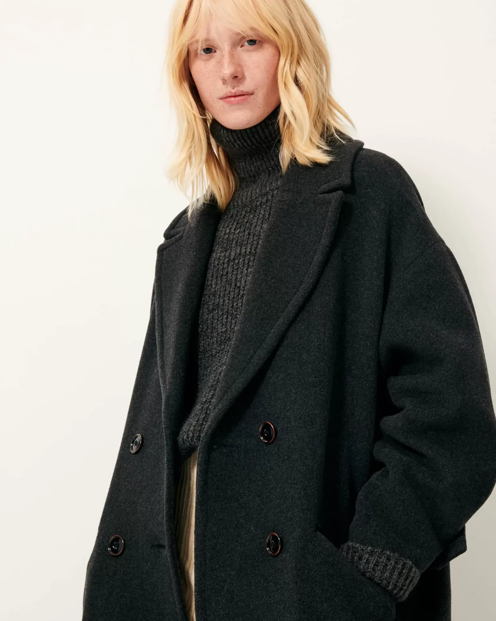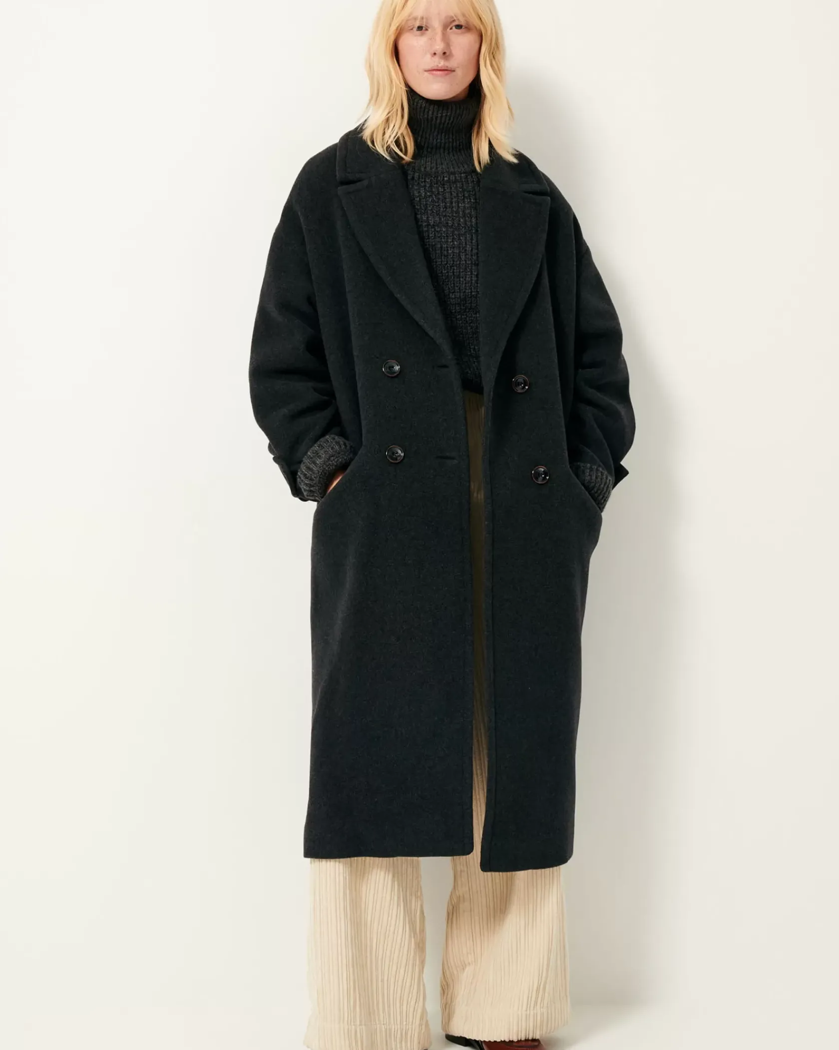 Manteau long à double boutonnage en double tissage melton finition velvet tissé en Italie.