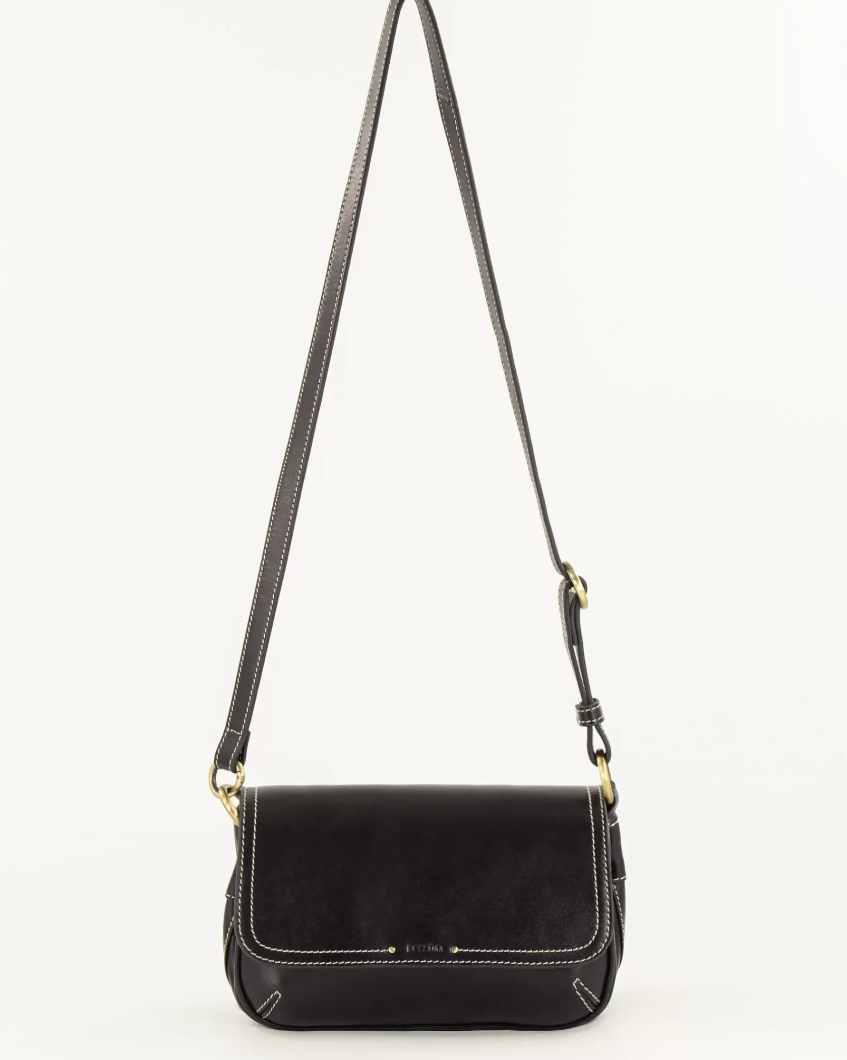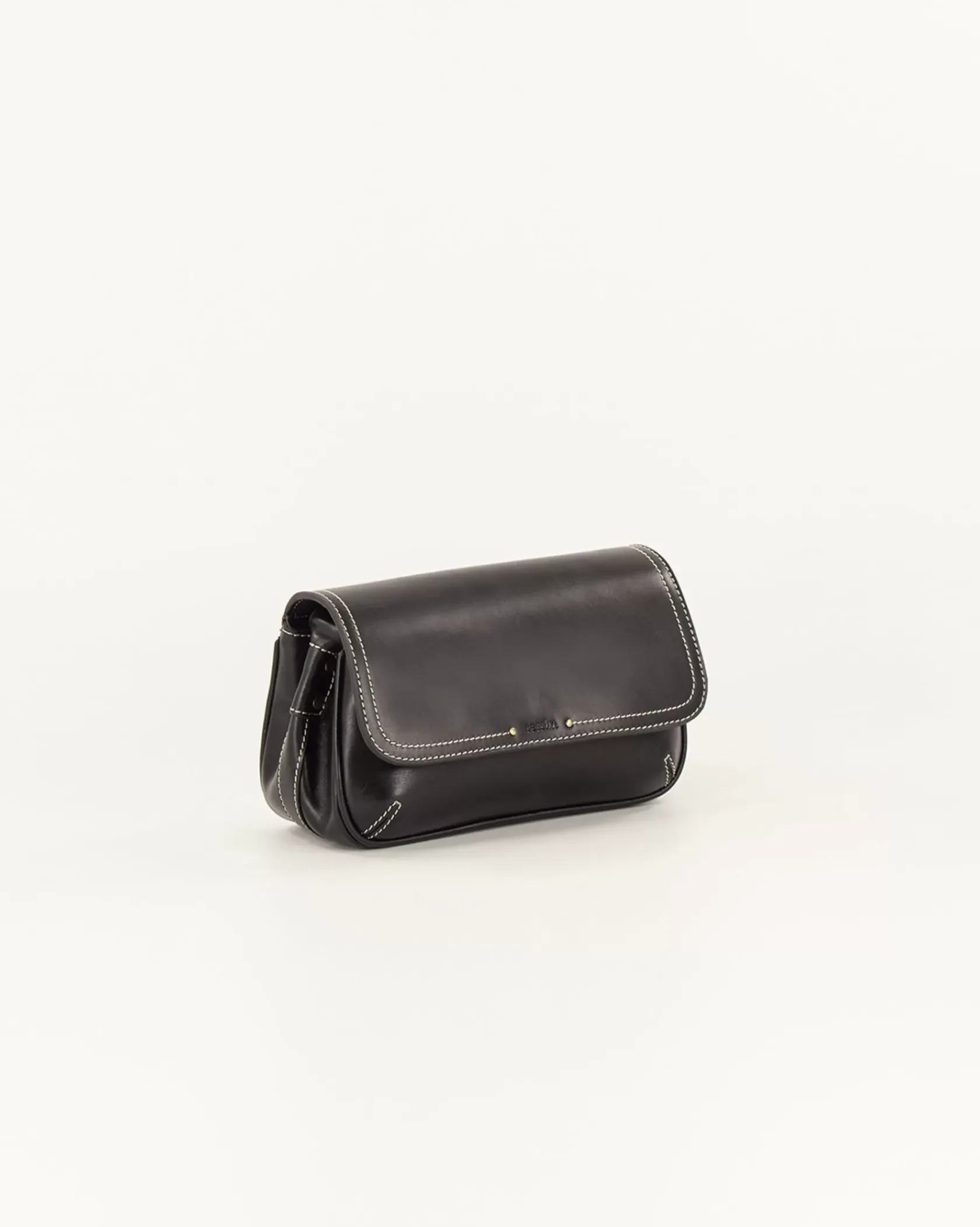 Sac baguette en cuir de vache avec fils de surpiqûres contrastés, bandoulière réglable.