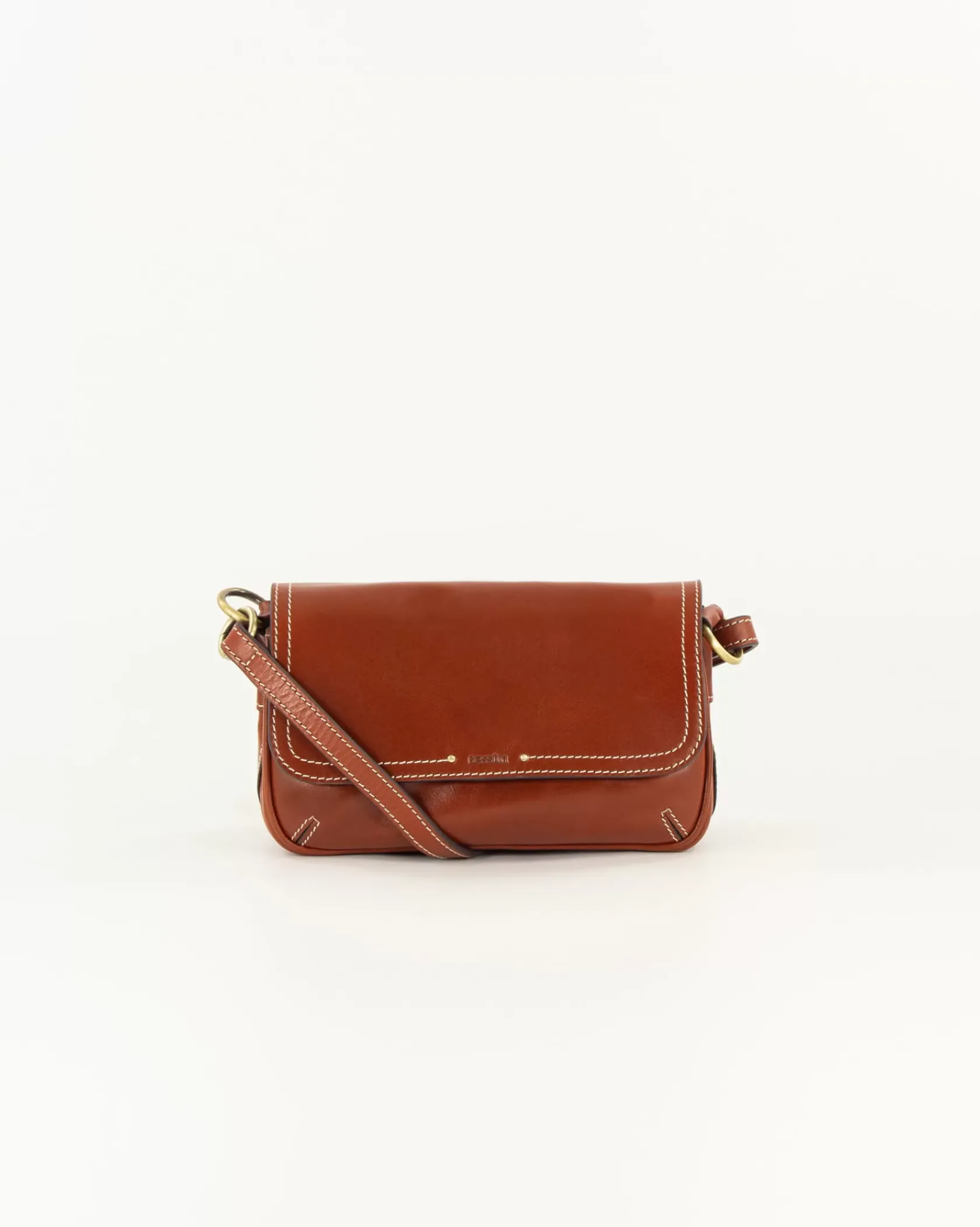 Sac baguette en cuir de vache avec fils de surpiqûres contrastés, bandoulière réglable.