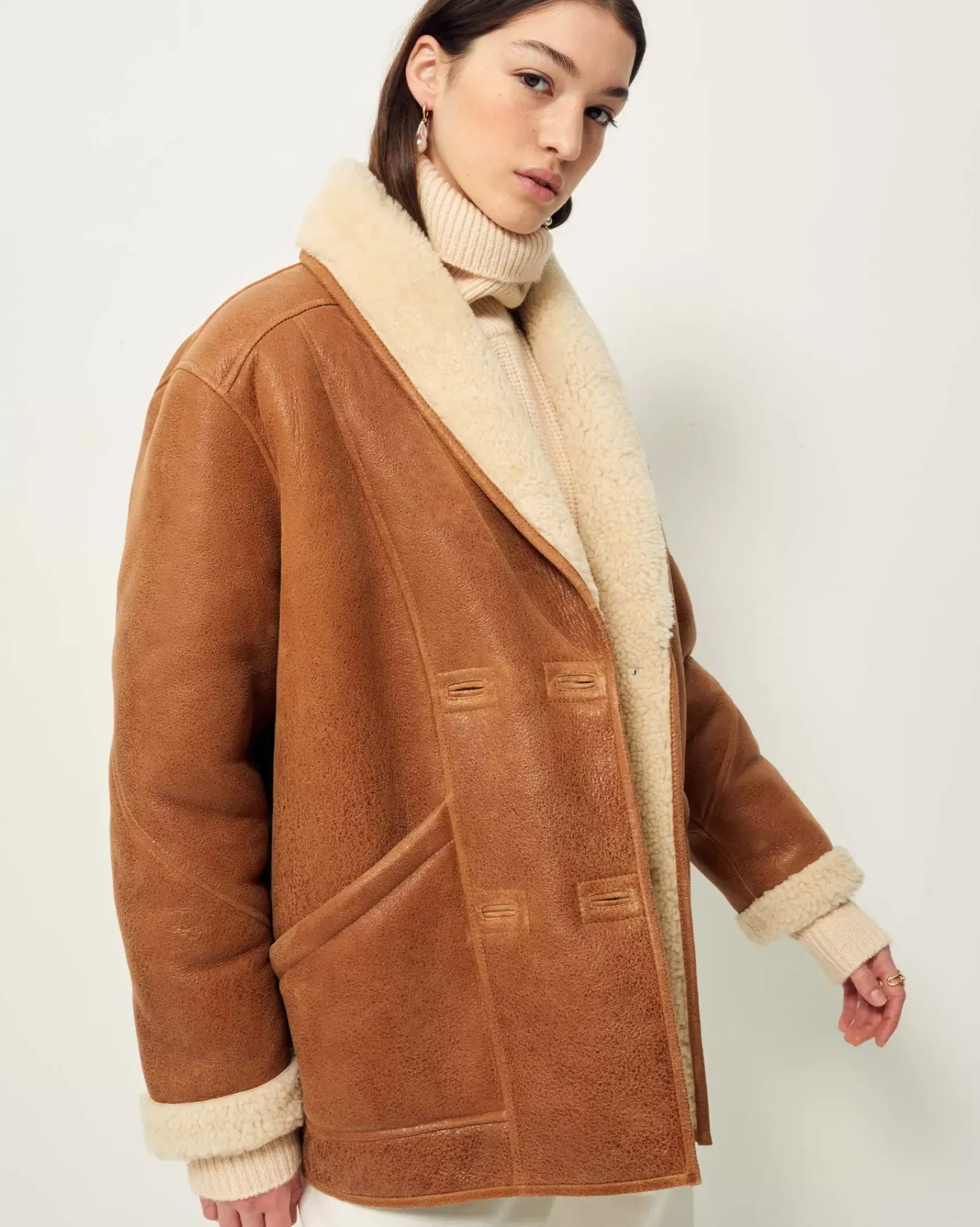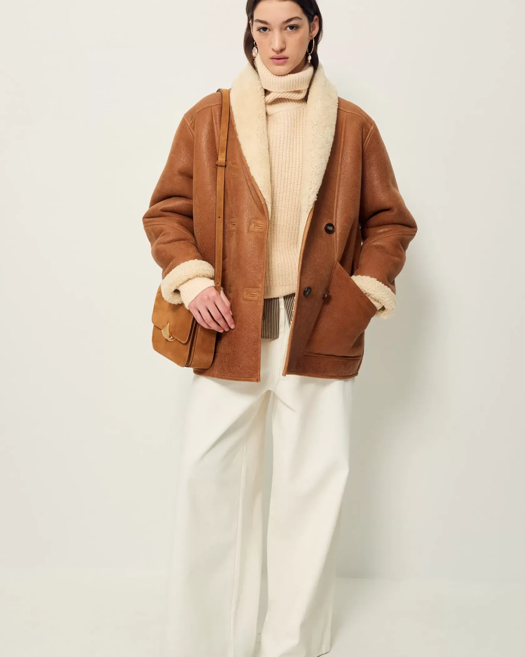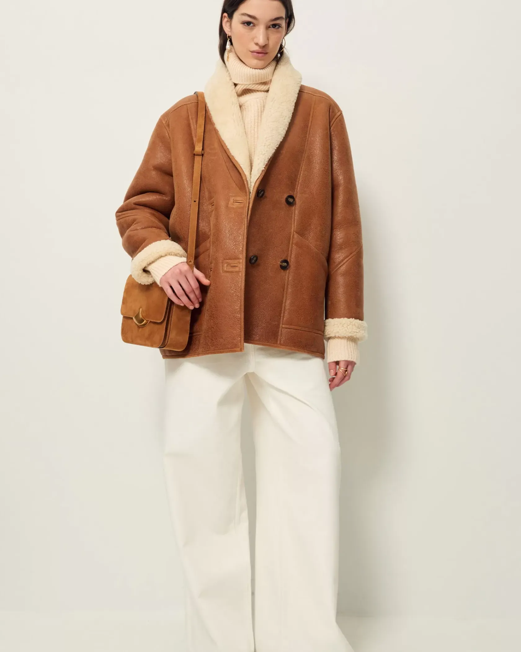 Manteau court esprit Canadienne en peau lainée de mouton, biais contrasté en cuir d’agneau à tannage végétal.