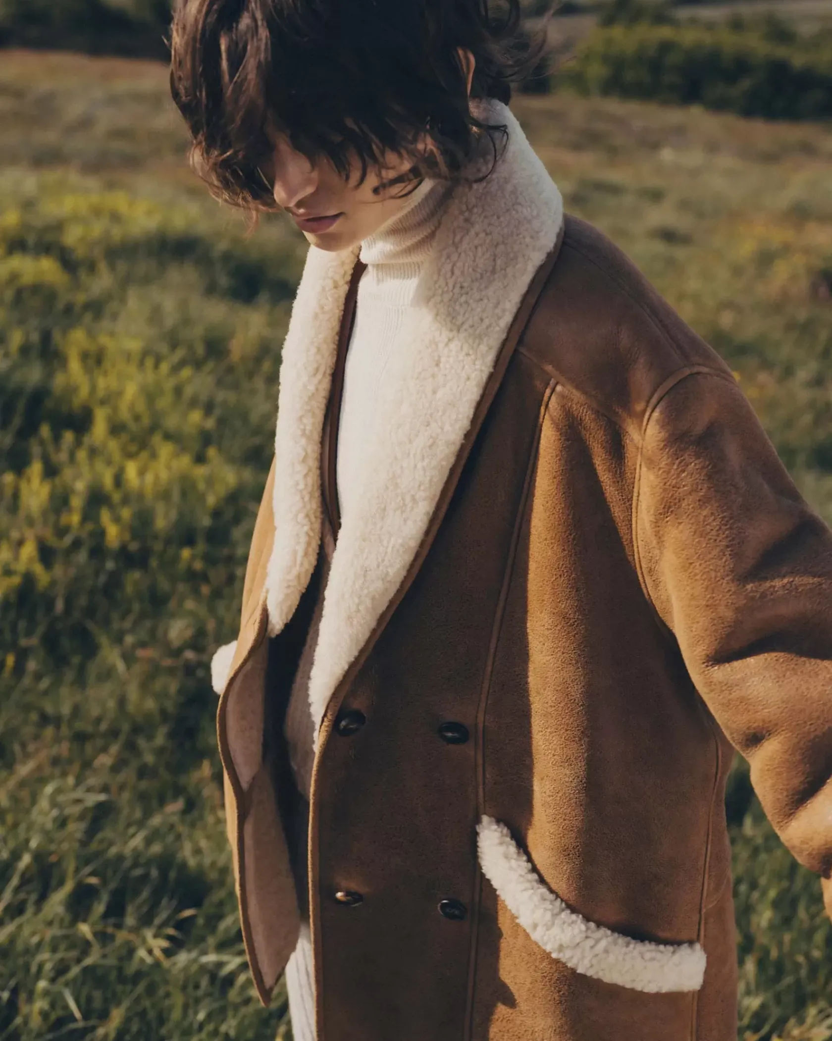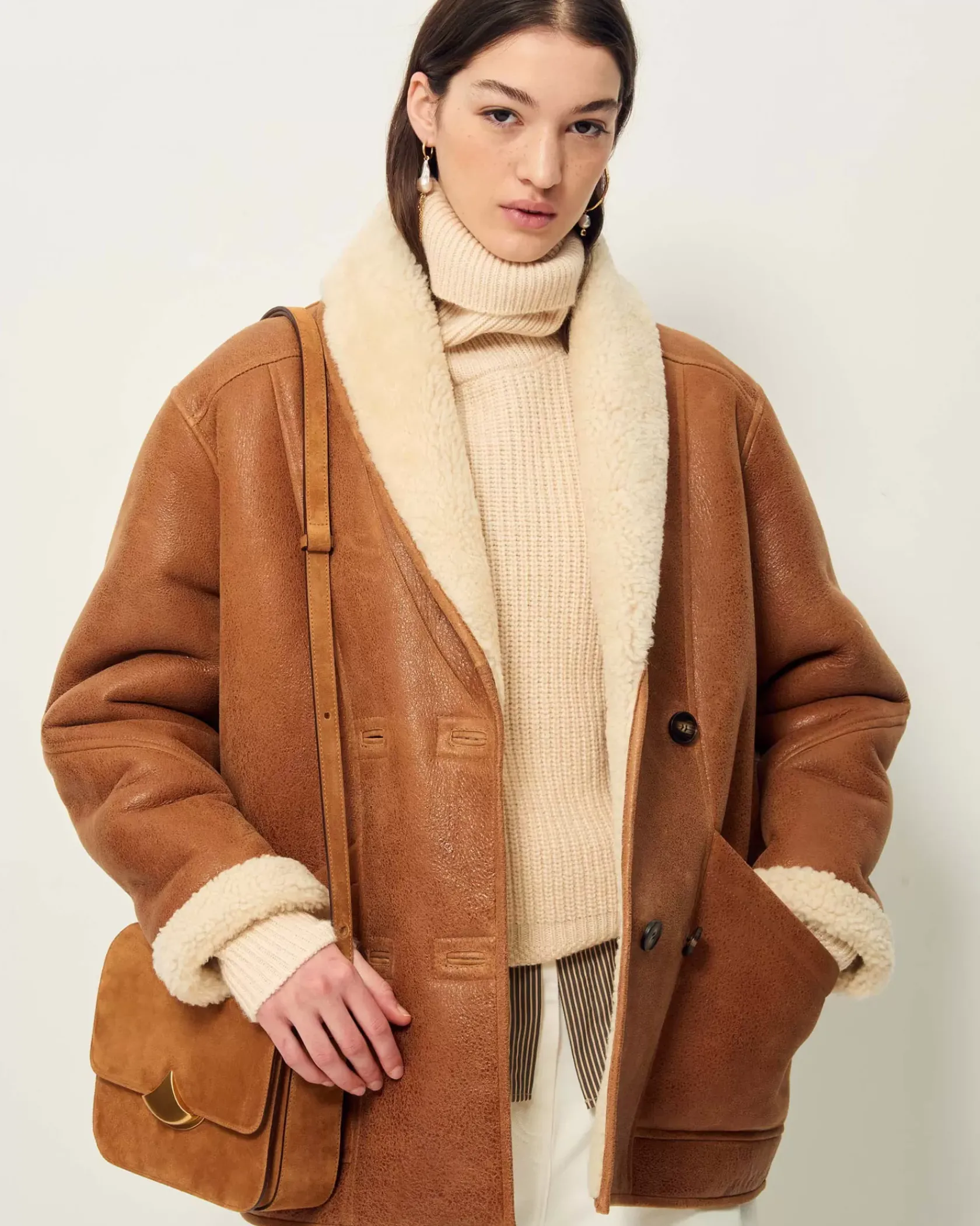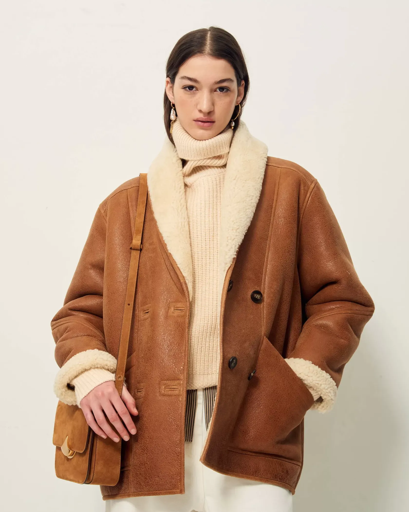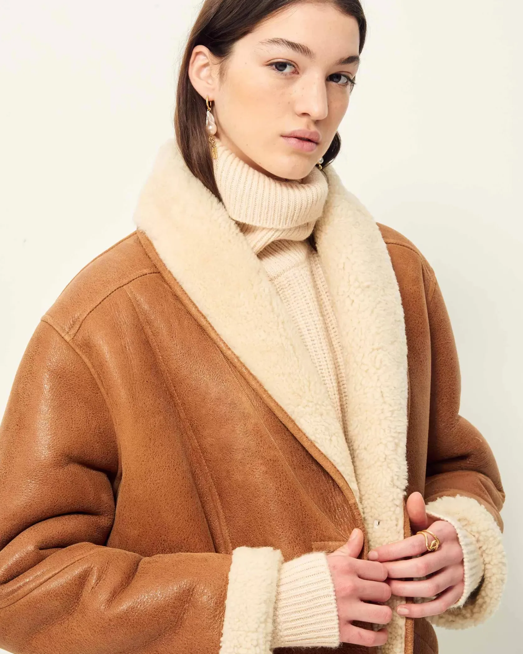 Manteau court esprit Canadienne en peau lainée de mouton, biais contrasté en cuir d’agneau à tannage végétal.