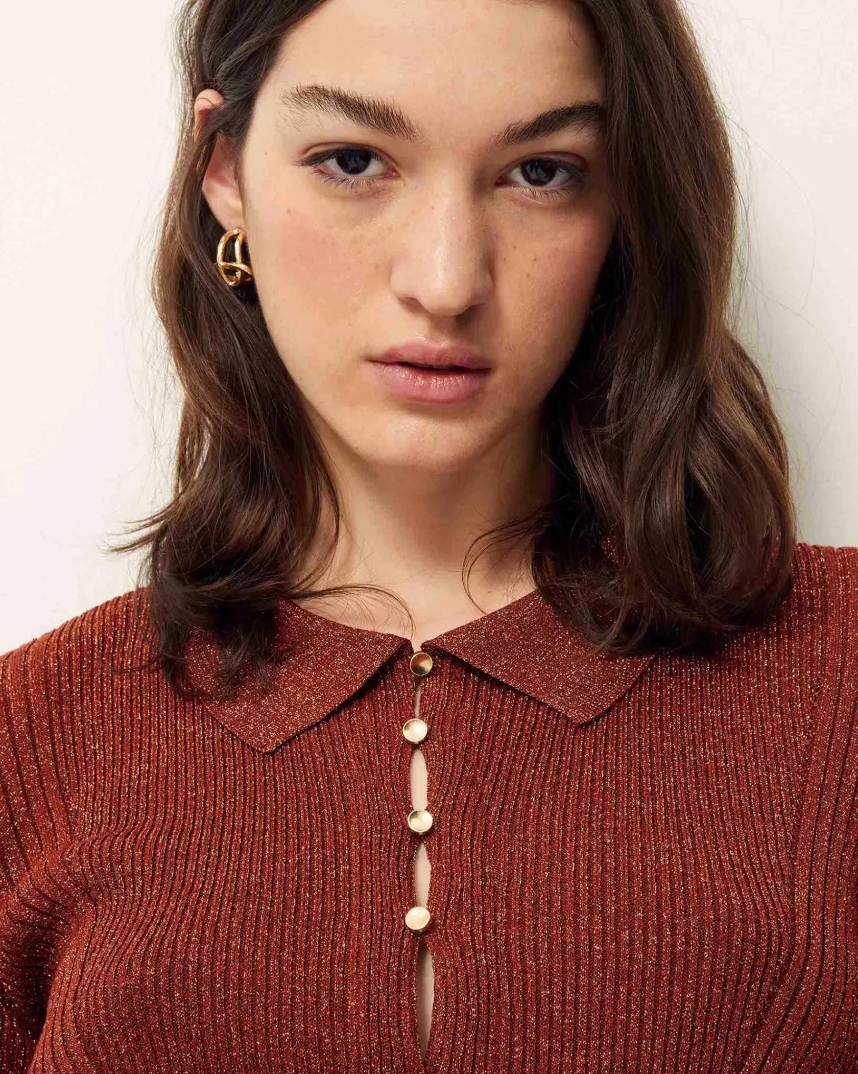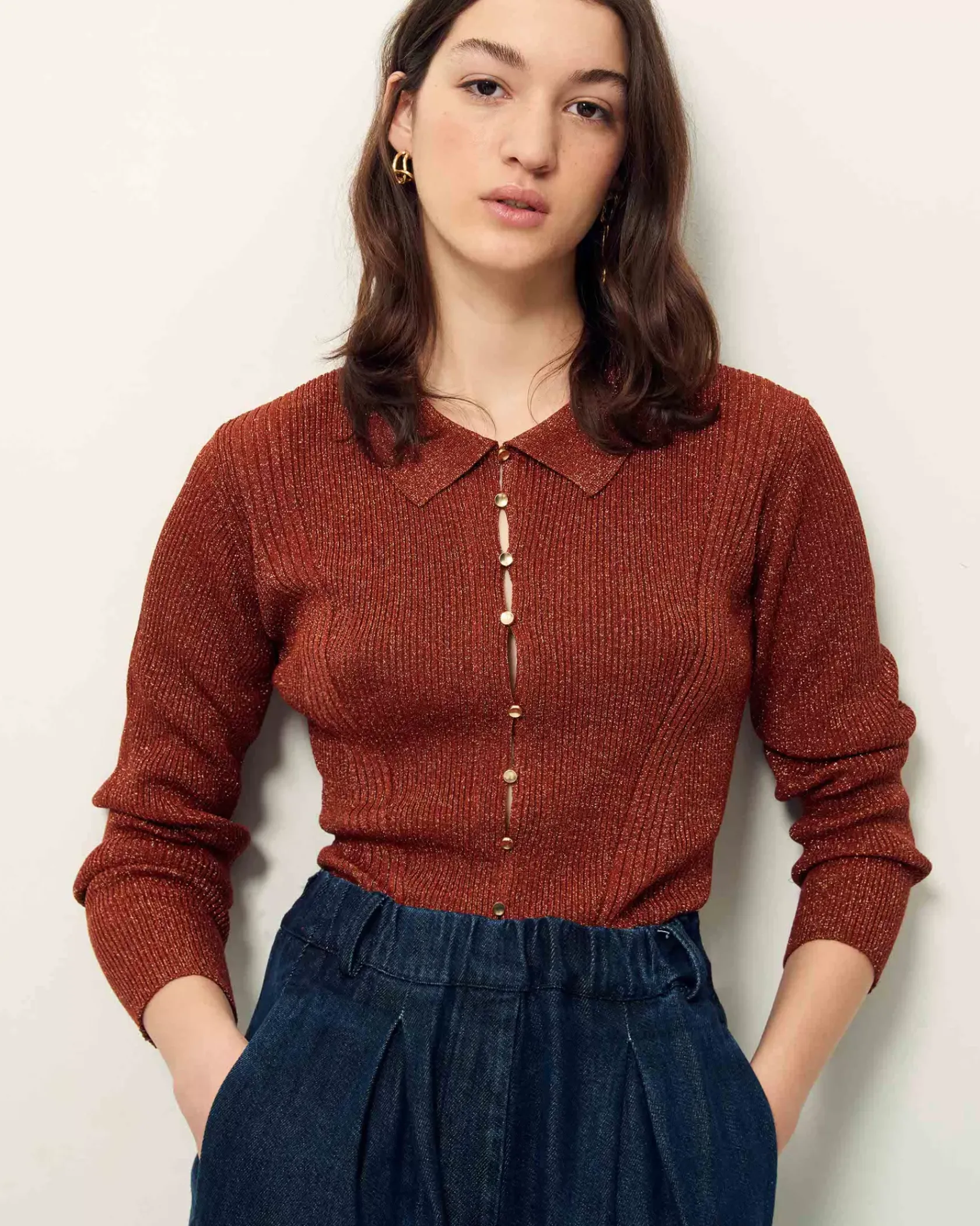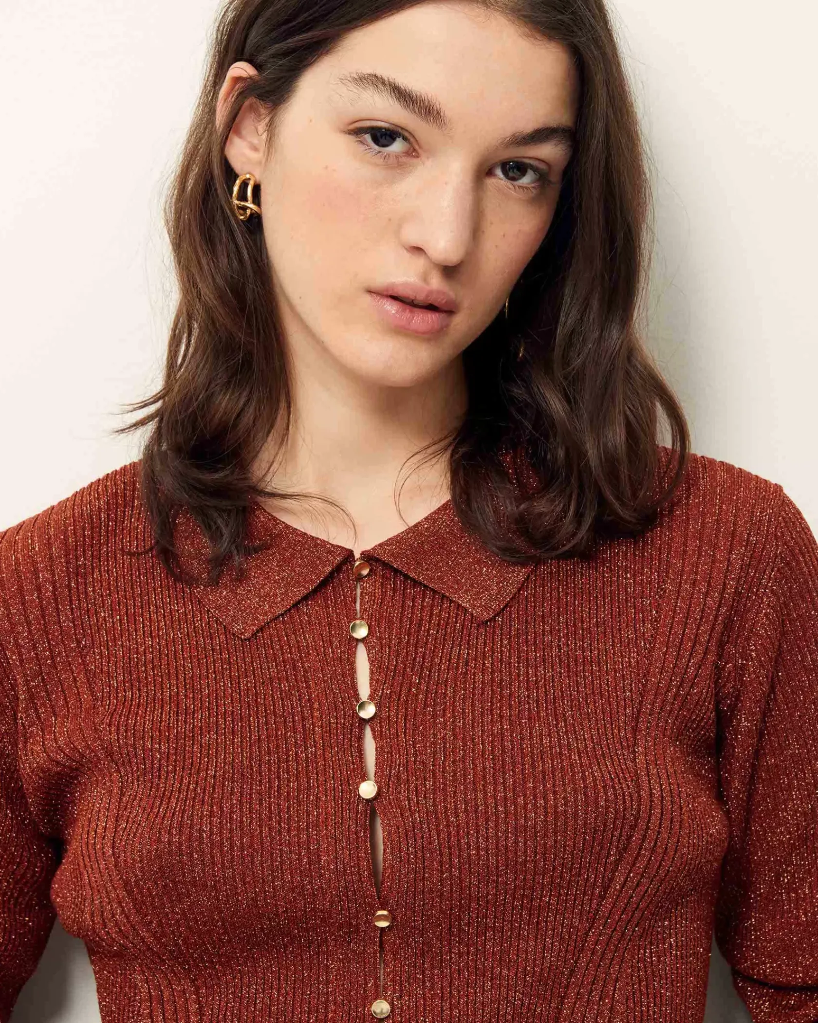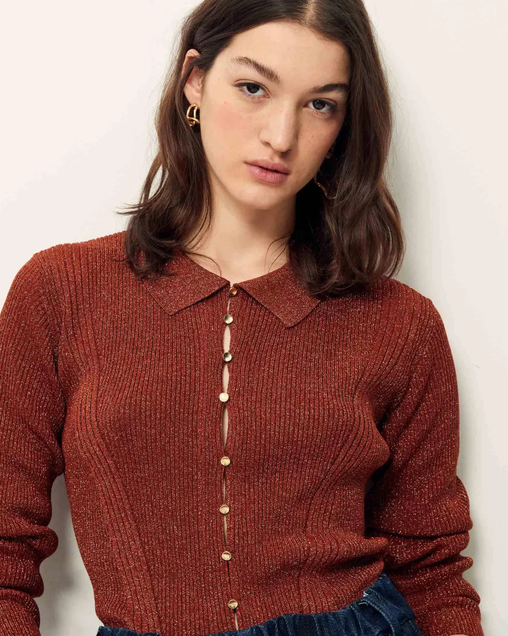 Polo ajusté en maille fine à côtes et métallisée.