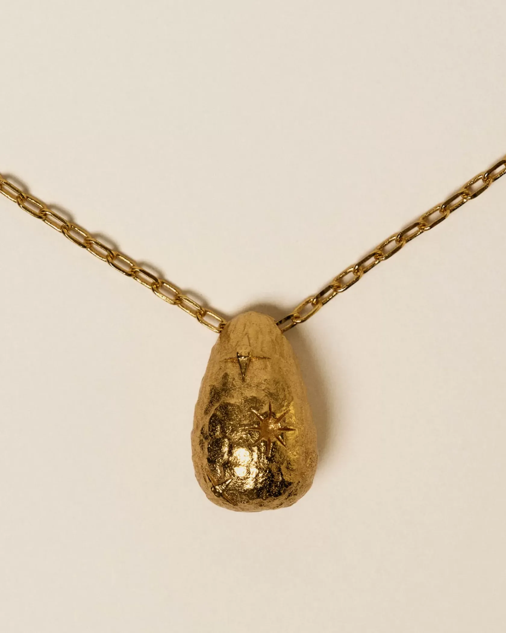 Collier pendentif en forme de goutte finition dorée avec effet matiéré et reliefs étoilés.