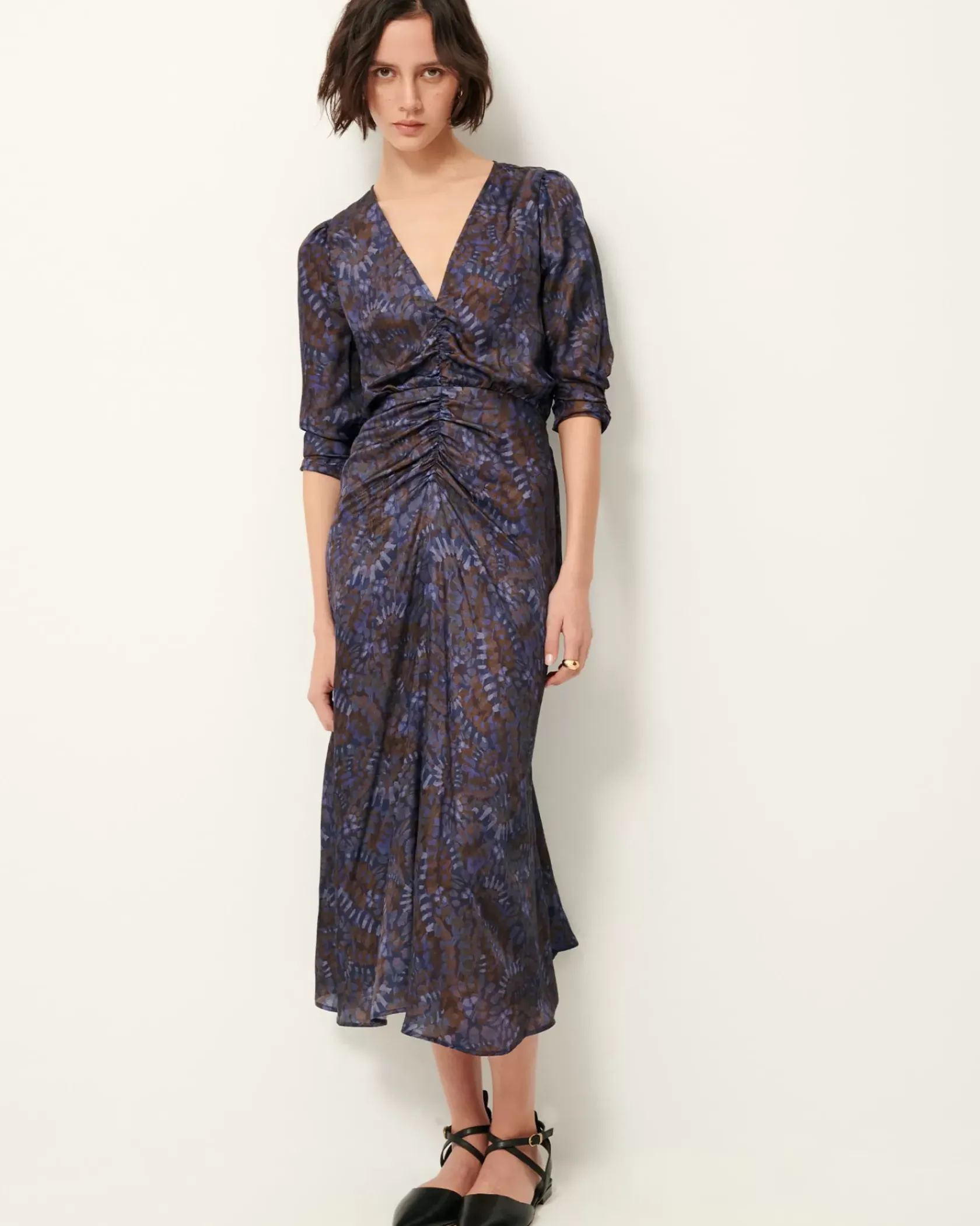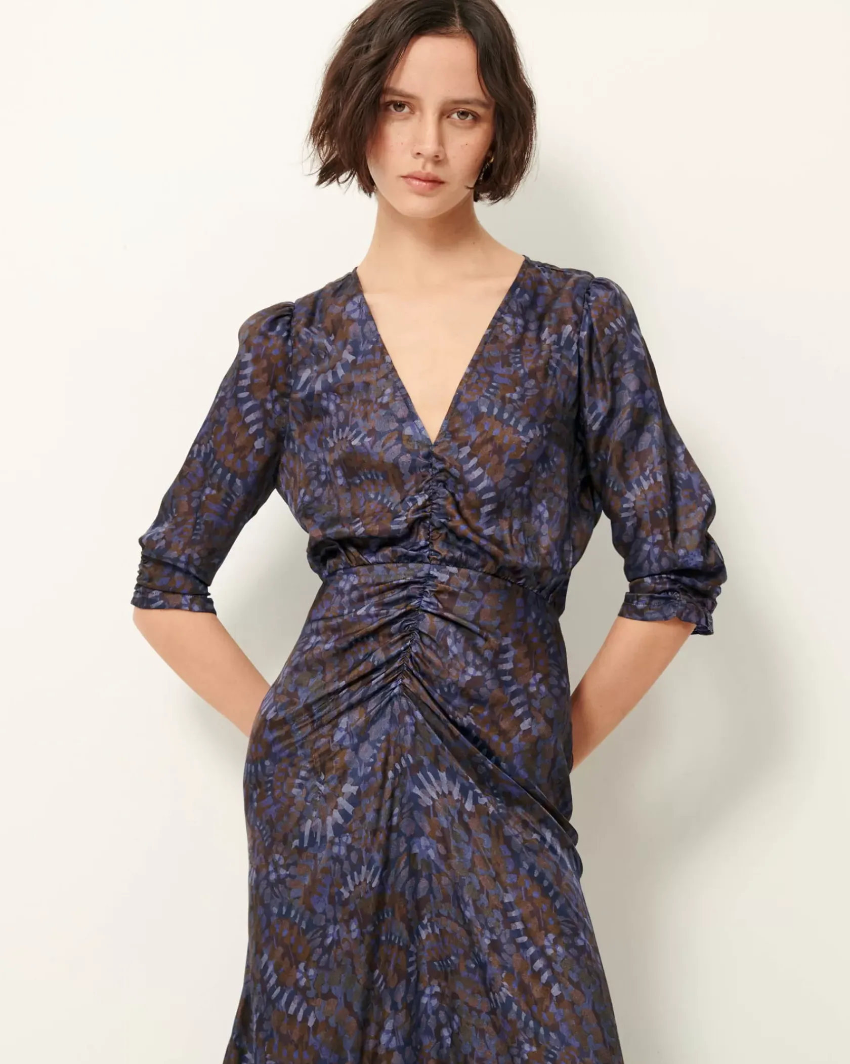 Robe longue décolletée avec détail de fronces et lien de resserrage à la taille en satin de viscose fluide imprimé, motif exclusif Sessùn, apprêté en Italie.