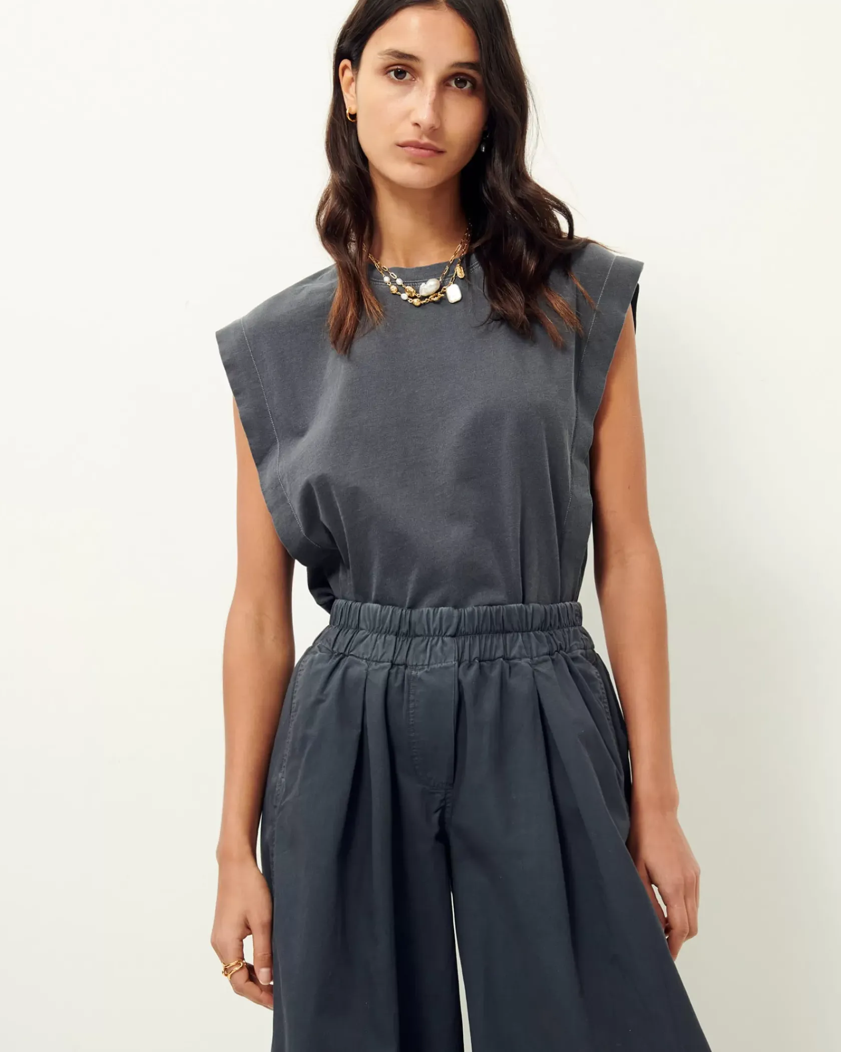 T-shirt sans manches à plis en jersey teint en pigmentaire, confectionné et teint artisanalement au Portugal.