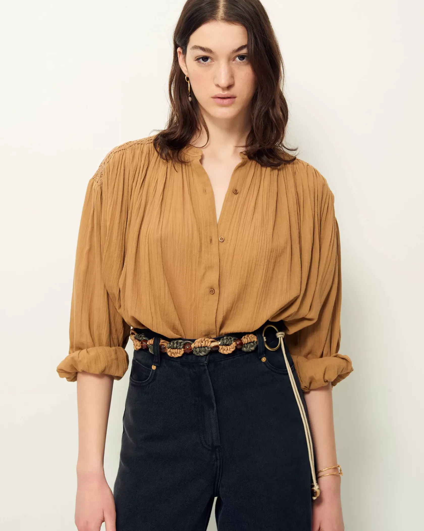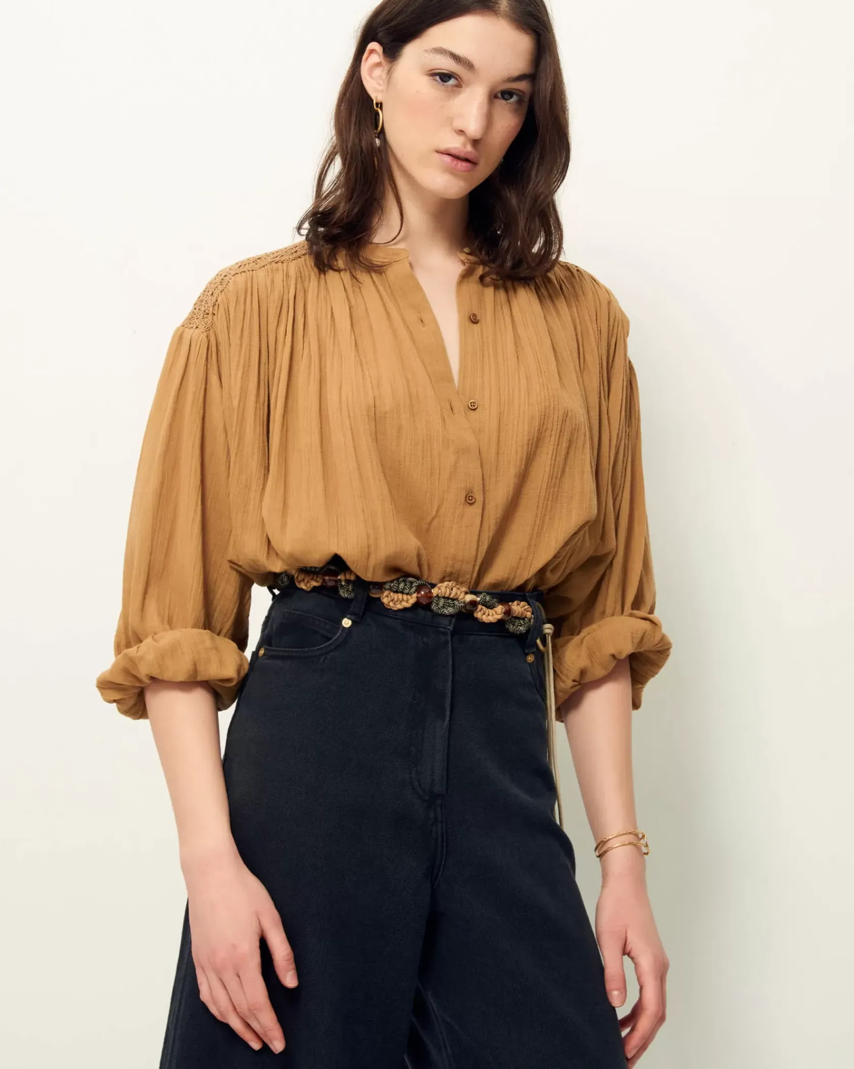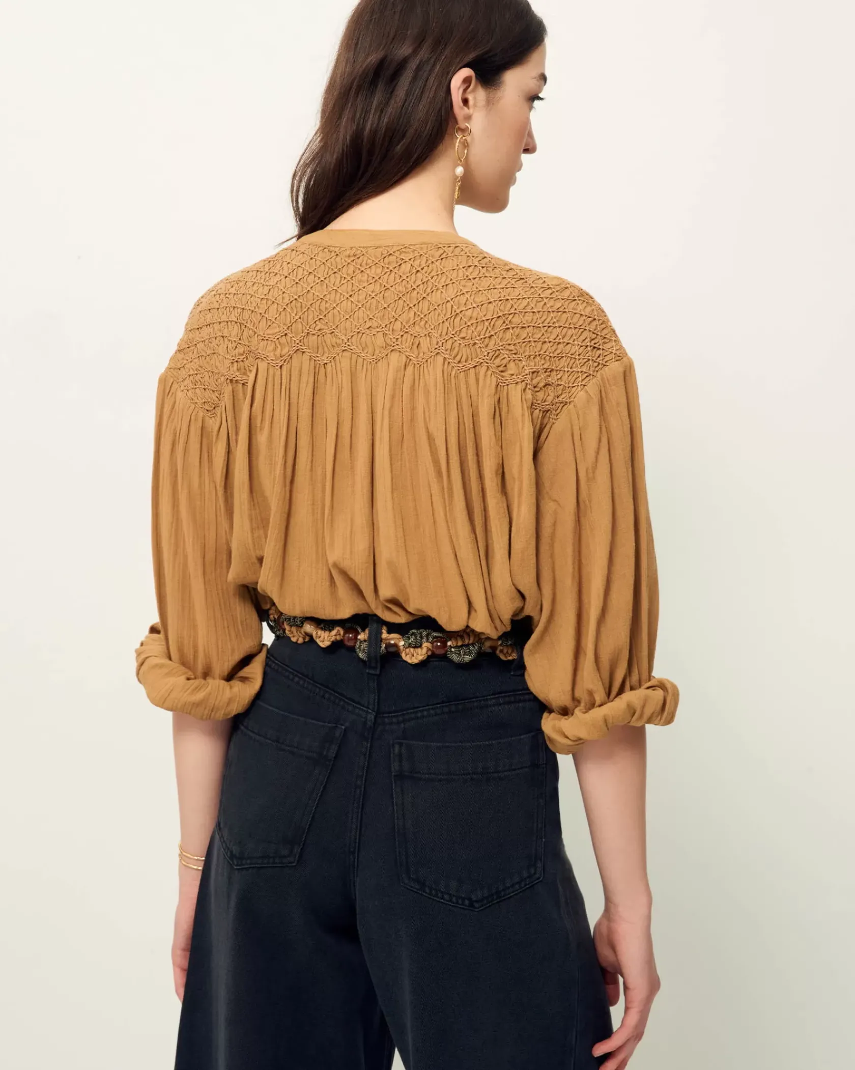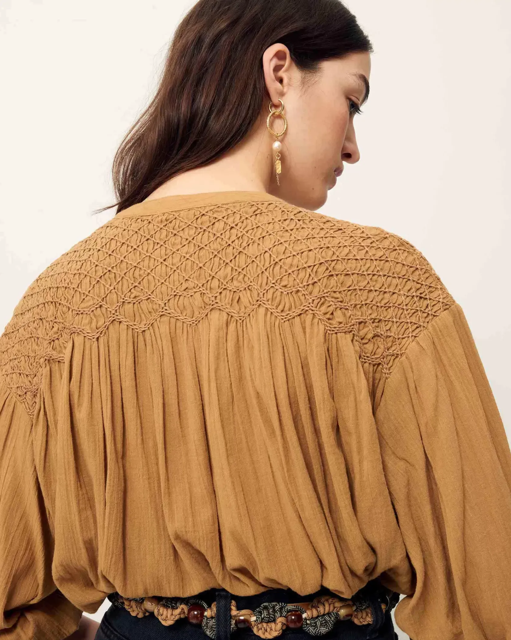 Blouse ample smockée aux épaules et au dos en voile antique de coton.