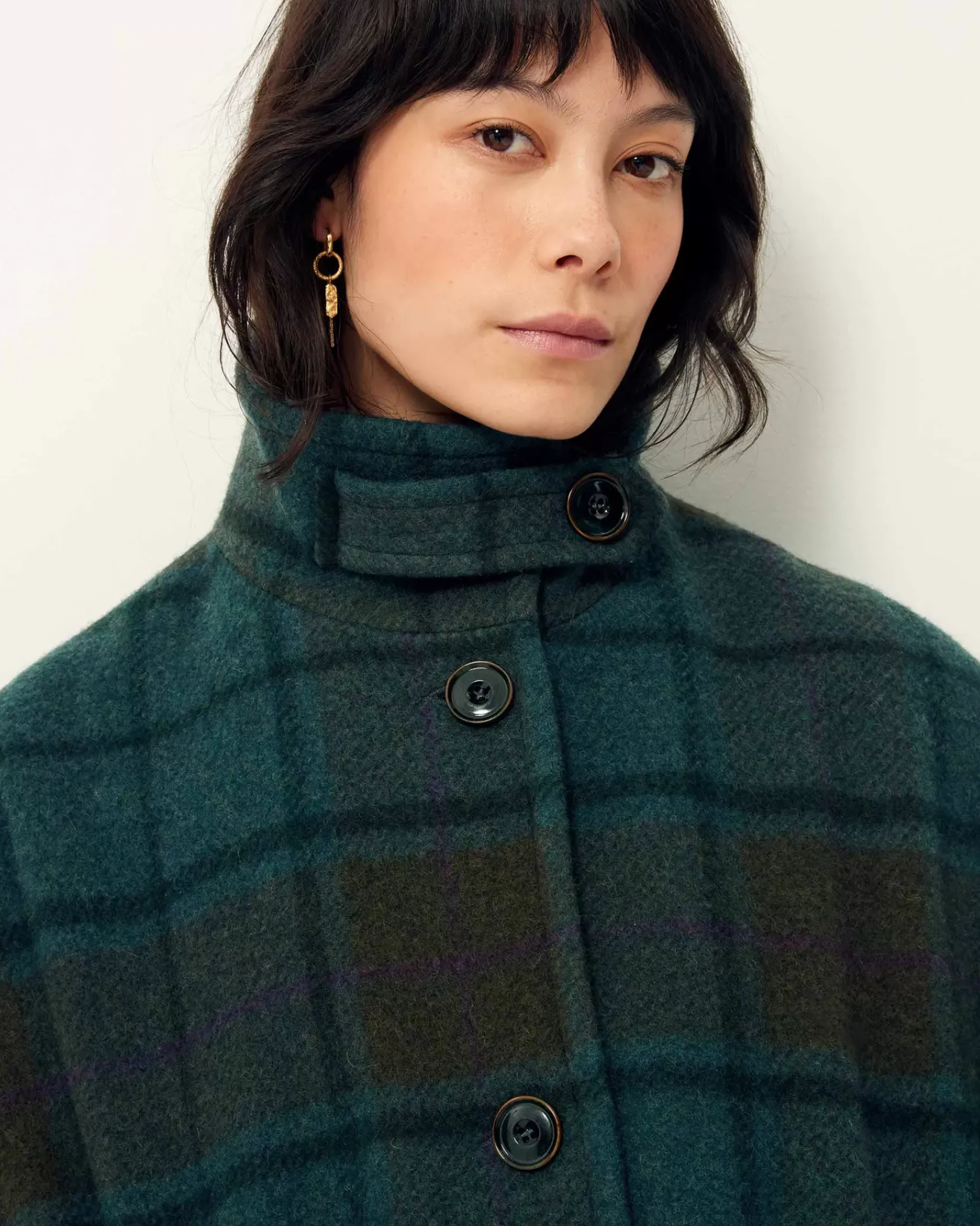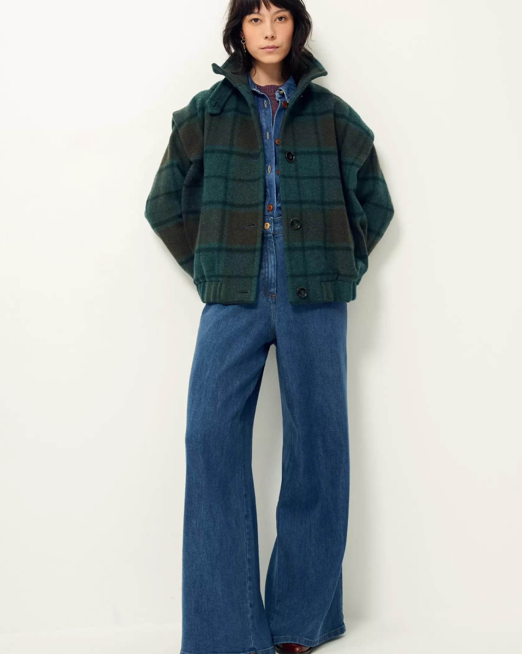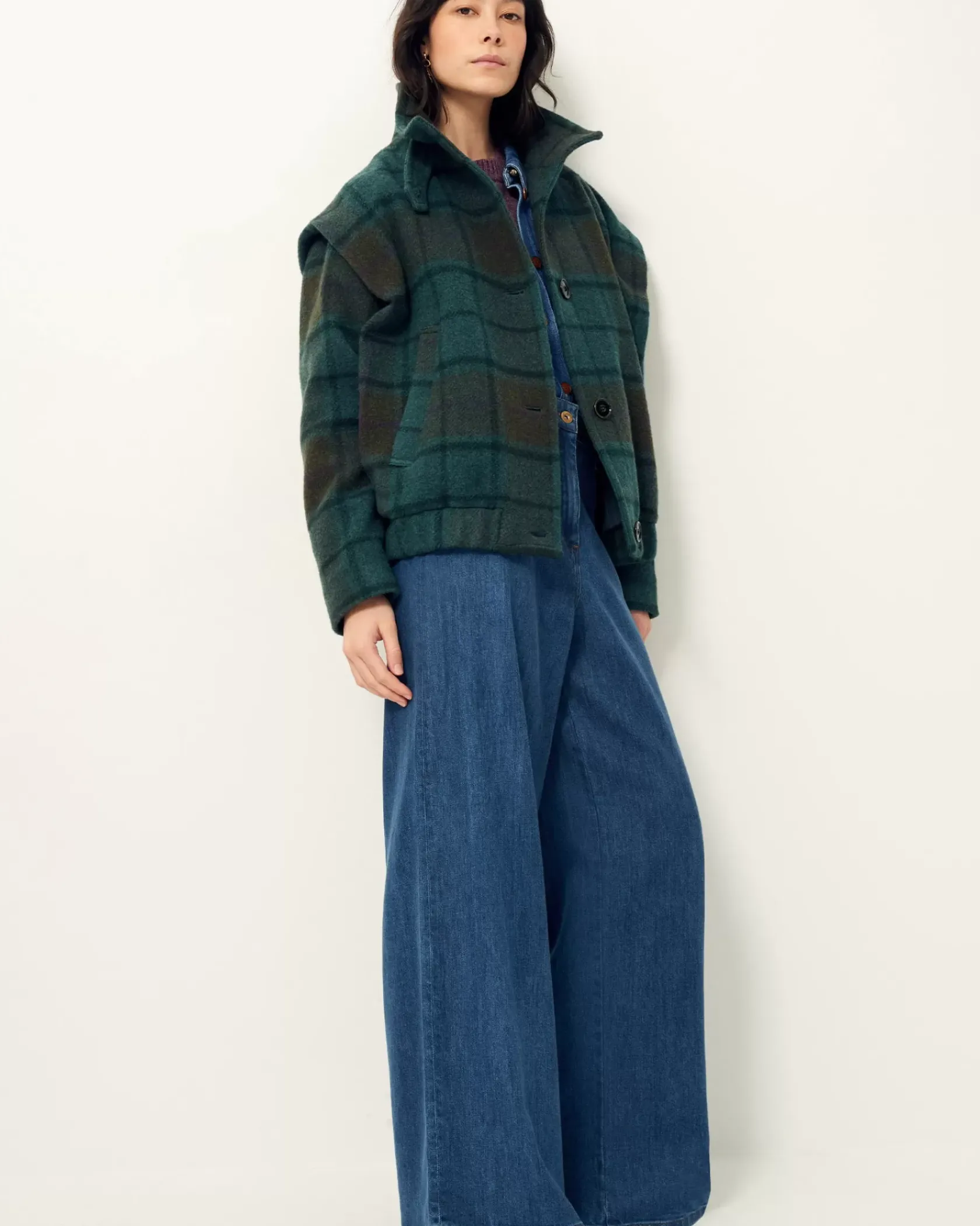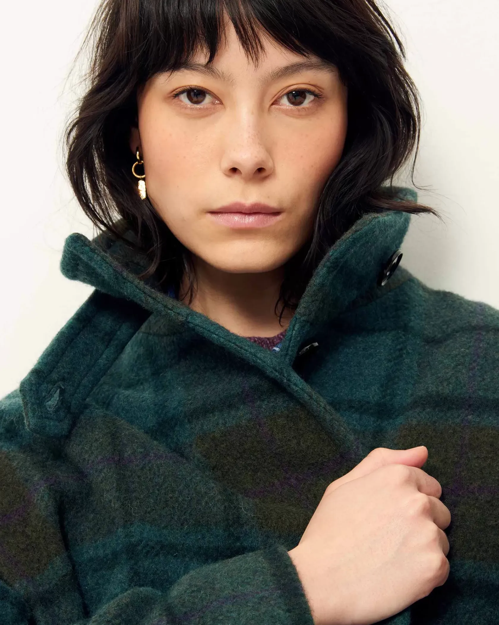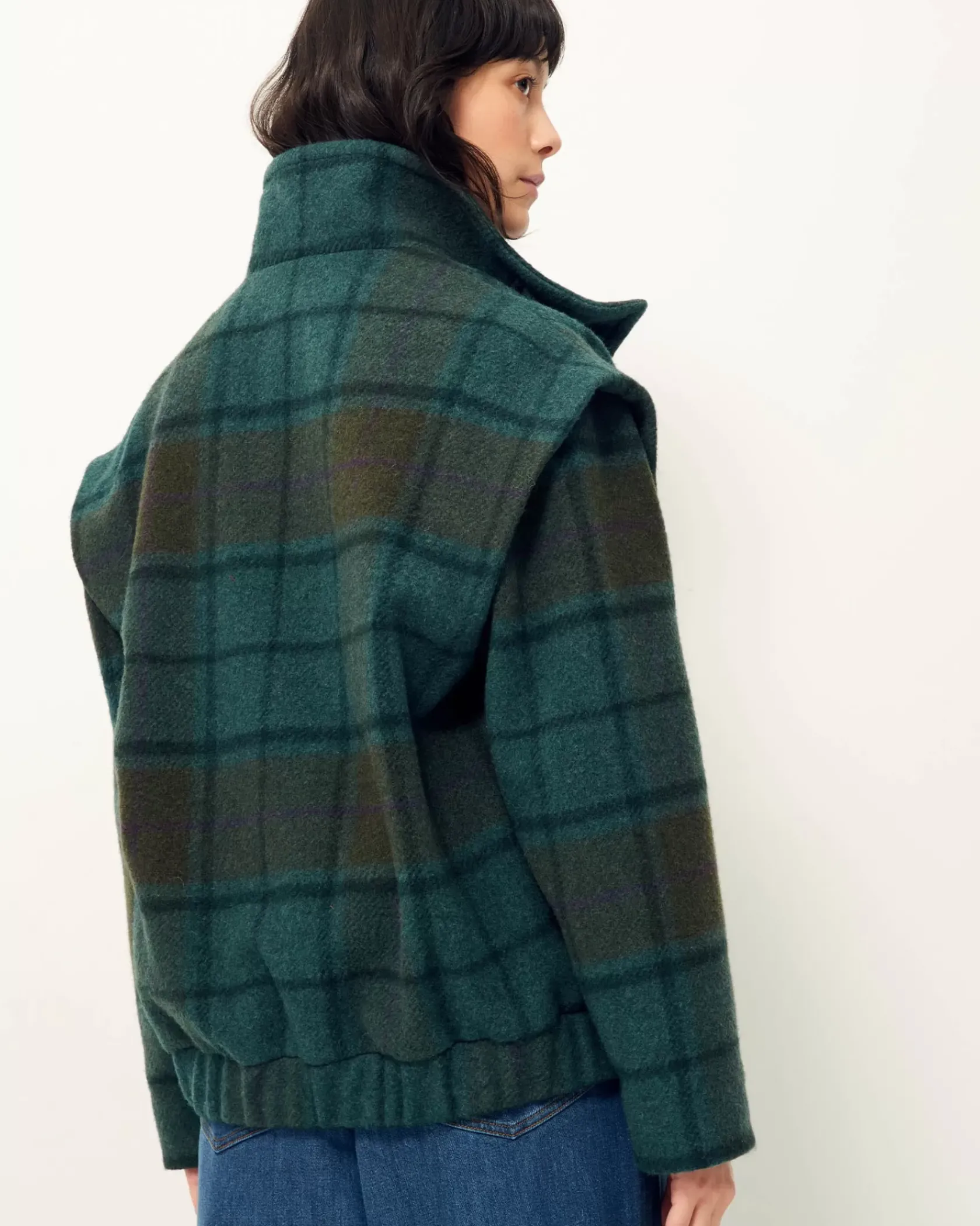 Veste courte esprit blouson à plis sur l’épaule et taille élastiquée en tartan double tissage finition velvet, tissé en Italie.