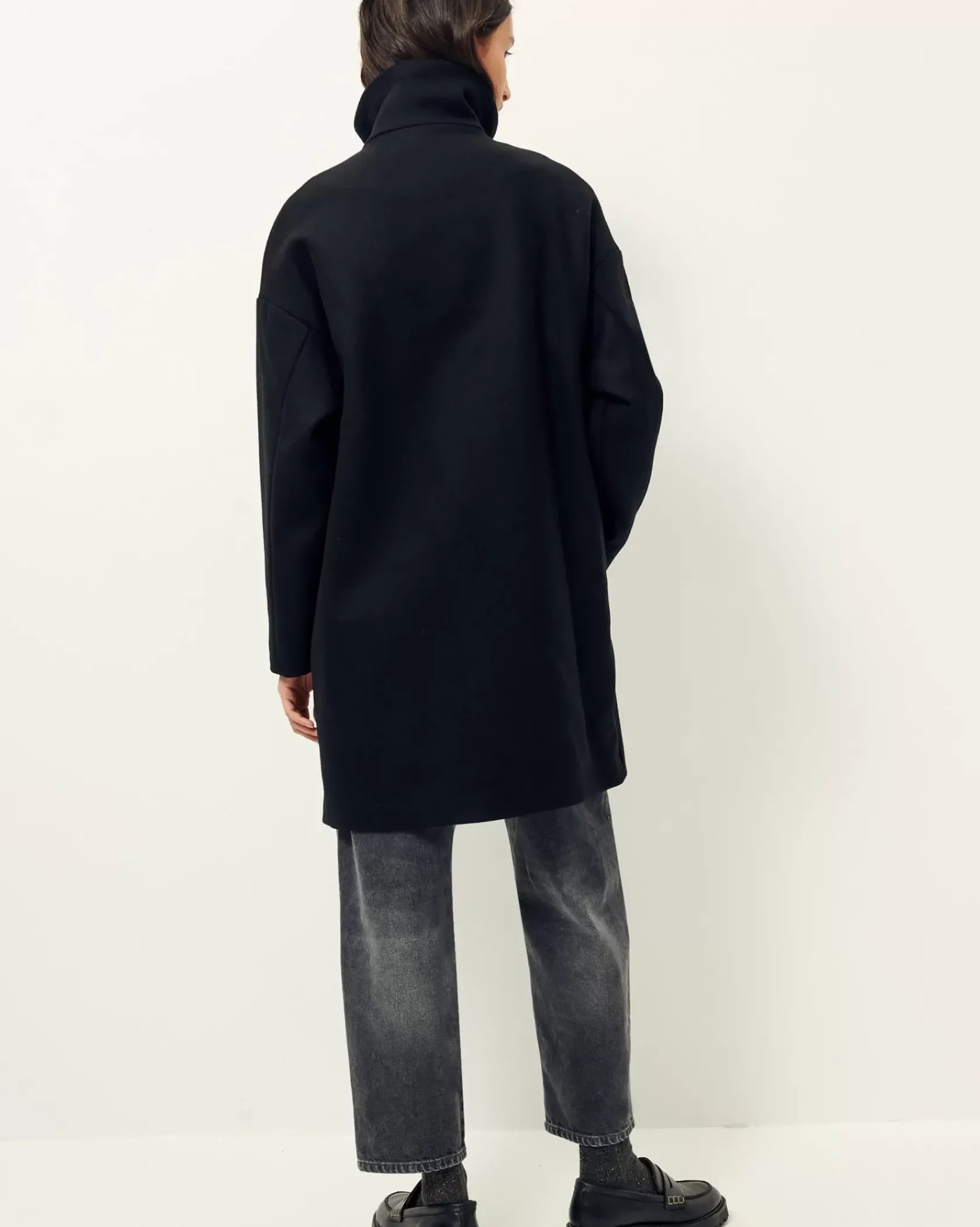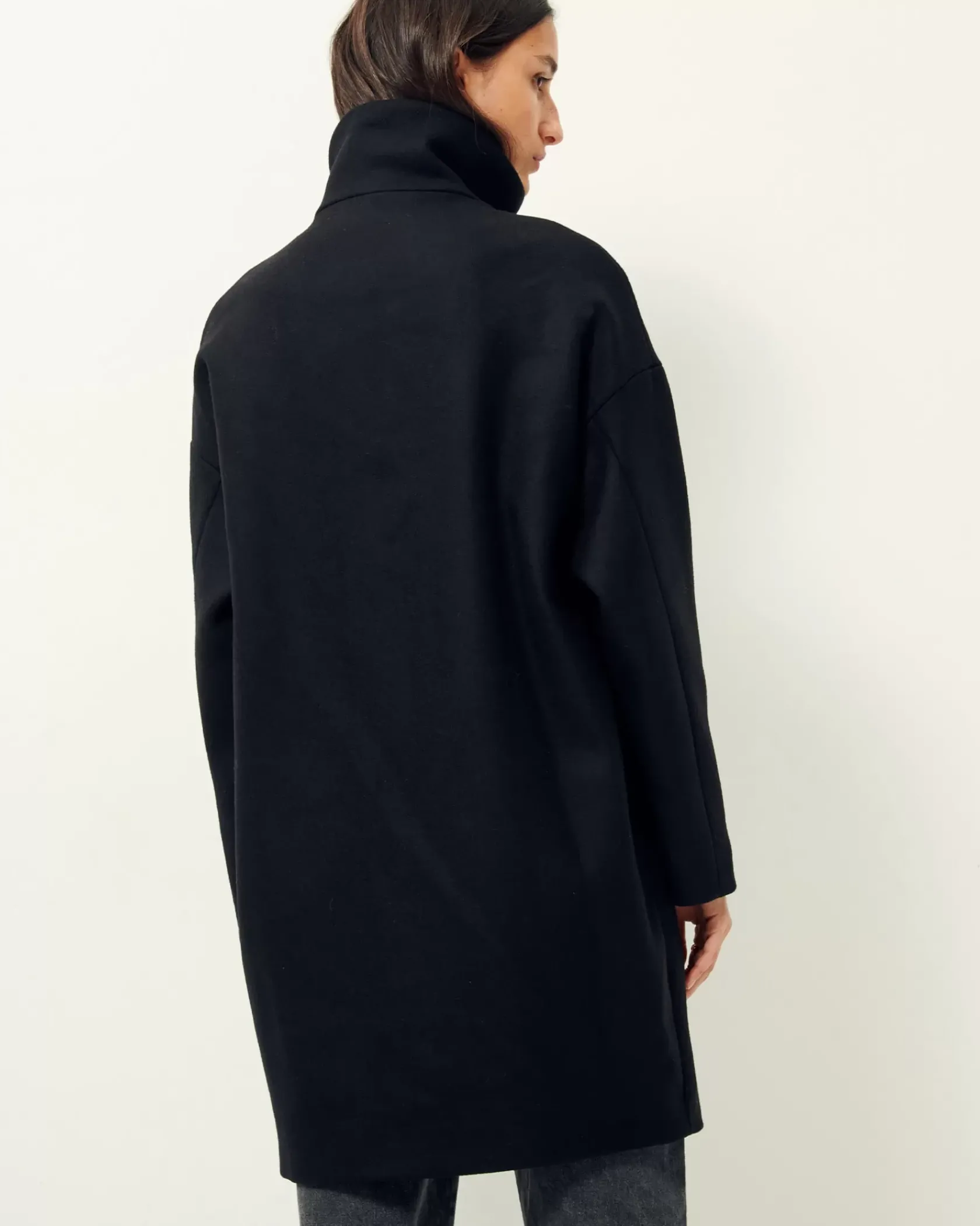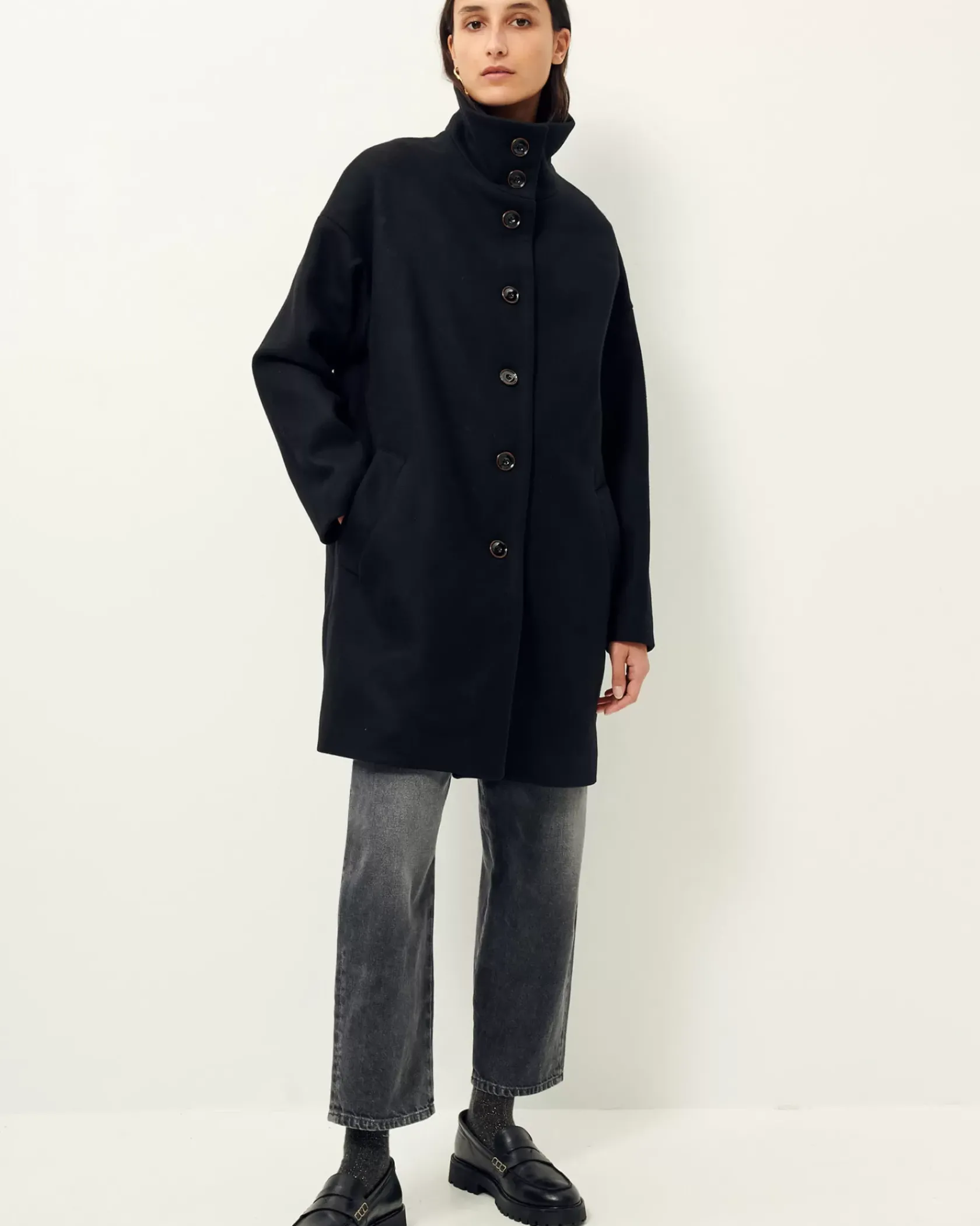 Manteau droit mi long à col montant en double tissage armuré chiné tissé en Italie.