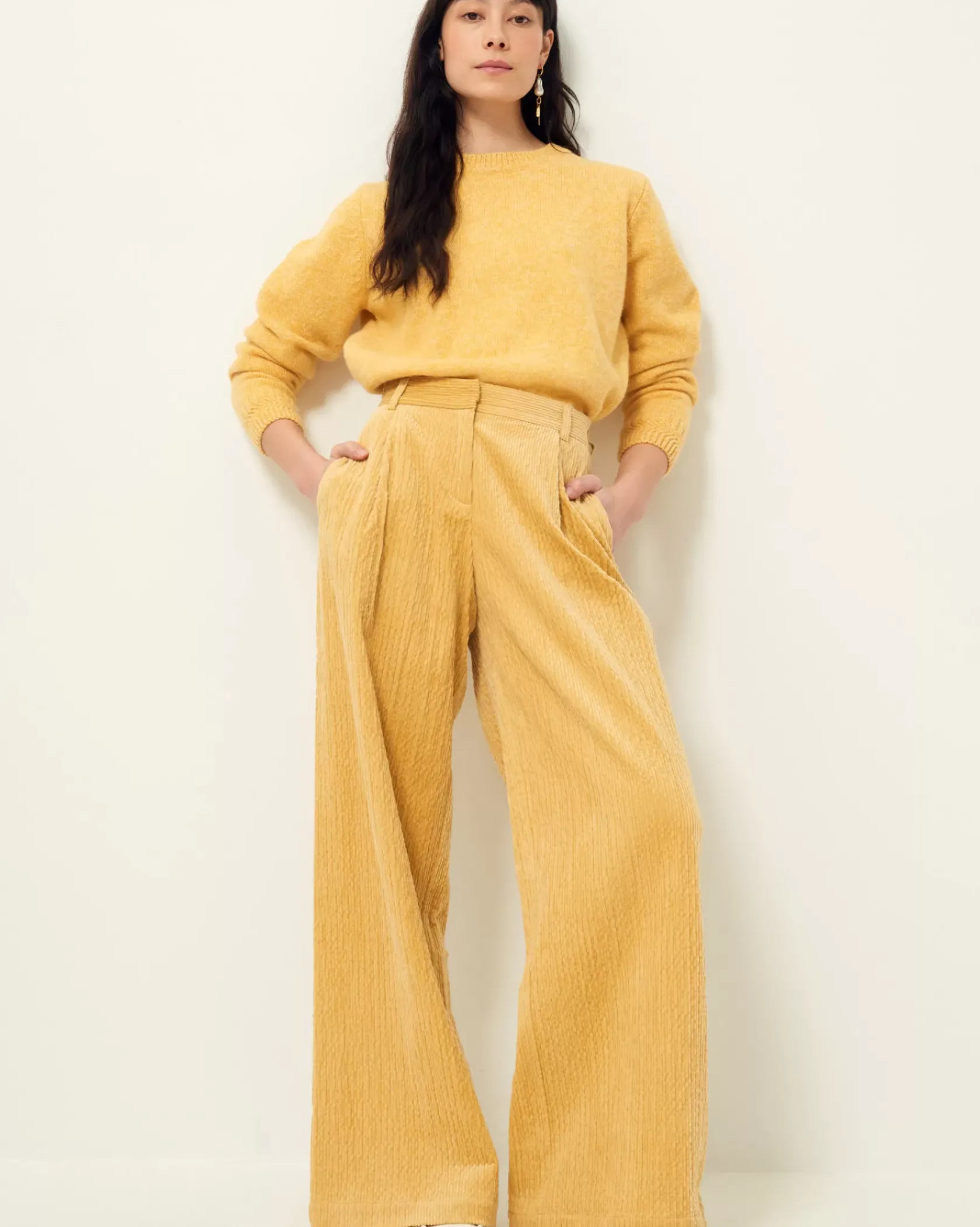 Pantalon ample d’inspiration masculine taille haute en velours seersucker côtelé, apprêté en Italie.