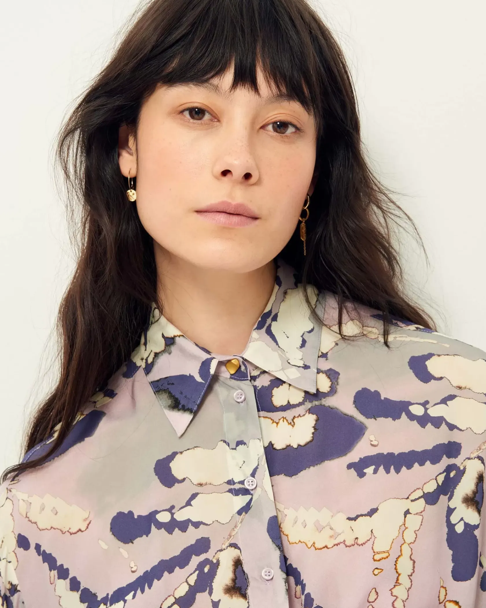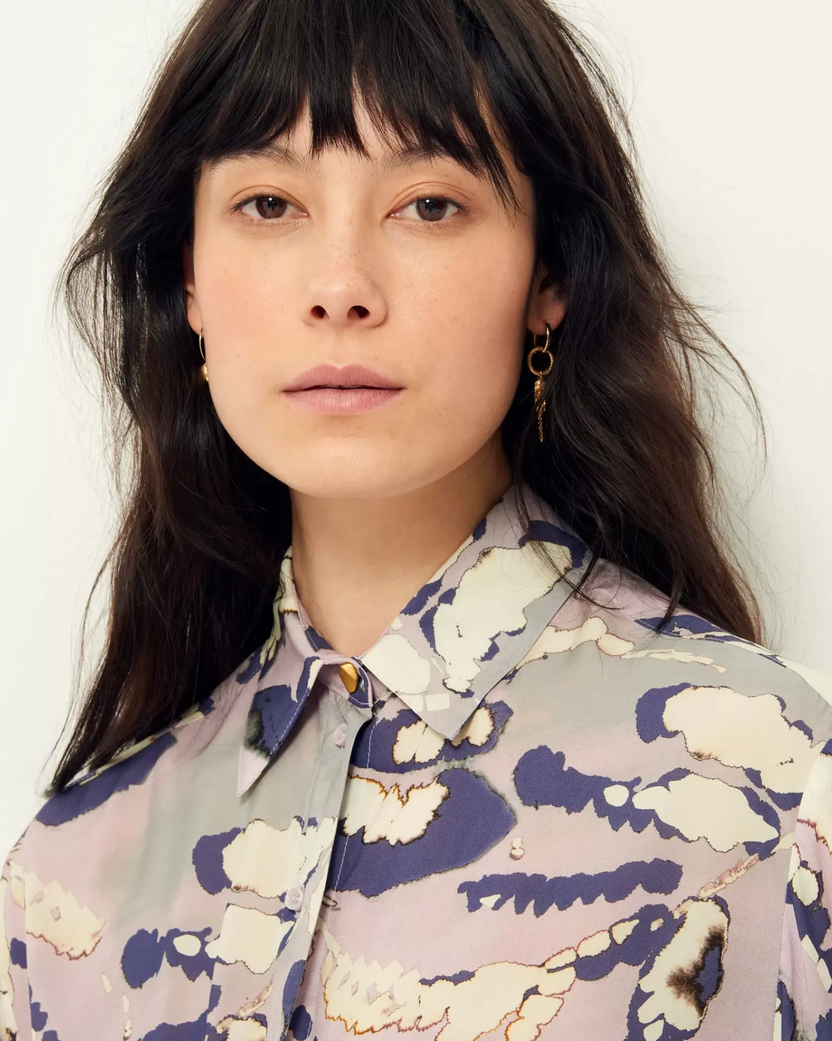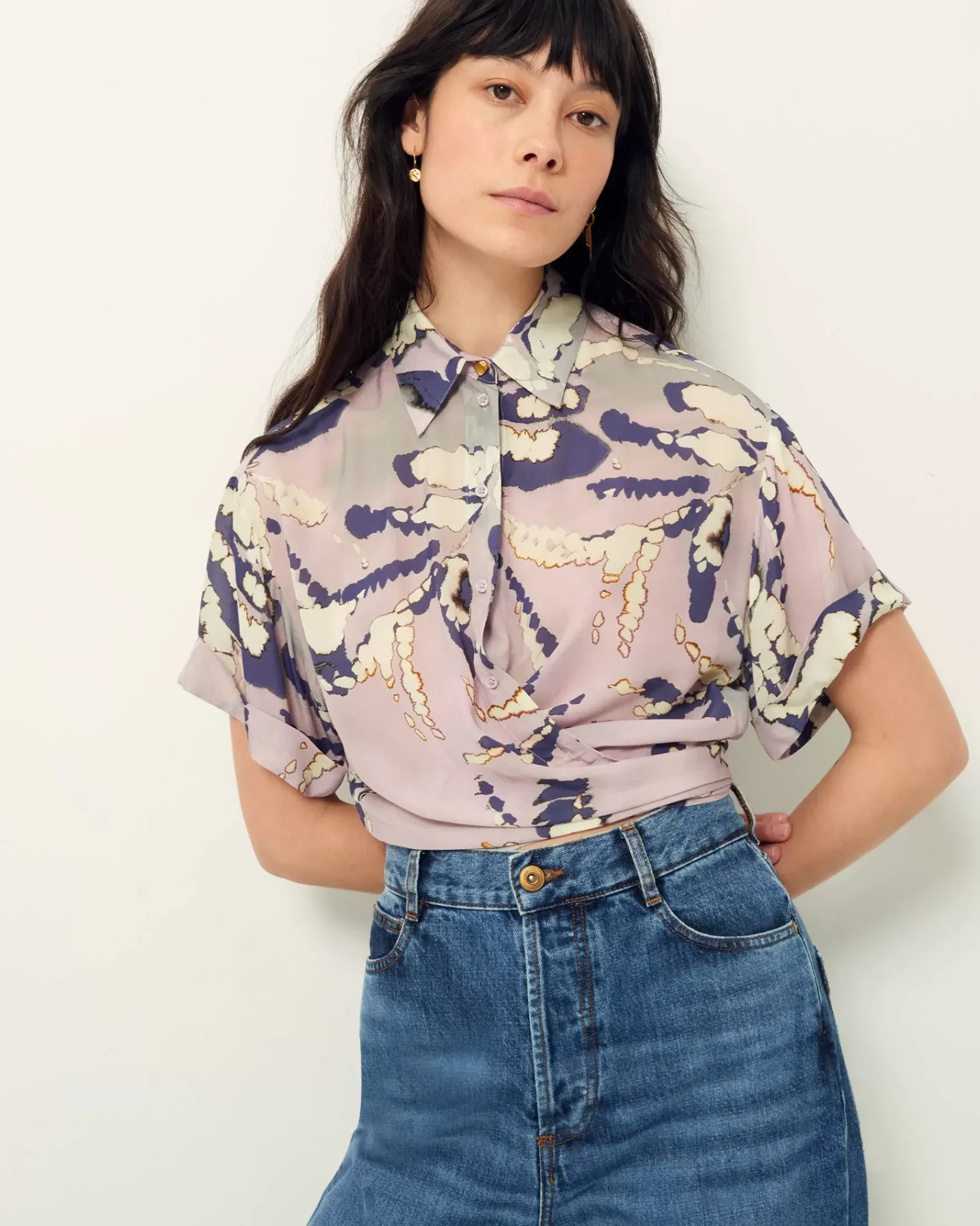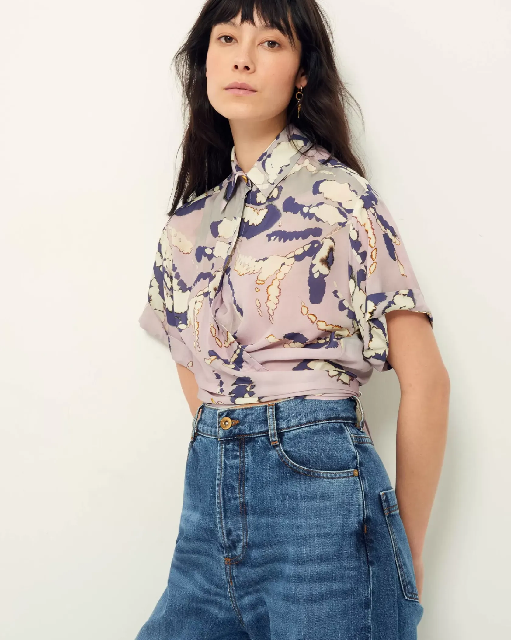 Chemisier court à nouer en toile de viscose fluide et aérienne imprimée et apprêtée en Italie, motif exclusif Sessùn.
