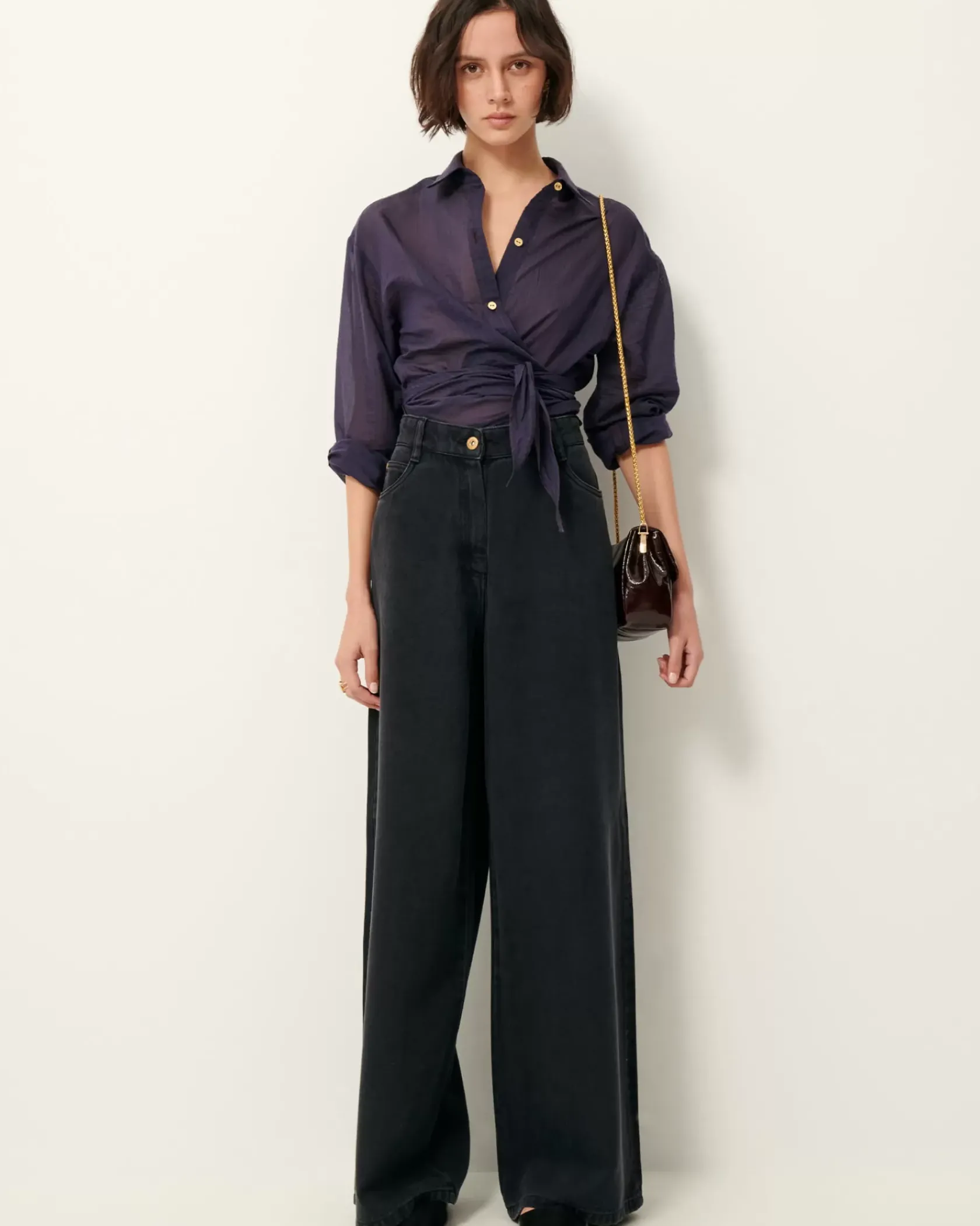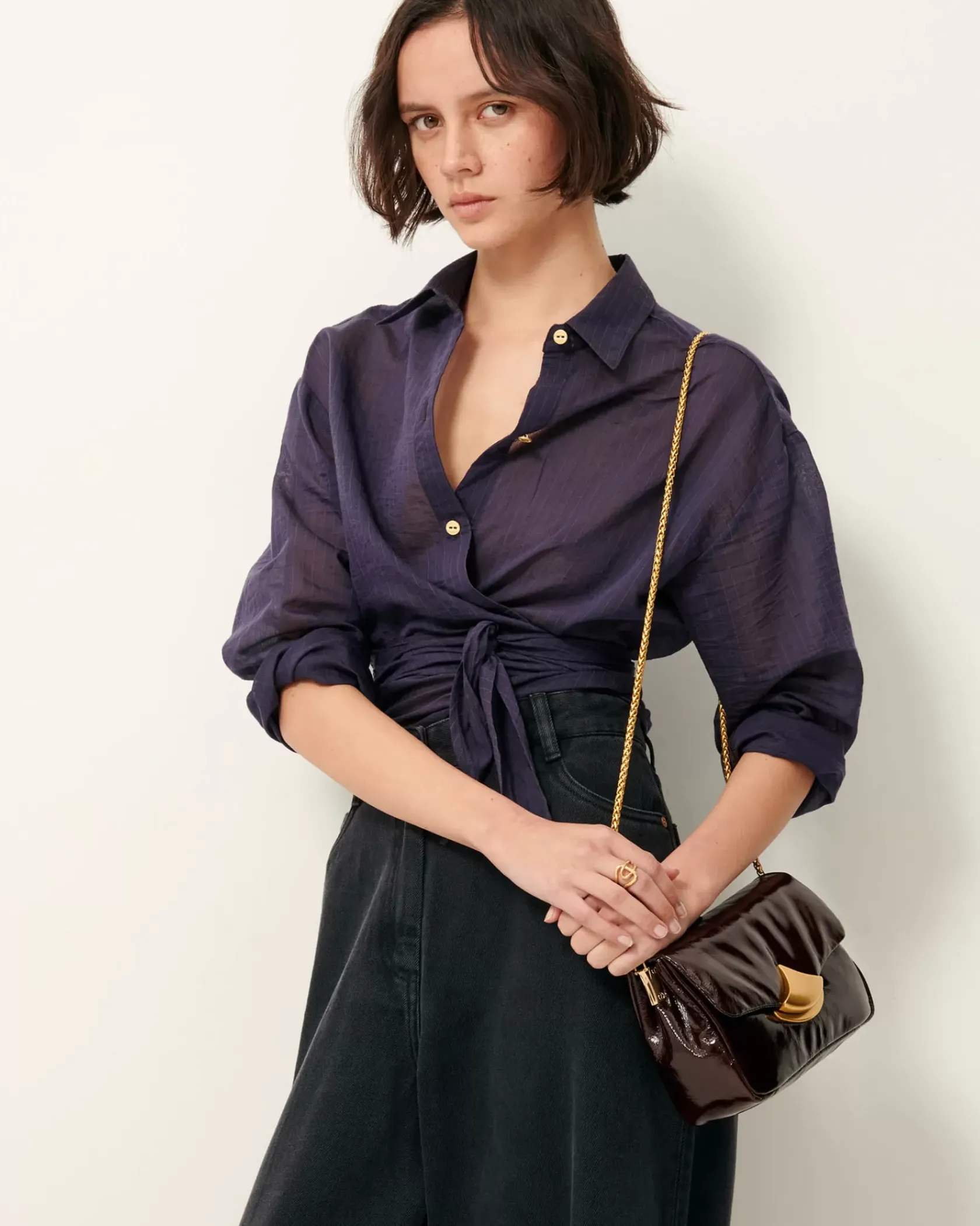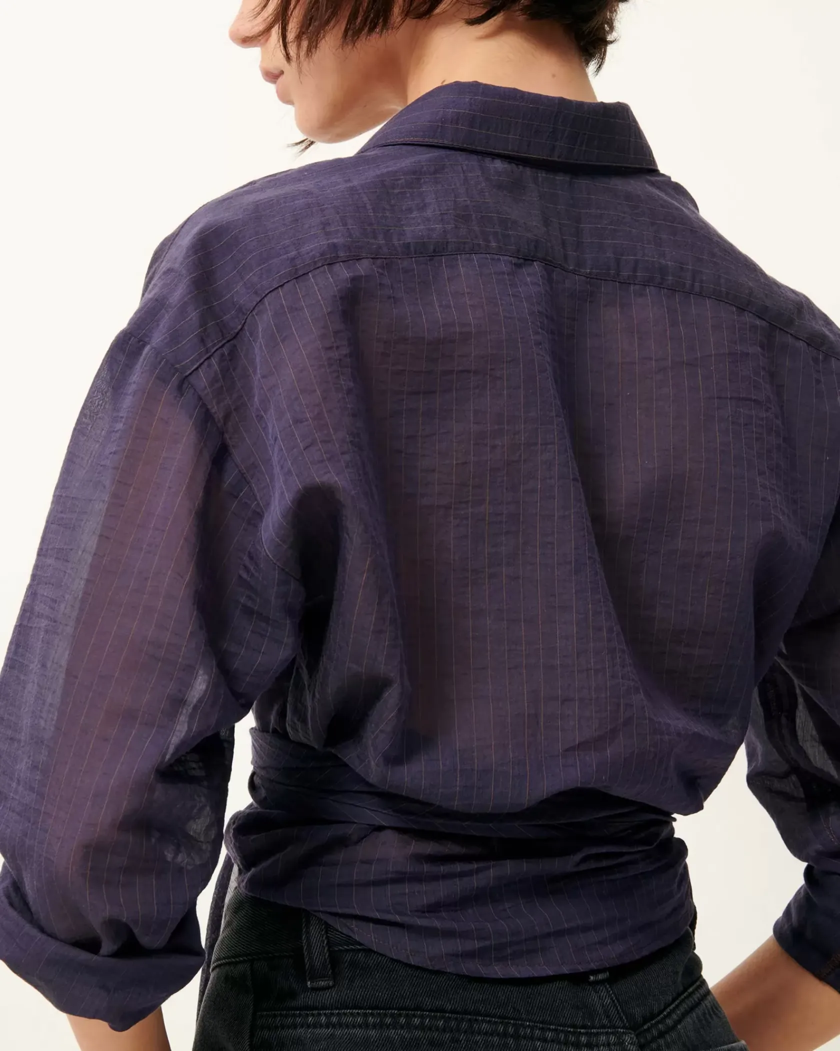 Chemise à nouer manches longues, voile transparent à fine rayure zephyr, tissé en Italie.