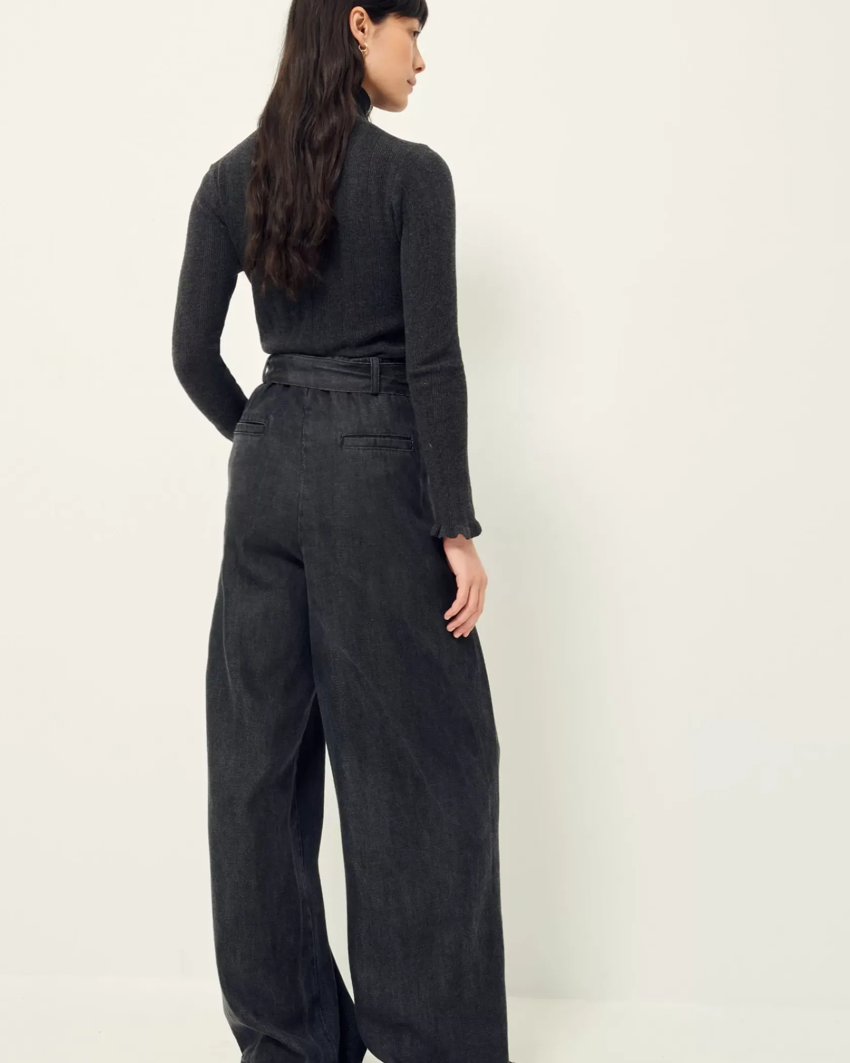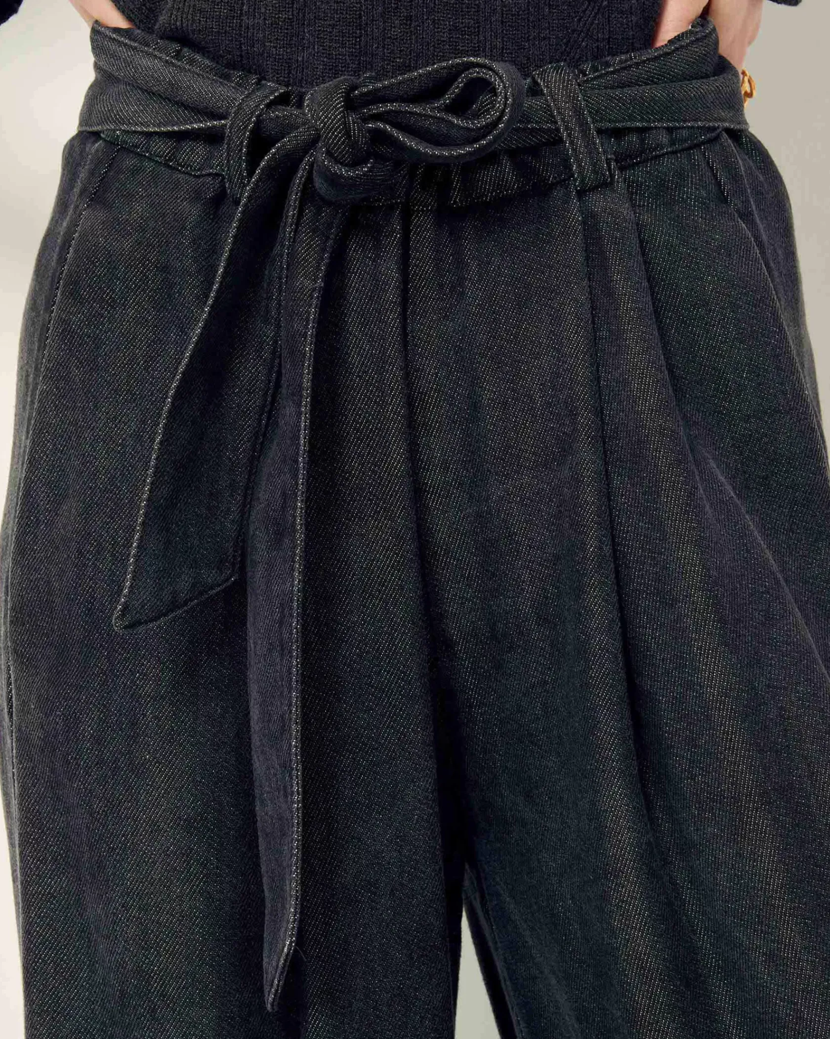 Pantalon ample taille haute élastiquée et ceinture amovible à nouer en toile denim de lyocell fluide tissée en Espagne.