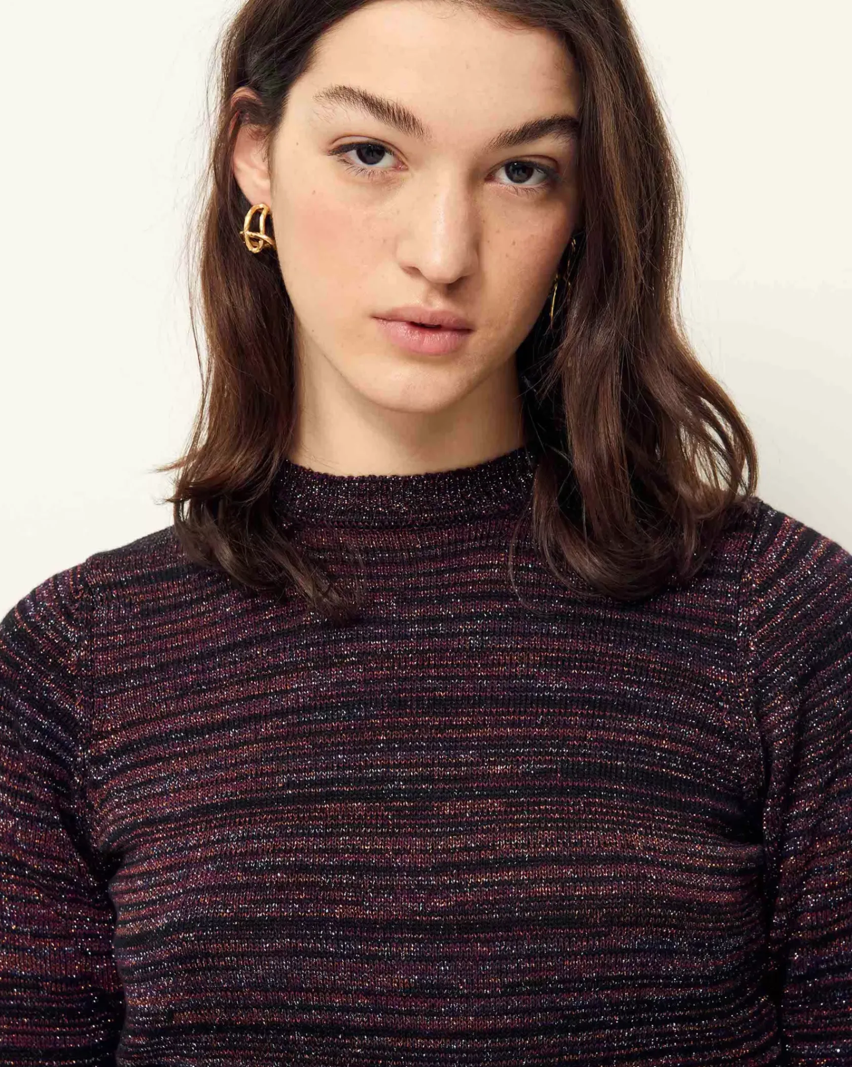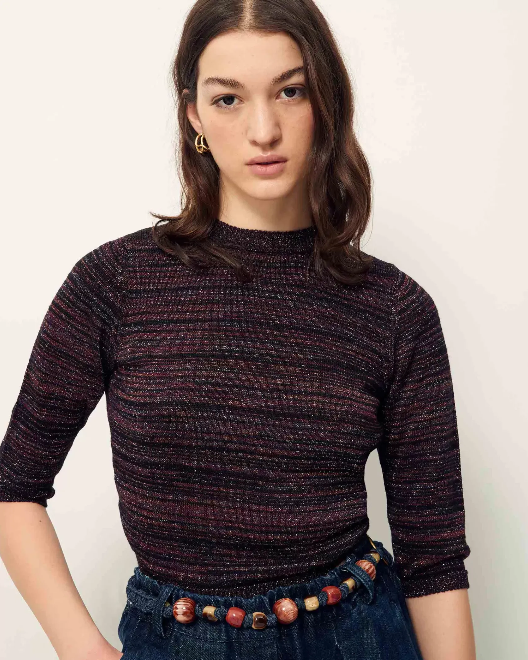 Pull court ajusté en maille jersey métallisée, tricoté en Italie.