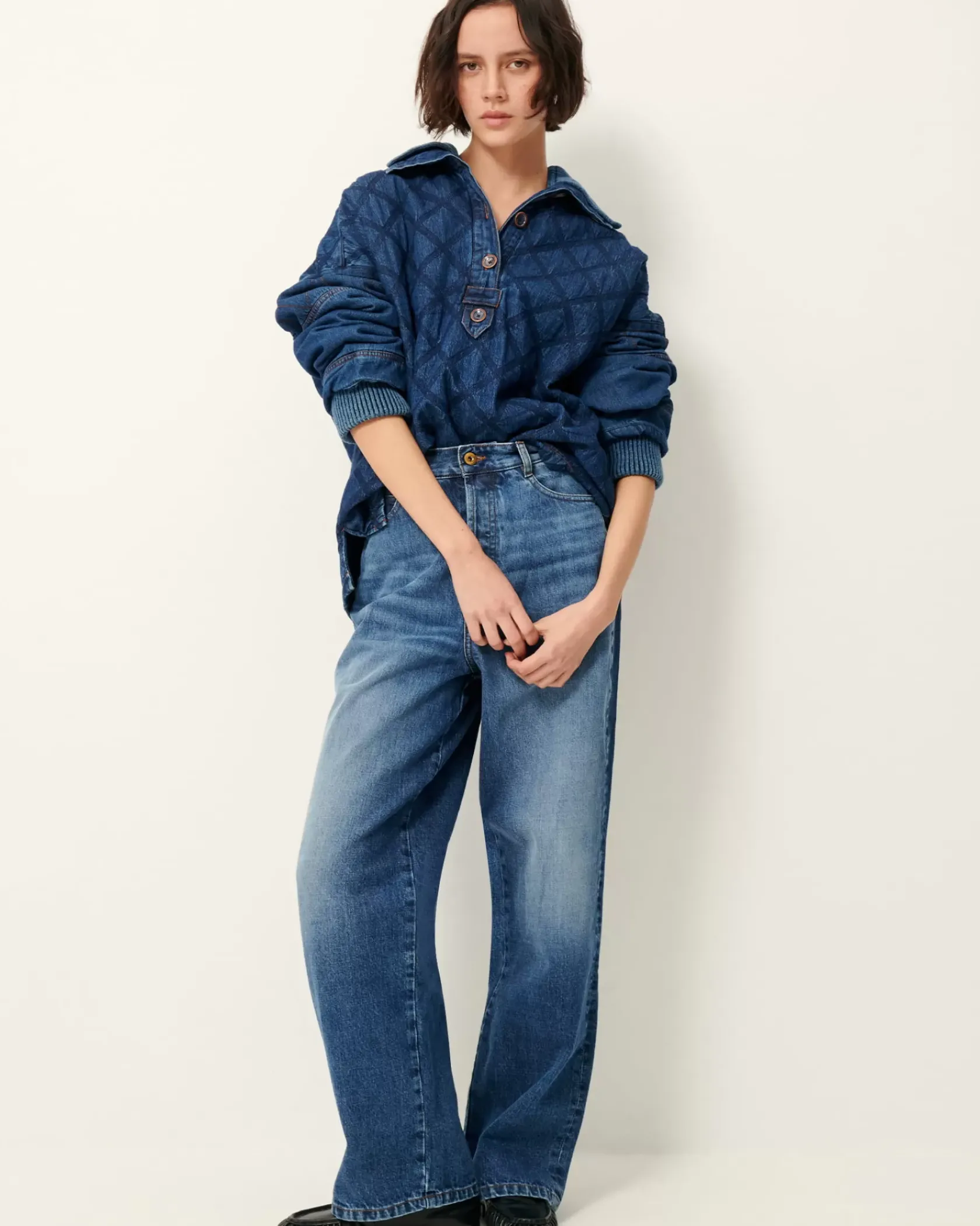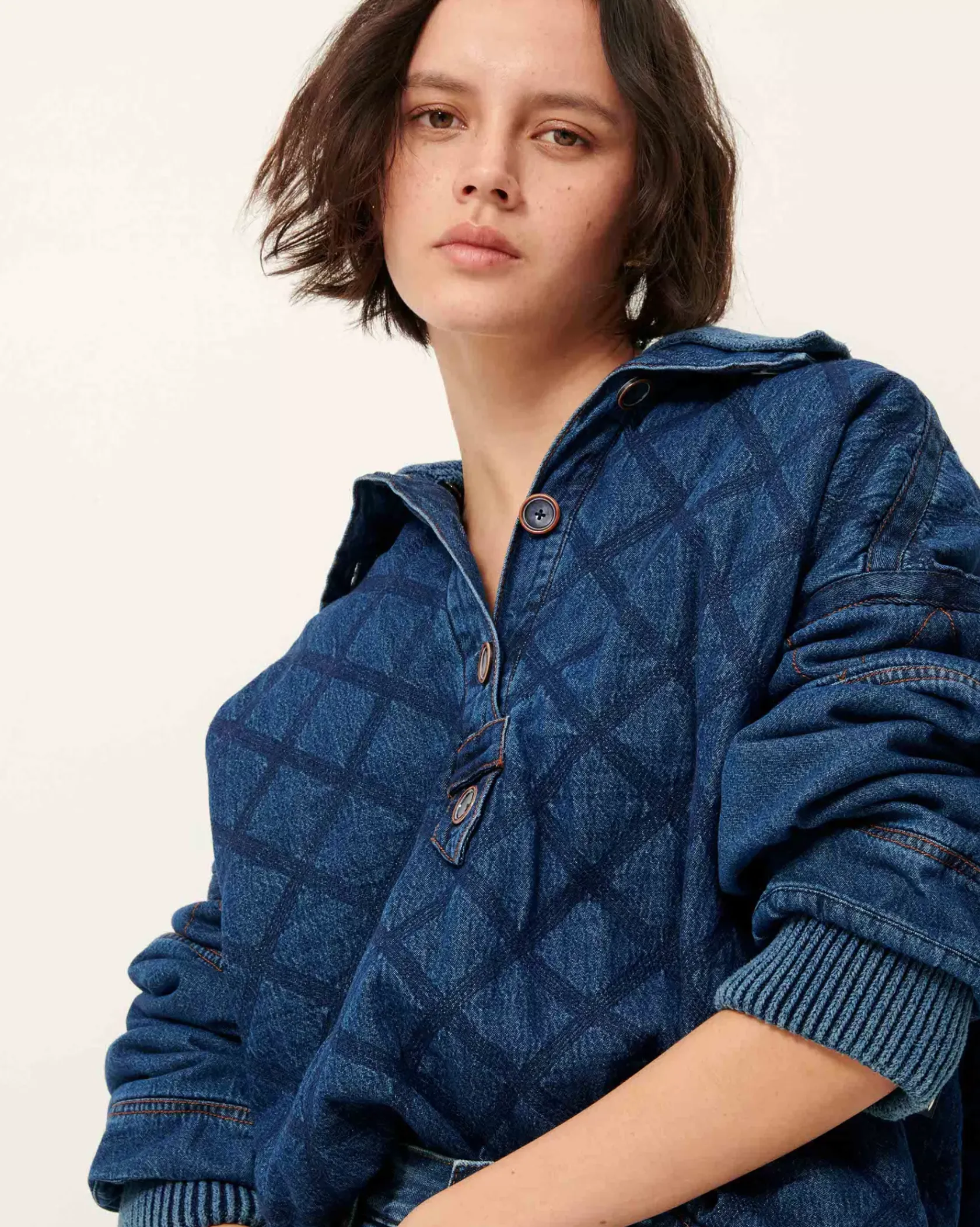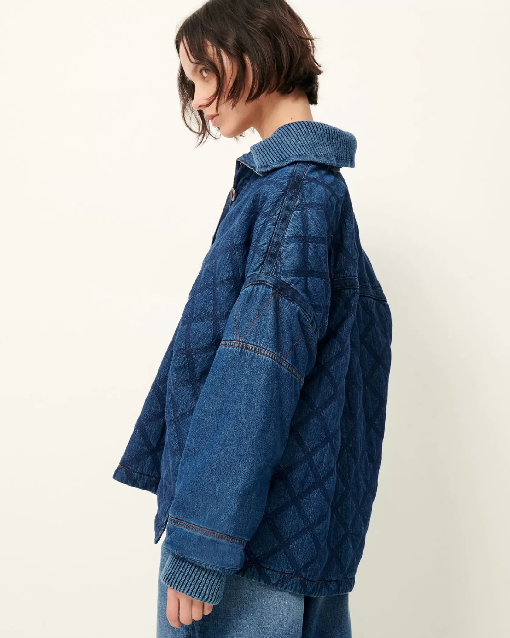 Veste esprit vareuse à col amovible en matelassage stonewashé de toile de denim.