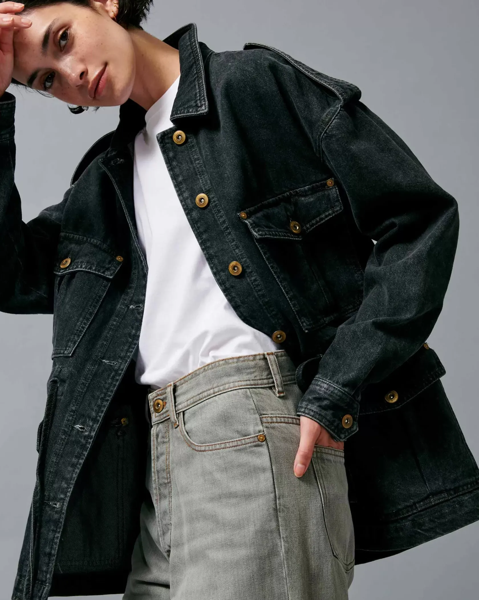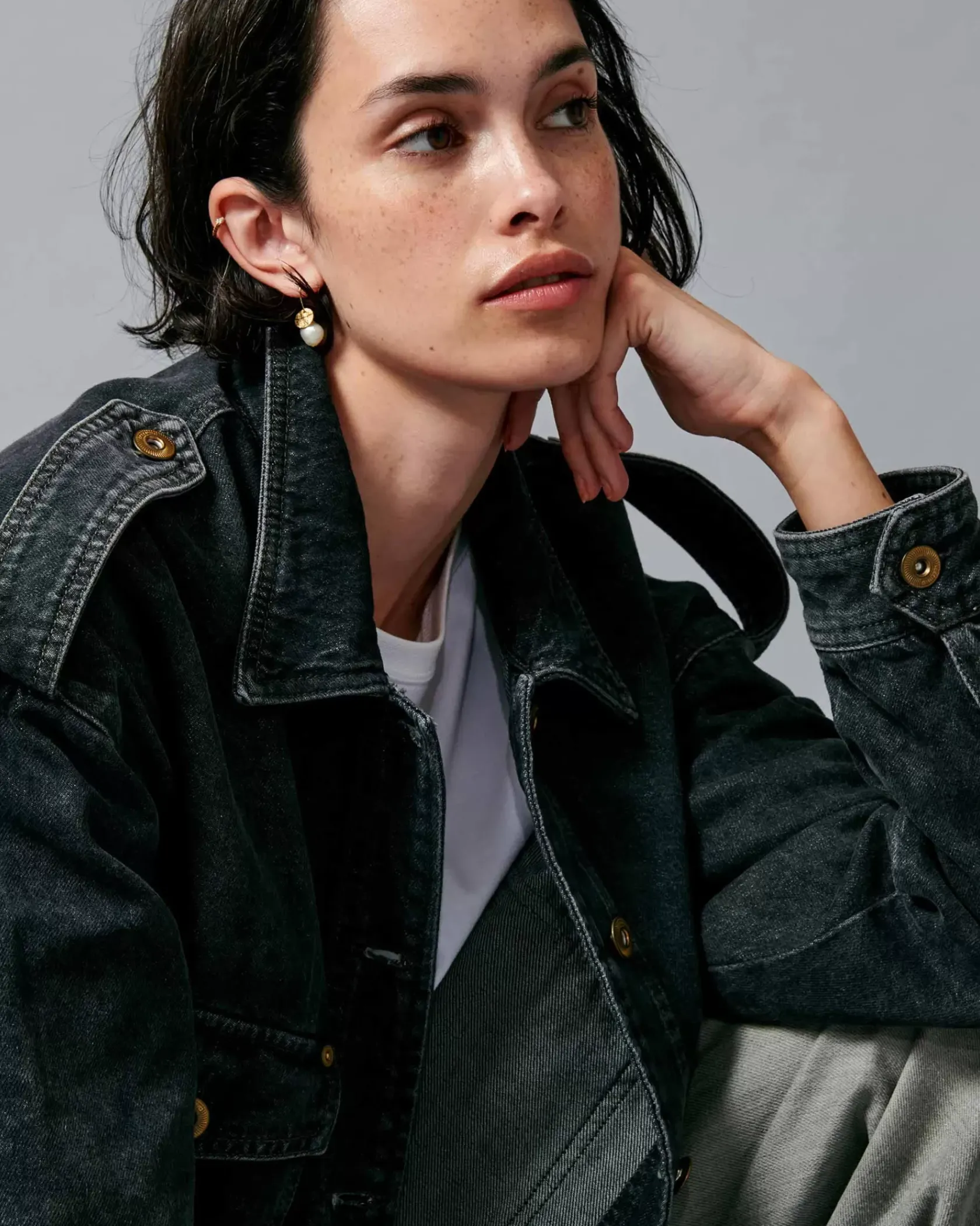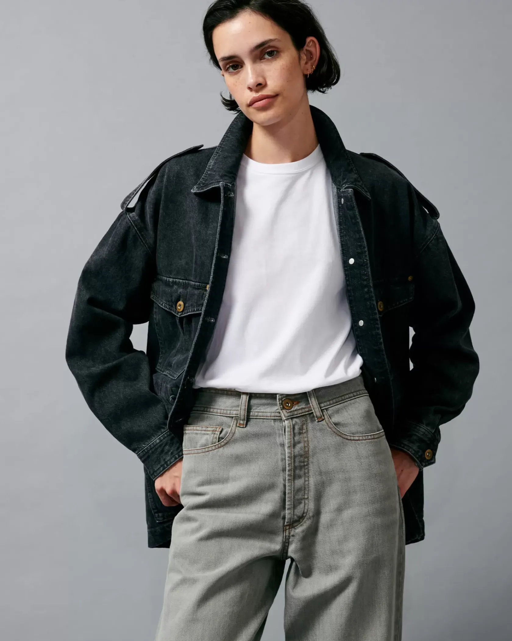 Veste esprit worker à poches plaquées en denim stonewashé.