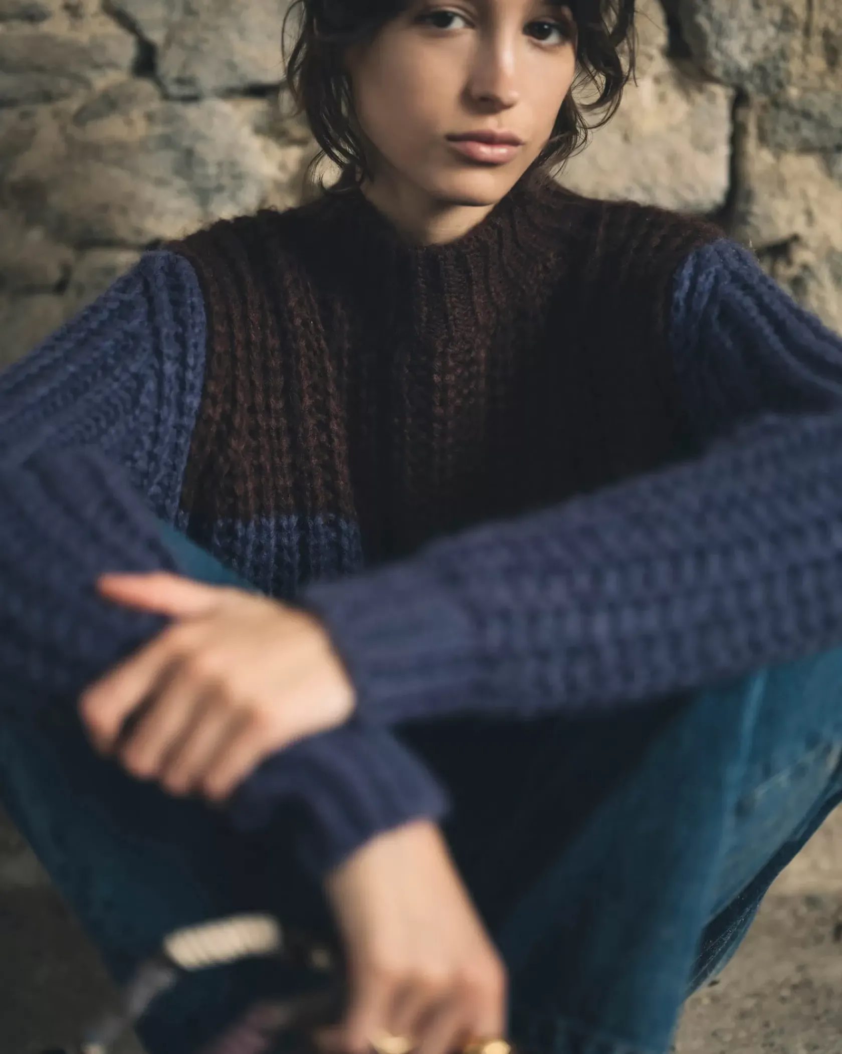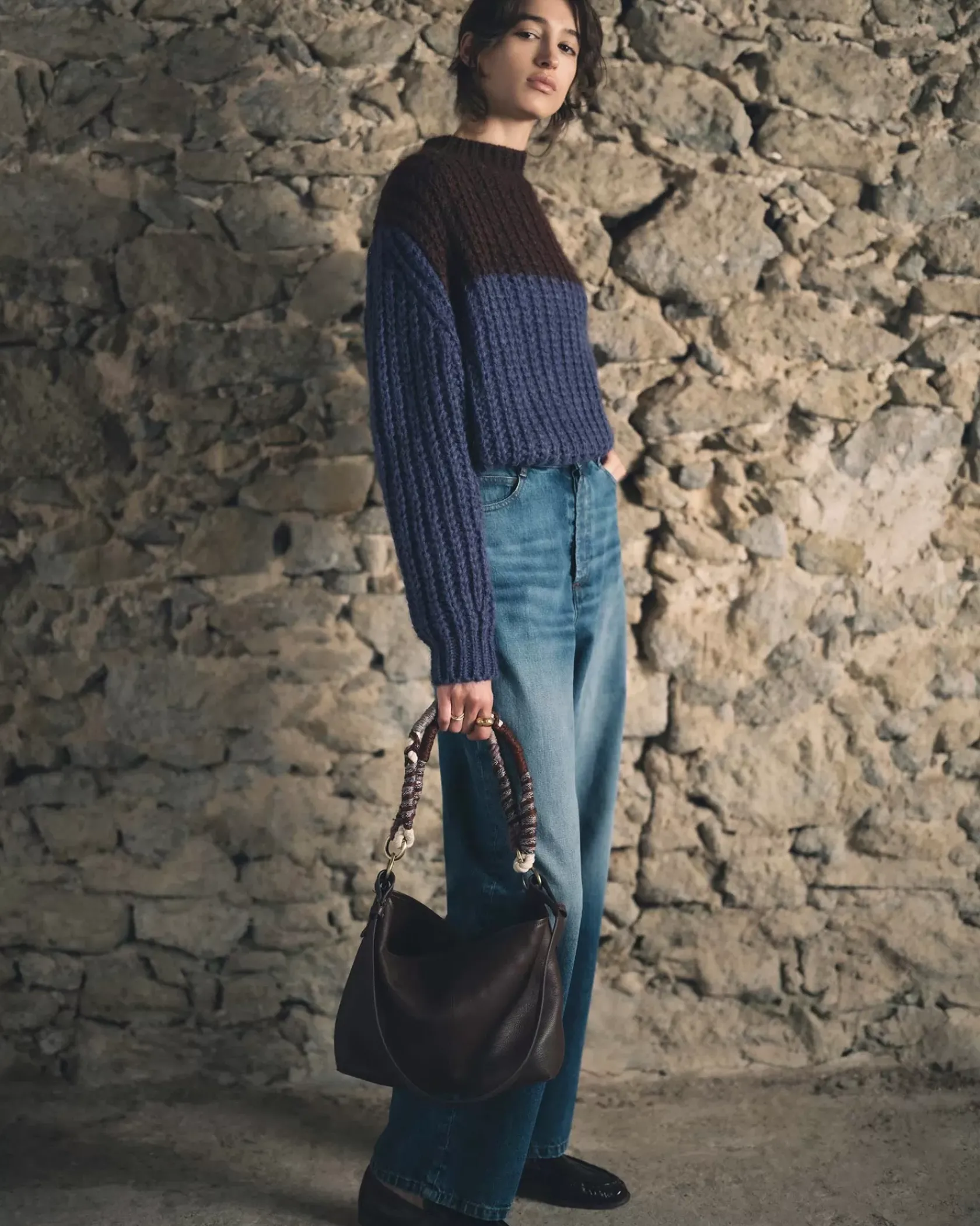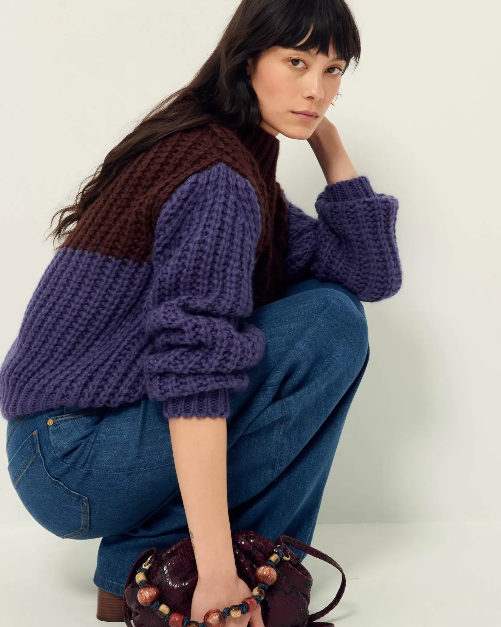 Pull ample à col montant color-block en côtes perlées grosse jauge maille duveteuse, tricoté en Italie.