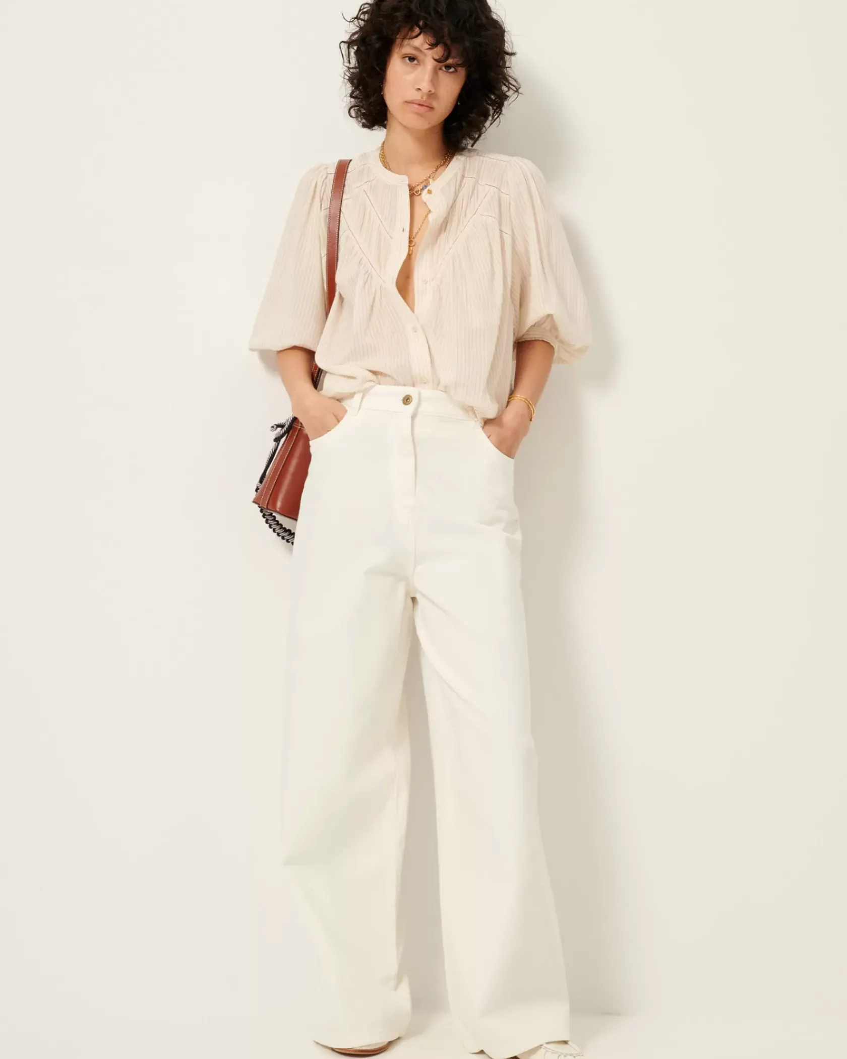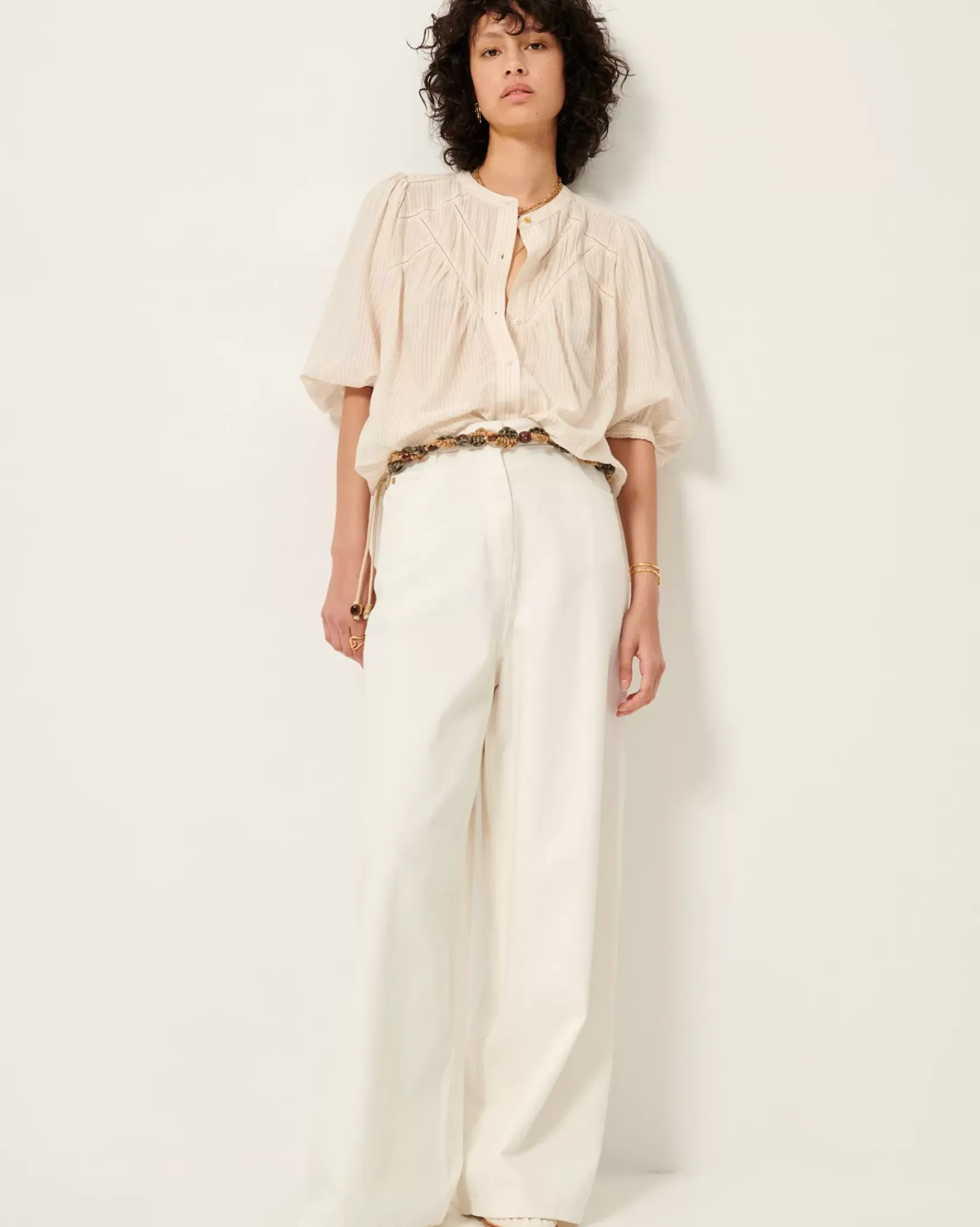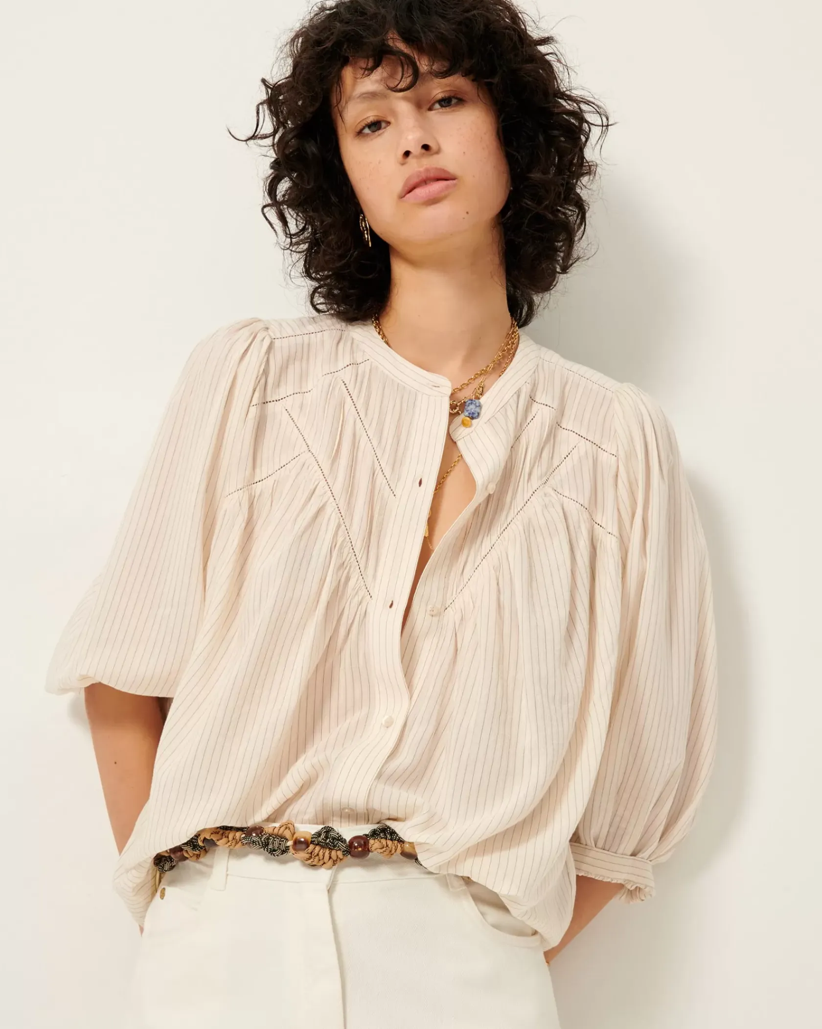 Blouse à manches ballon et détails de jour échelle et de mini plis couchés en linon à travail d’armures jacquard et fines rayures contrastées.
