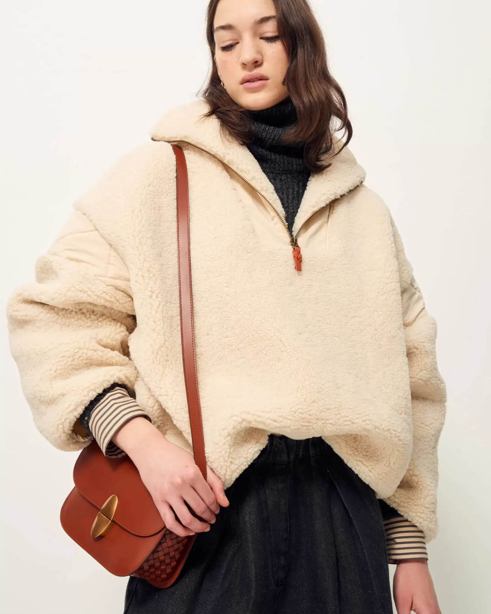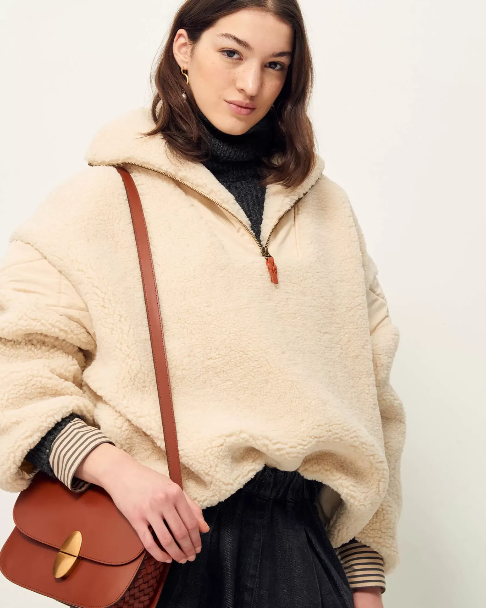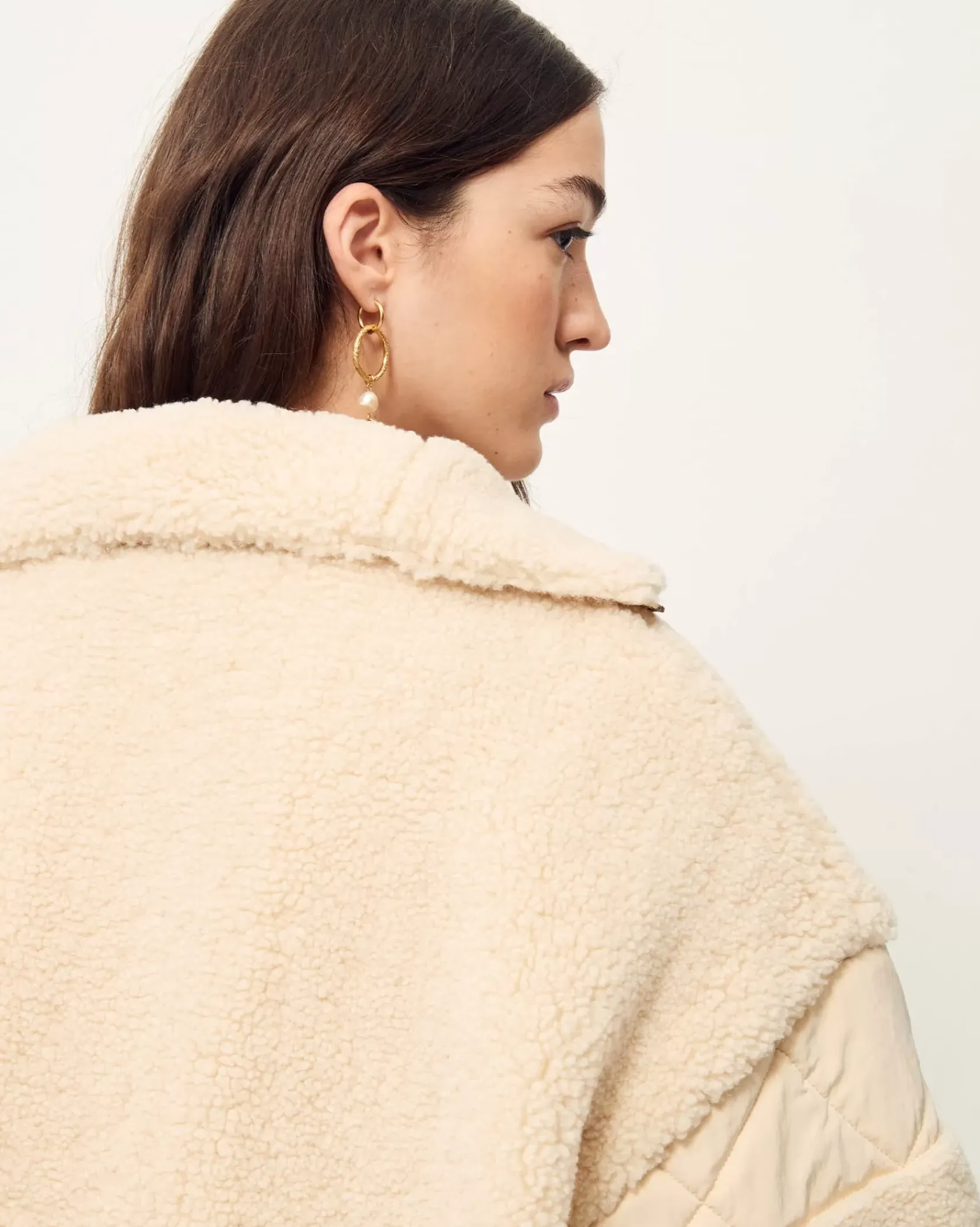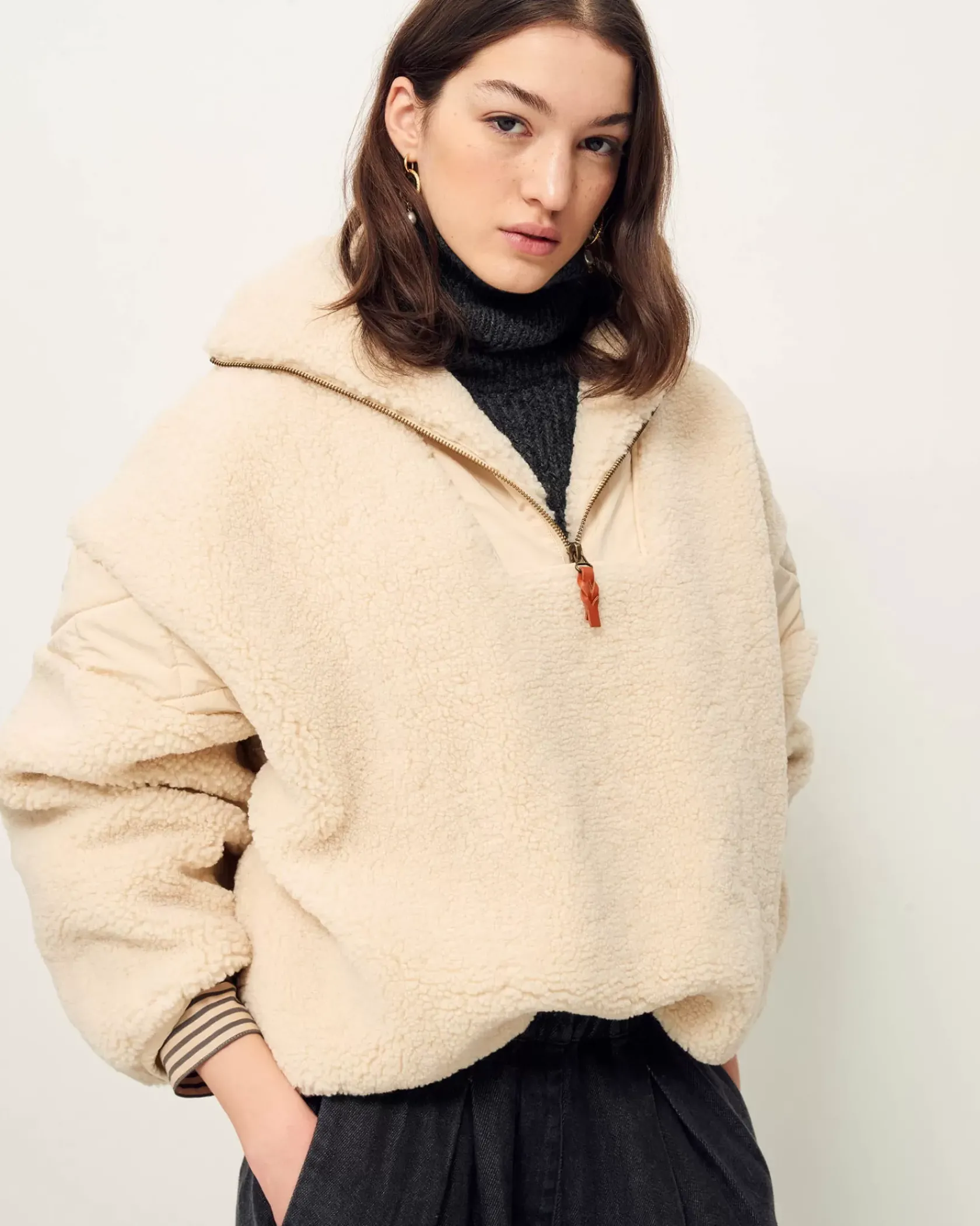 Sweat esprit vareuse à col zippé en tissage de fils bouclés façon fausse fourrure de mouton avec empiècements en nylon matelassé.