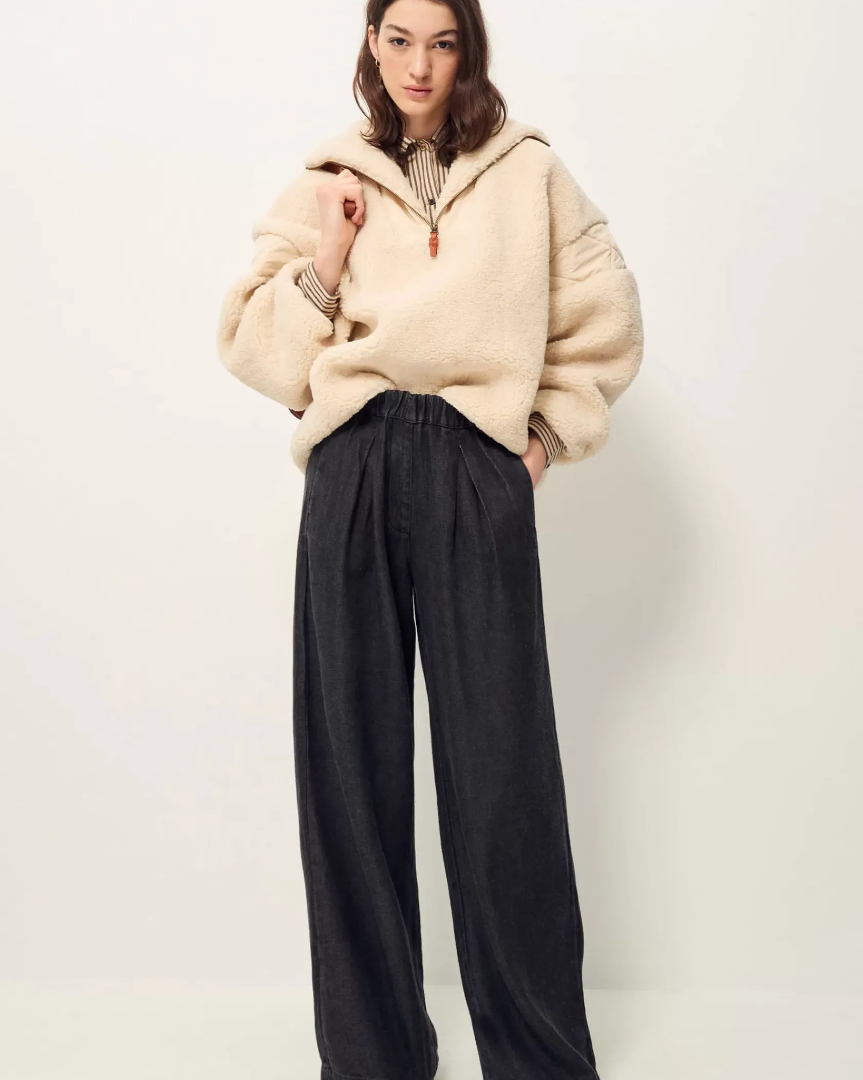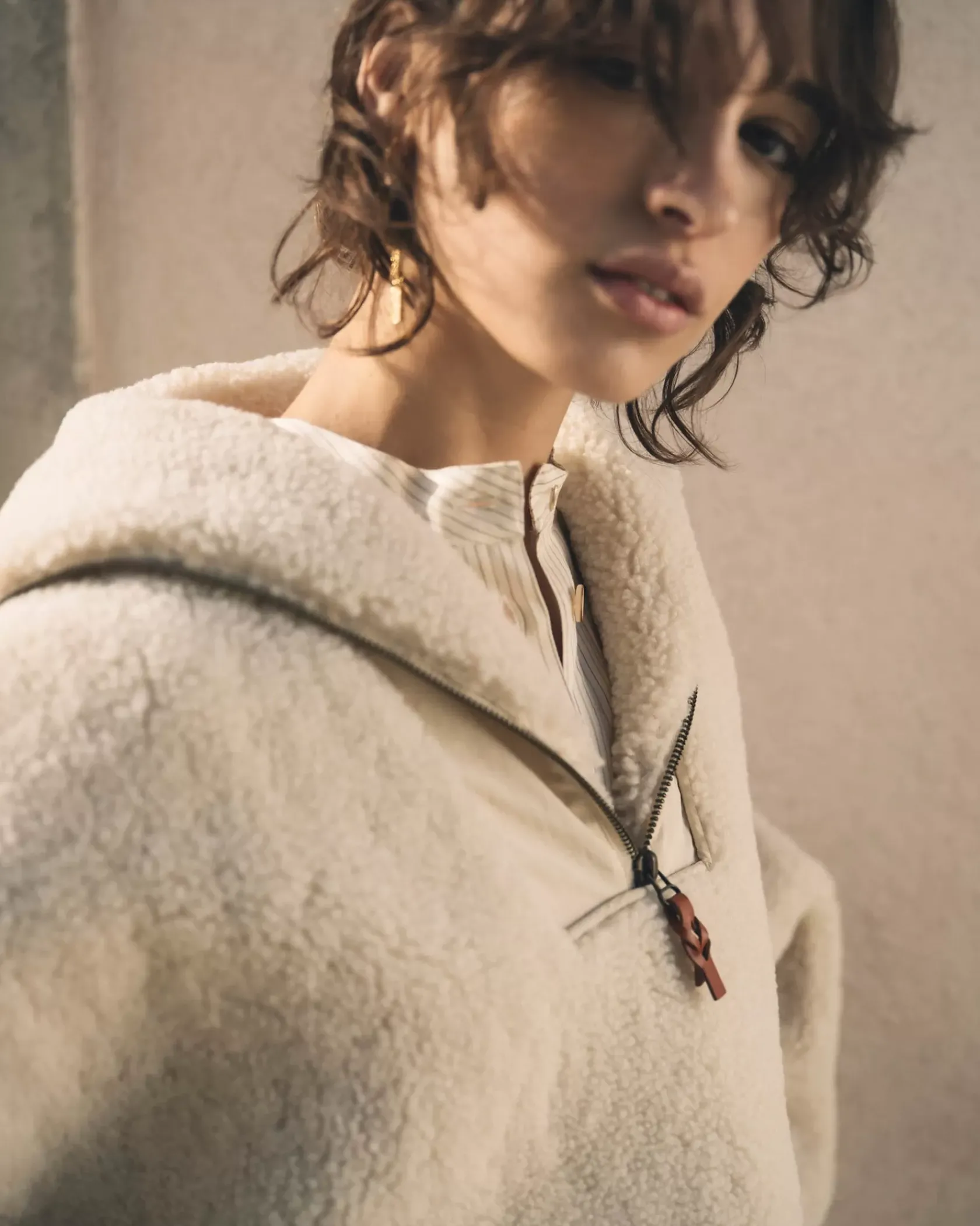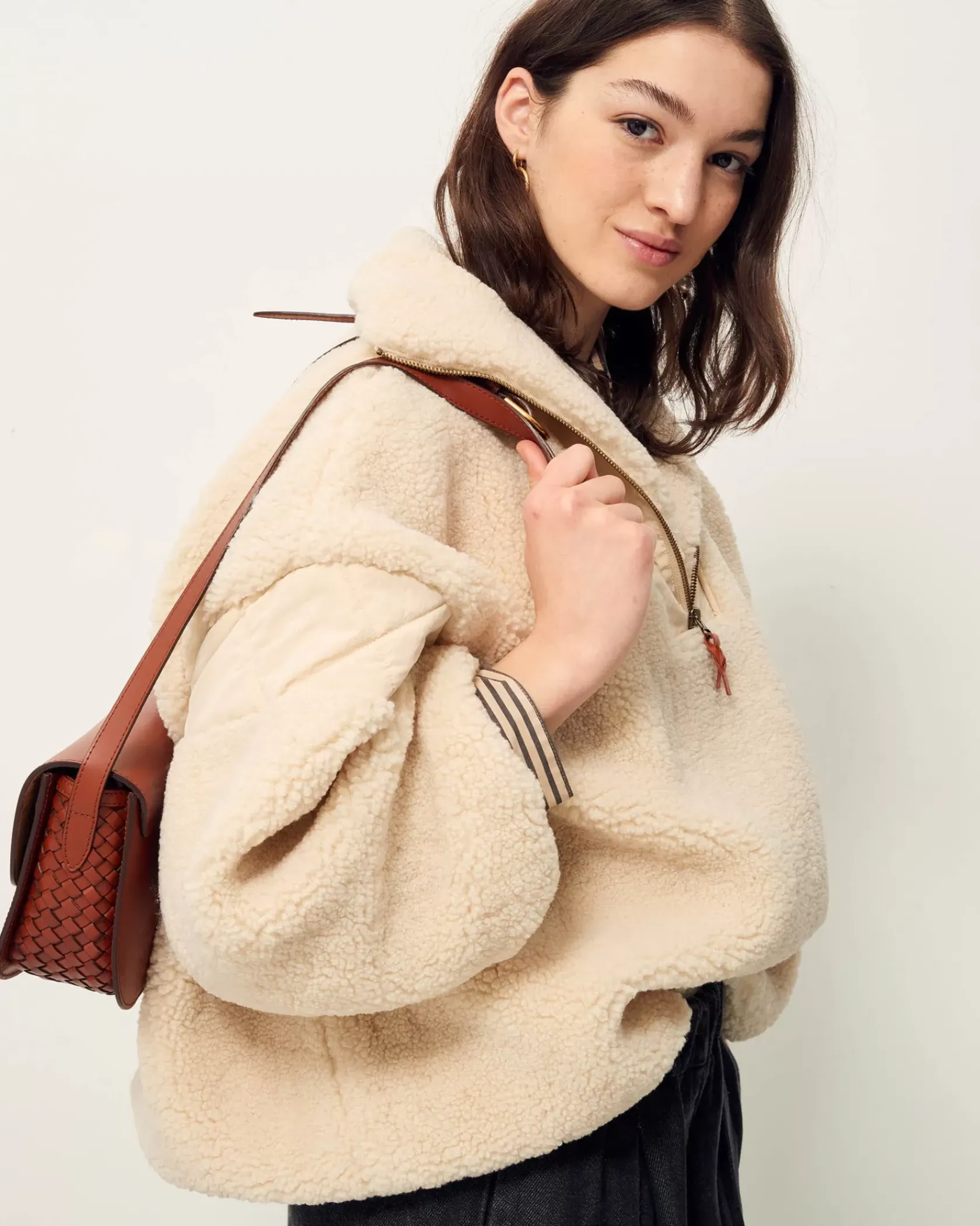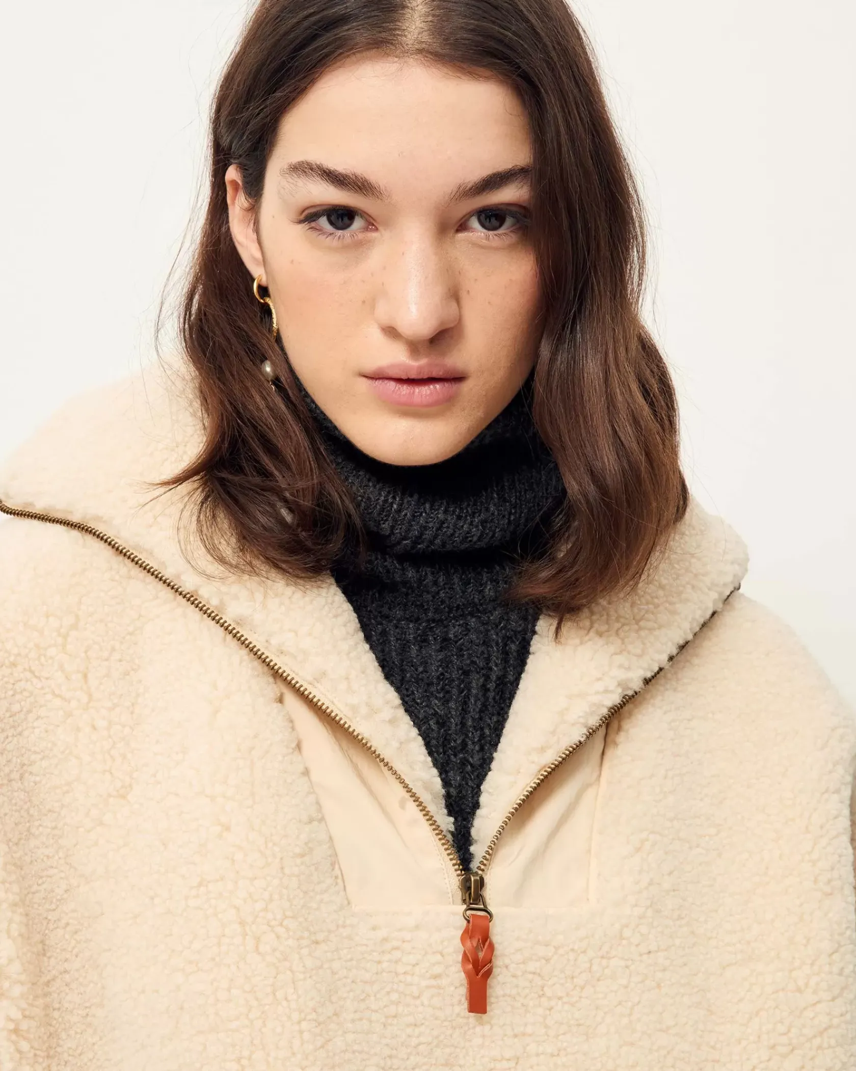 Sweat esprit vareuse à col zippé en tissage de fils bouclés façon fausse fourrure de mouton avec empiècements en nylon matelassé.